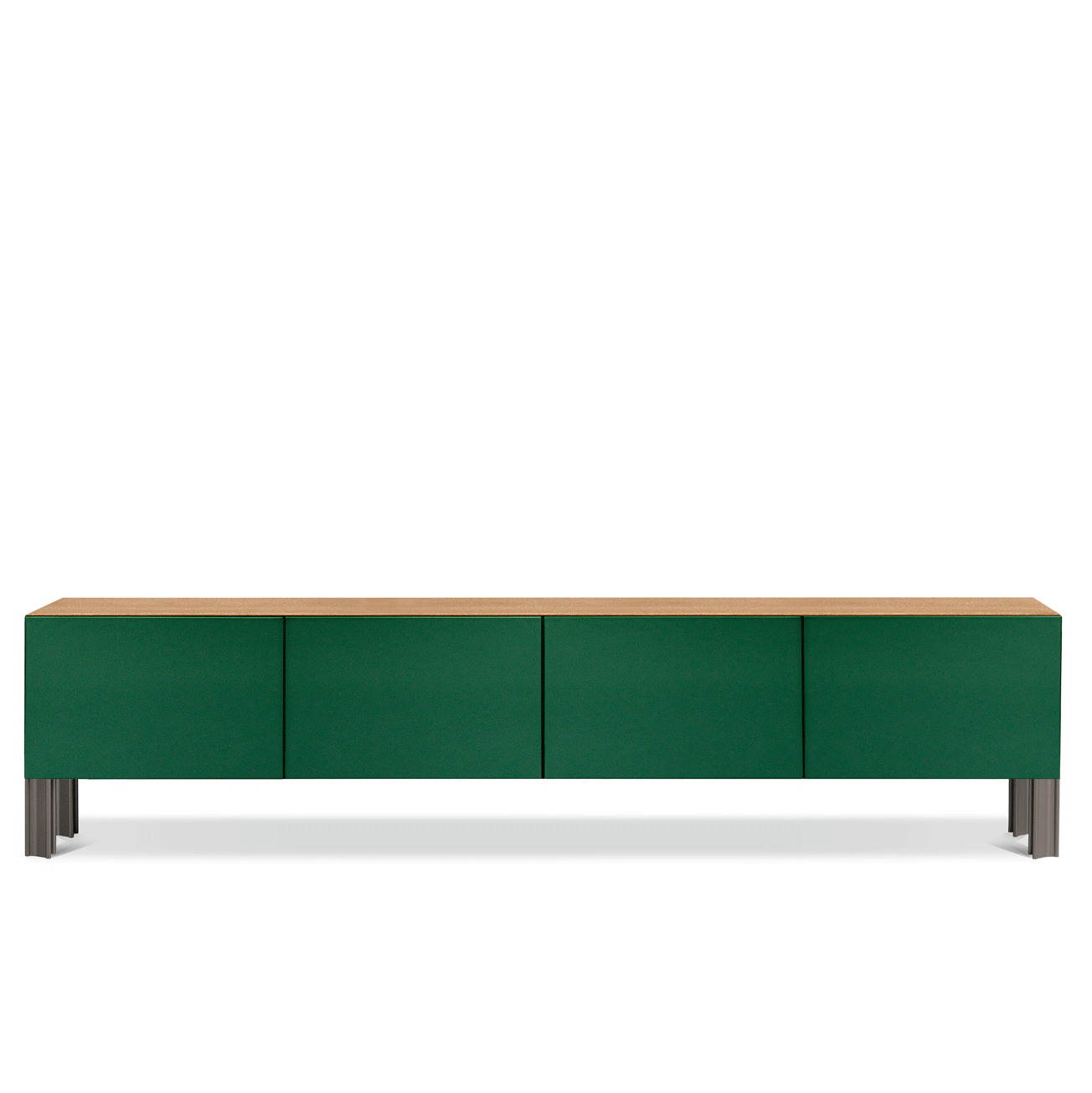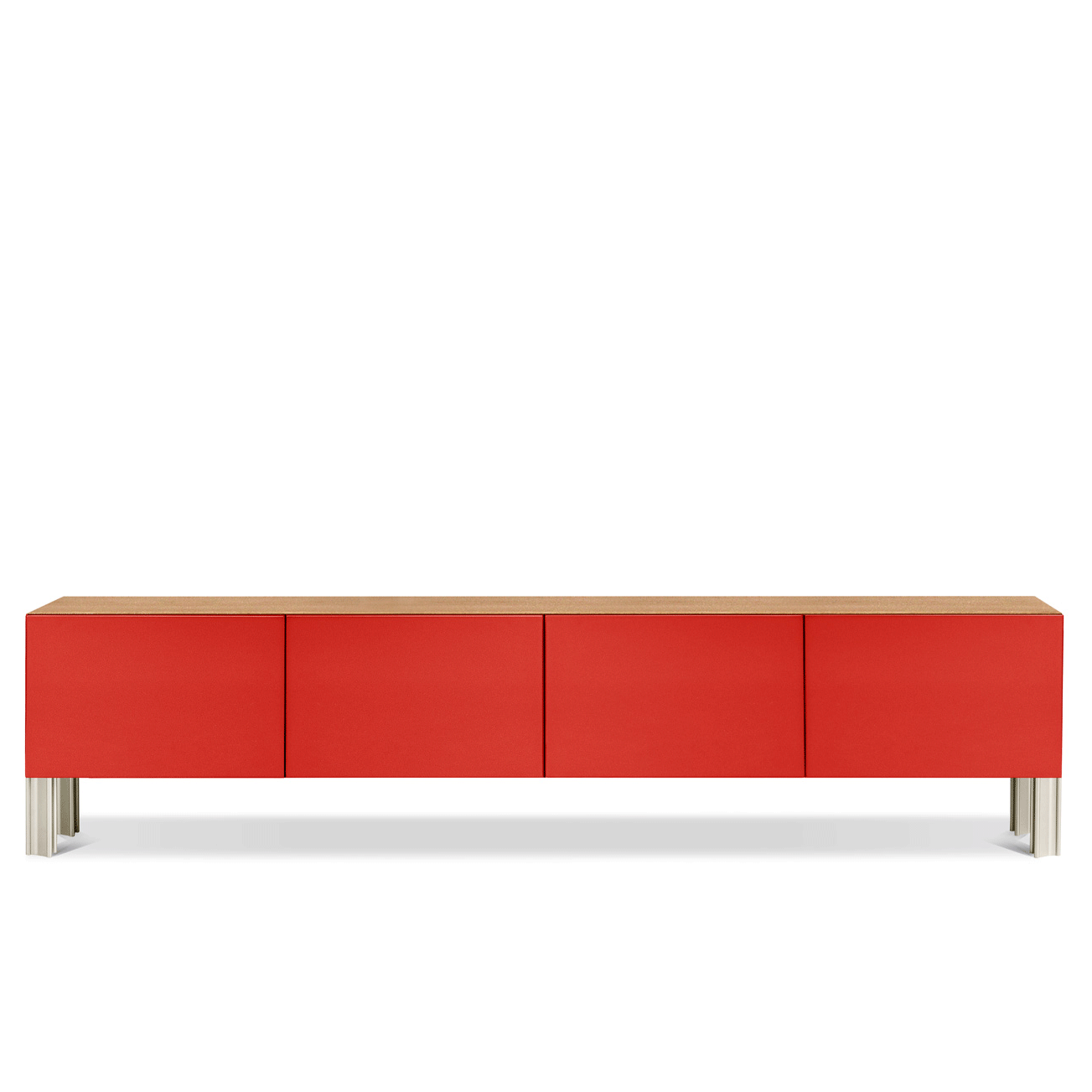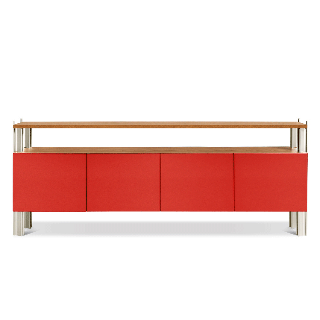 The Flexor Cabinets are a couple of sleek, versatile and functional storage units, made of an aluminum extrusion structure supporting some wood veneered containers. The strong metal elements both connect and support the various wooden containers.