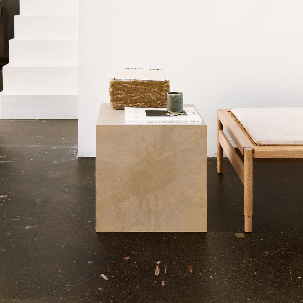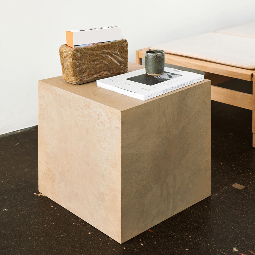 The Mater Cube is made of Matek®, an innovative circular waste material made with coffee shell waste or wood waste mixed with industrial plastic waste from GROHE, with an inner frame of FSC® certified wood. The Mater Cube is a multifunctional object that can be used as a side table, stool or as a plinth for plants or sculptures.