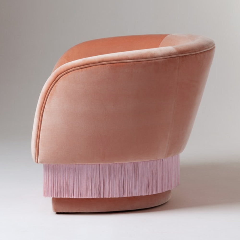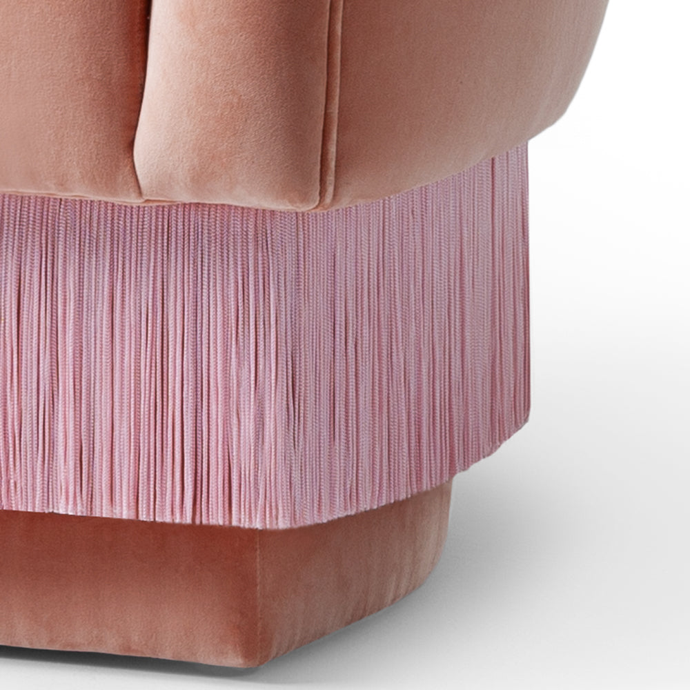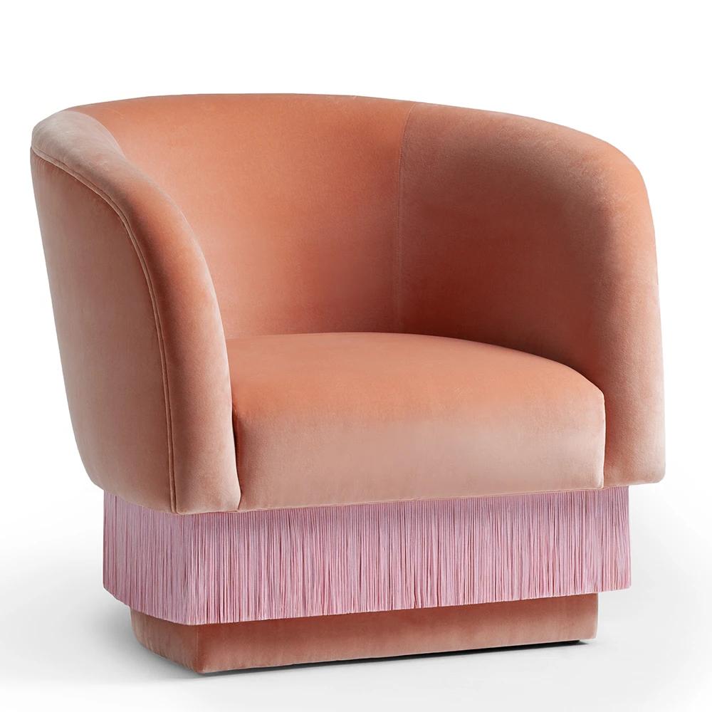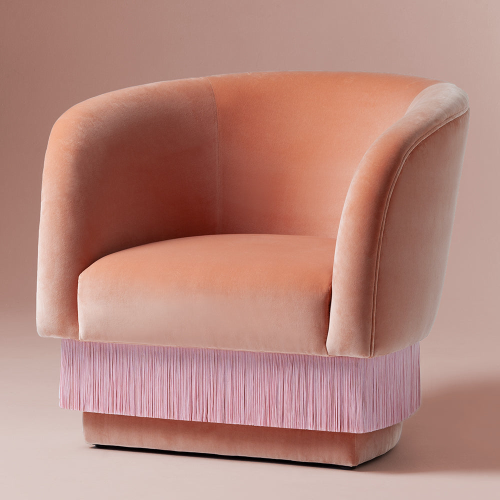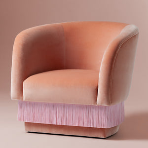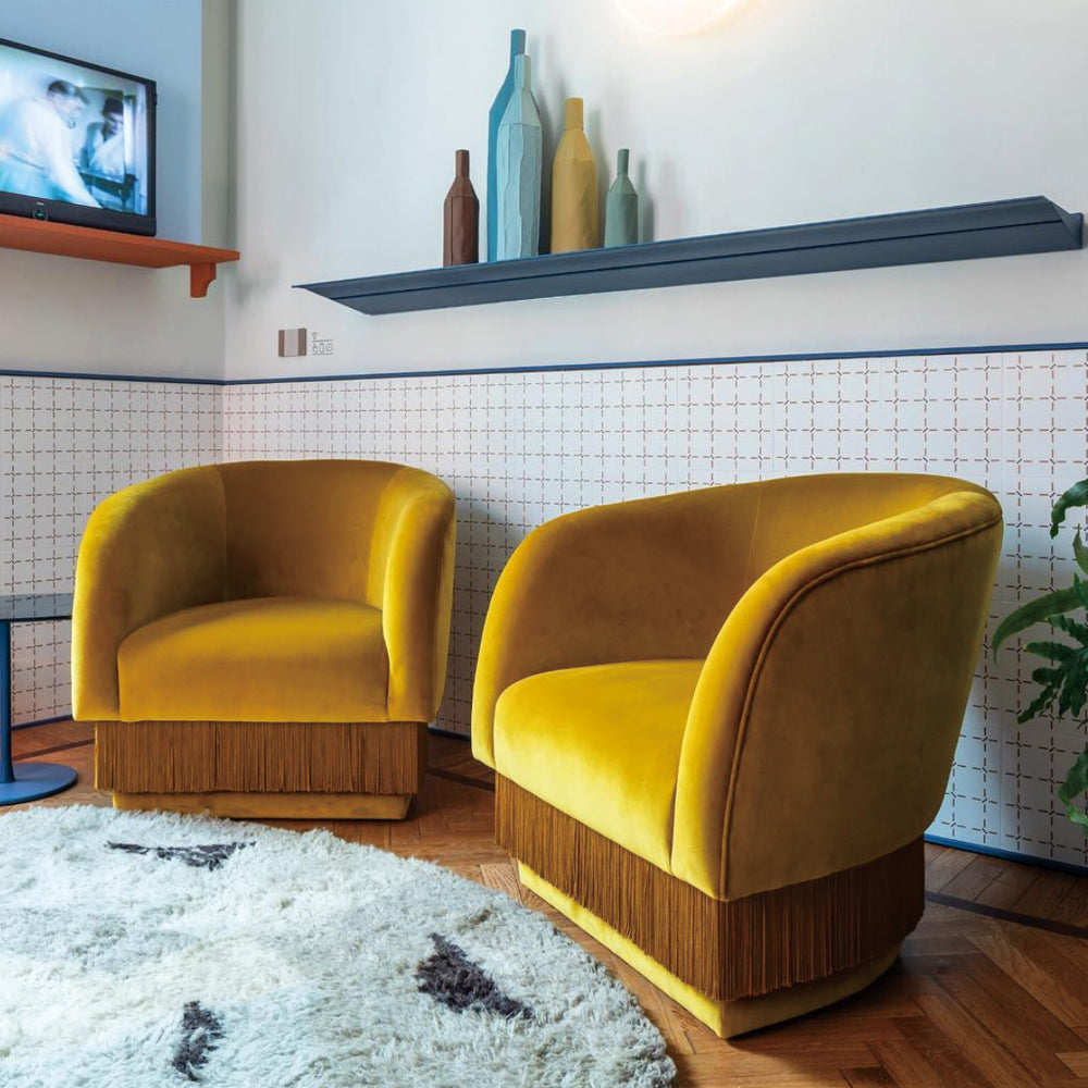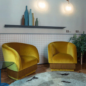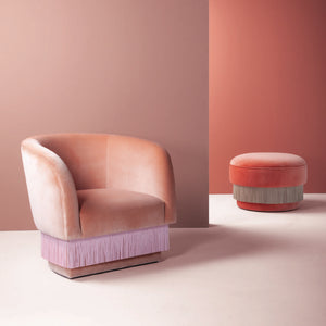 La Folie Armchair is a sensuous and elegant armchair: its voluptuous curves and playful fringes are inspired by the glamour of a burlesque show at the Moulin Rouge. La Folie Armchair and La Folie Pouf are the perfect complements.