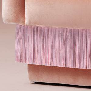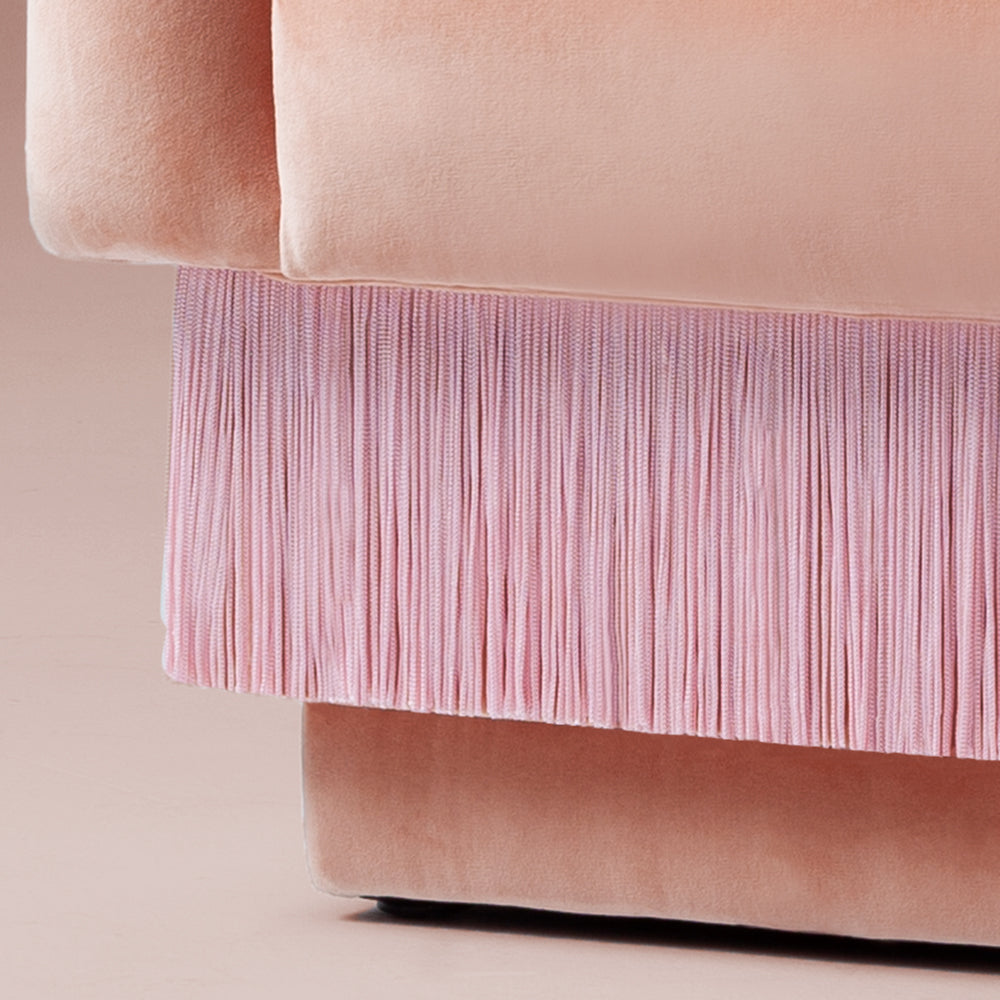 - First image: upholstery in Velvet Powder; piping in Velvet Powder; fringes in S70