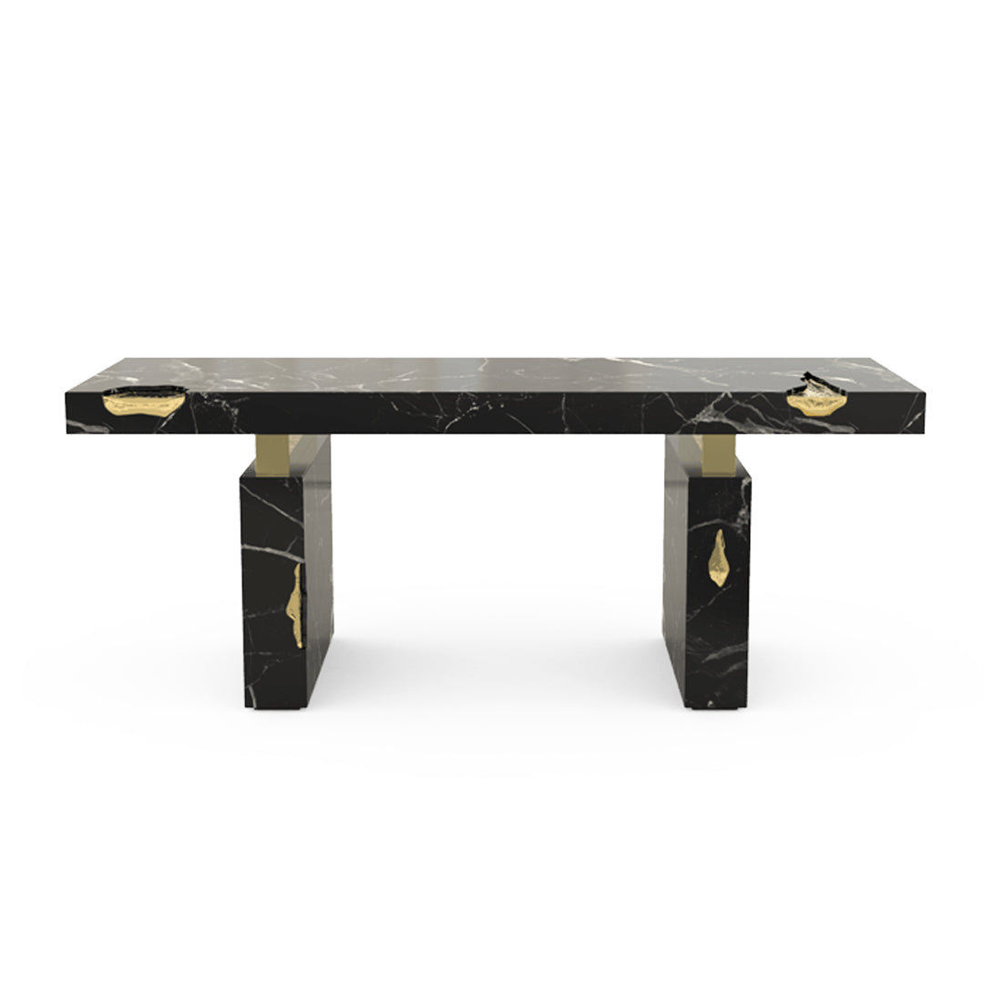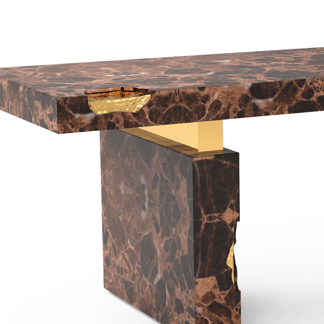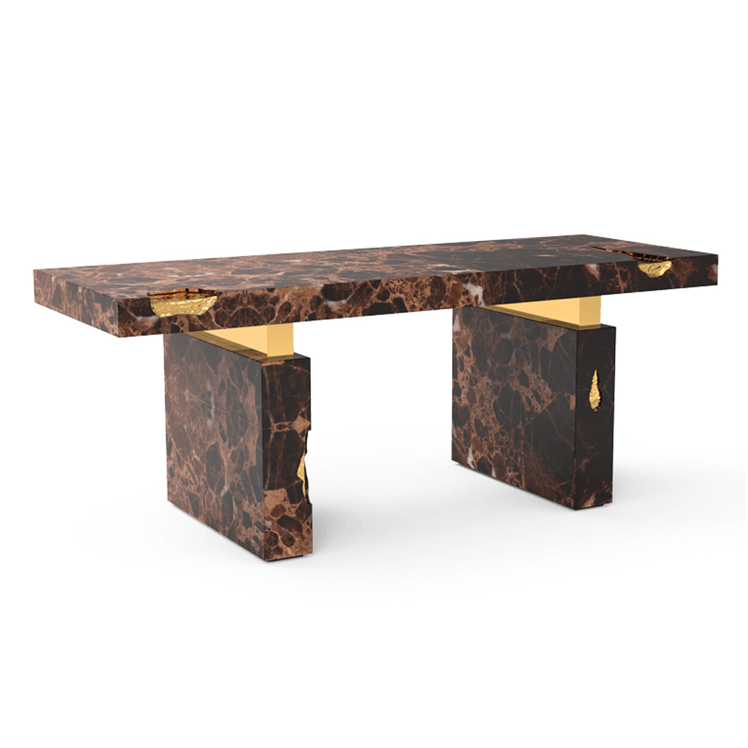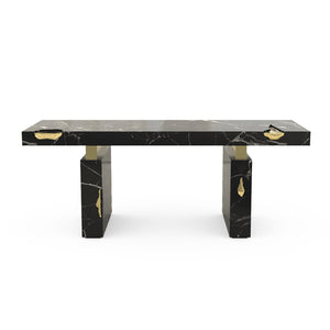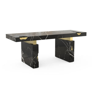 The Empire Desk is inspired by the rise and fall of empires, built by people who take momentous decisions around monumental tables. Just as success is built on the lessons from failures, the cracks in the table are lined in shiny brass to symbolise the silver linings which accompany tough times. The glossy surface of the rest of the table points to a shiny future, full of success and glory. The Empire Desk is composed of a rectangular marble top and two rectangular marble legs with polished brass gold details.