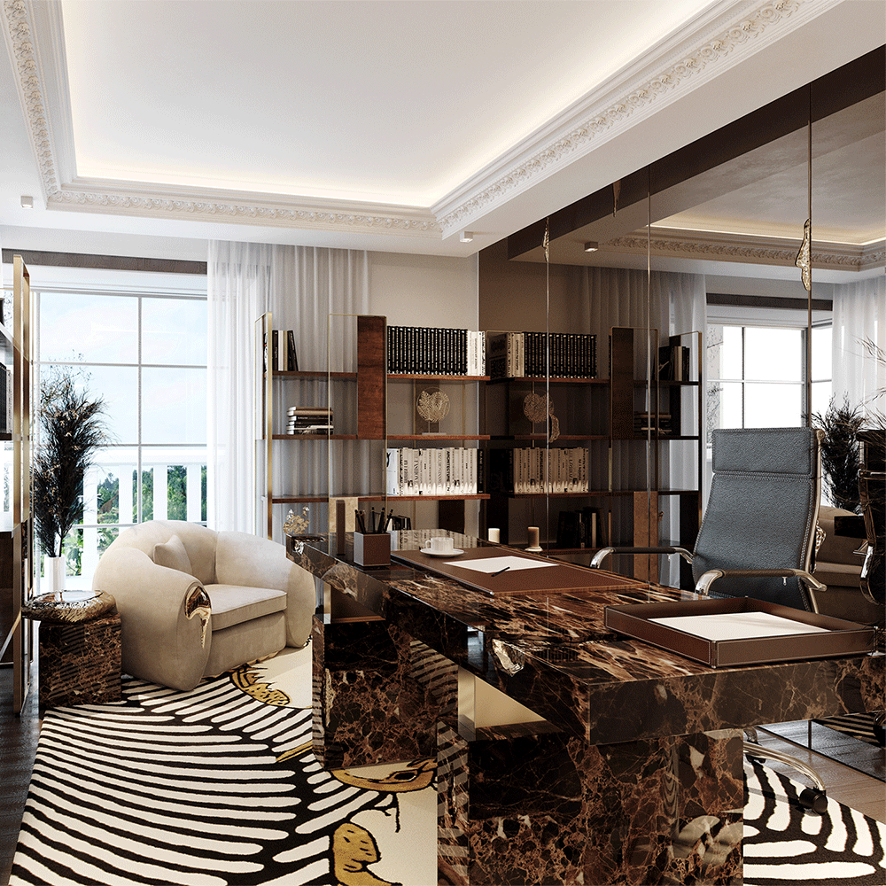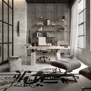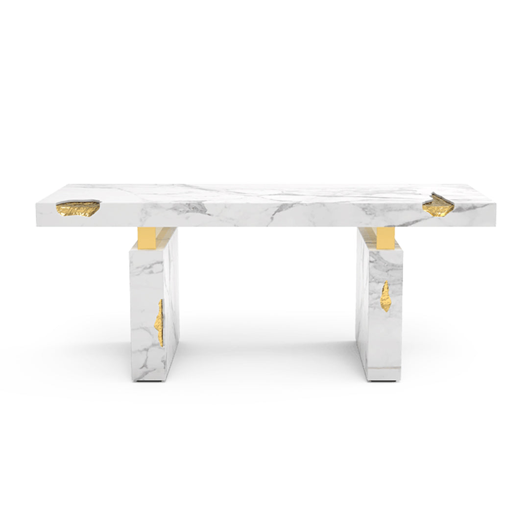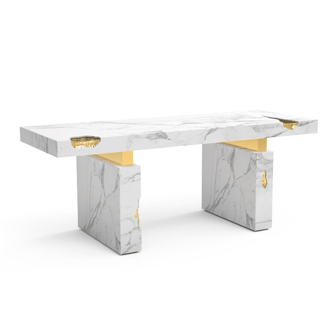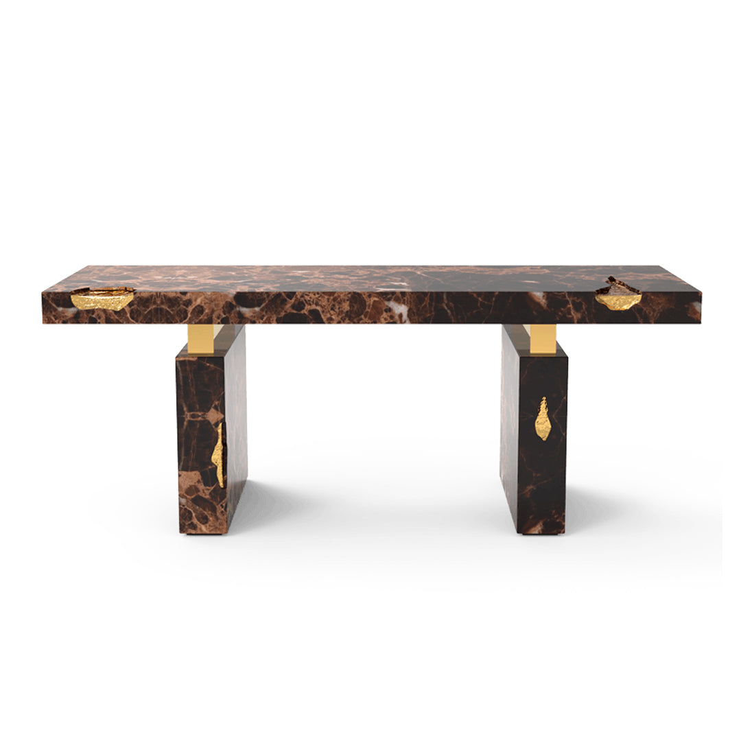 The Empire Desk is inspired by the rise and fall of empires, built by people who take momentous decisions around monumental tables. Just as success is built on the lessons from failures, the cracks in the table are lined in shiny brass to symbolise the silver linings which accompany tough times. The glossy surface of the rest of the table points to a shiny future, full of success and glory. The Empire Desk is composed of a rectangular marble top and two rectangular marble legs with polished brass gold details.