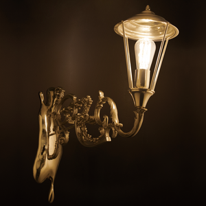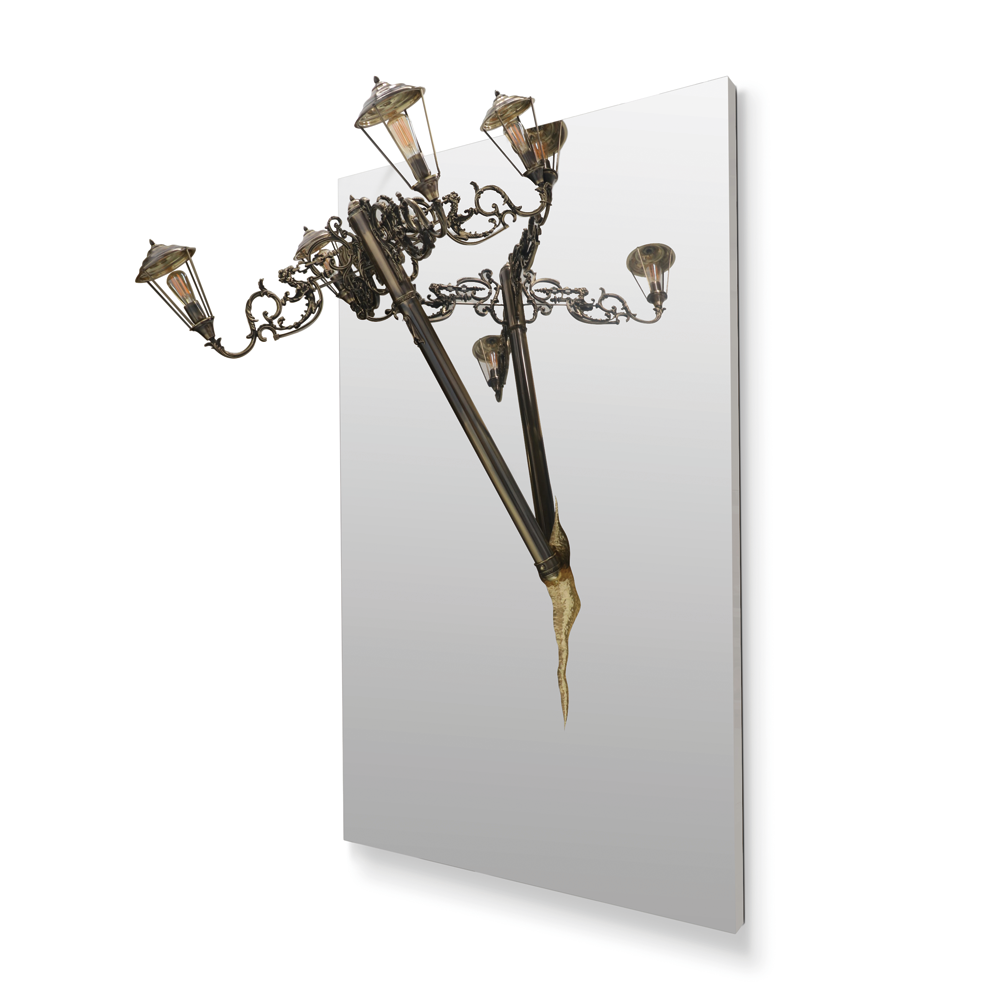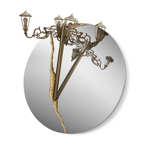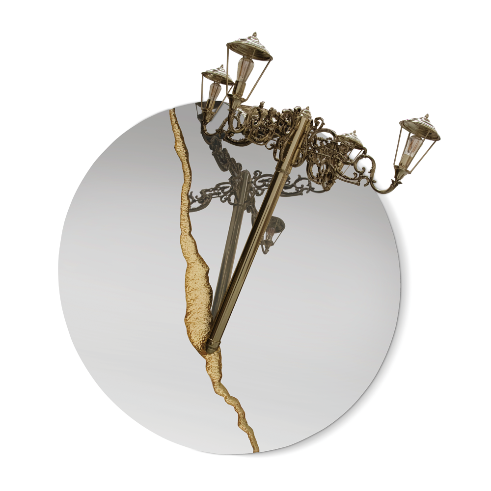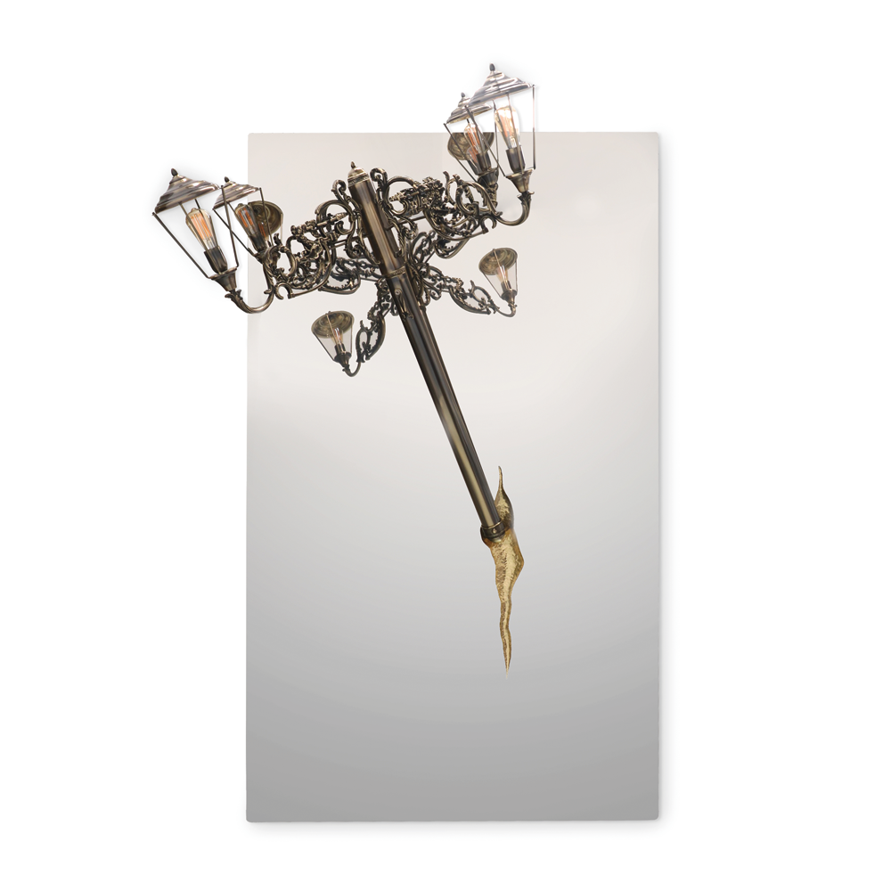 The Lumiere Collection is an extravagant series of lights and mirrors inspired by the Victorian era, where industrial details collide with excessive ornamentation. The wall lights look as if they had burst out of the wall, leaving a golden crack in the mirror, whilst the suspension light resembles a broken street lamp being craned away.