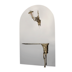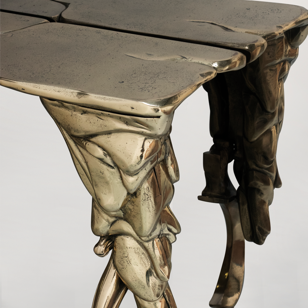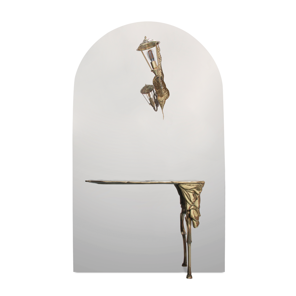 Materials: glass, stainless steel, gold plated brass, casted brass, wood; glass and mirror; the console includes pads on the base to protect the support area