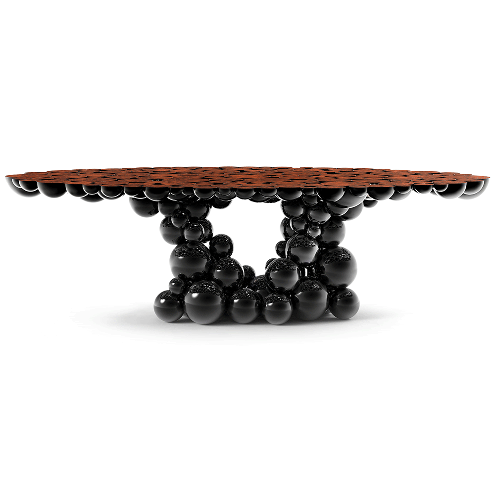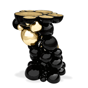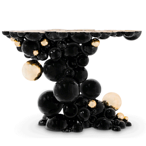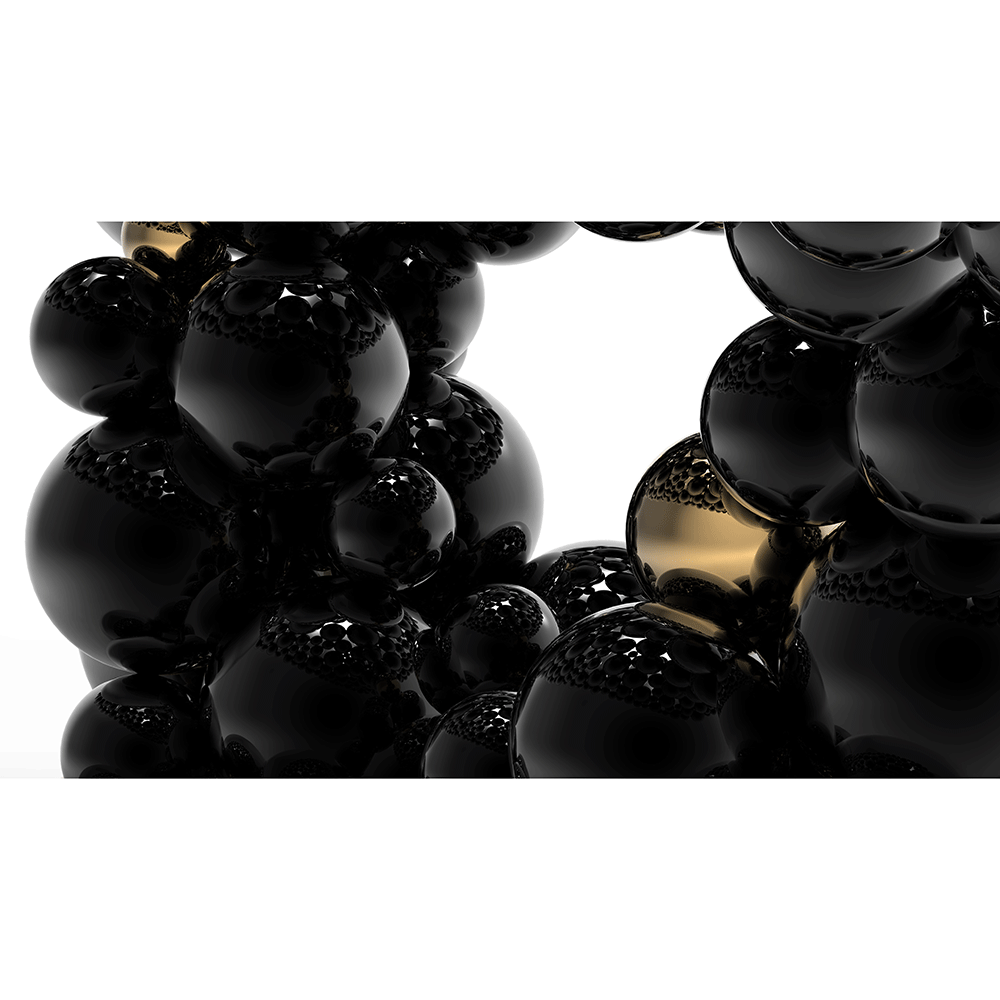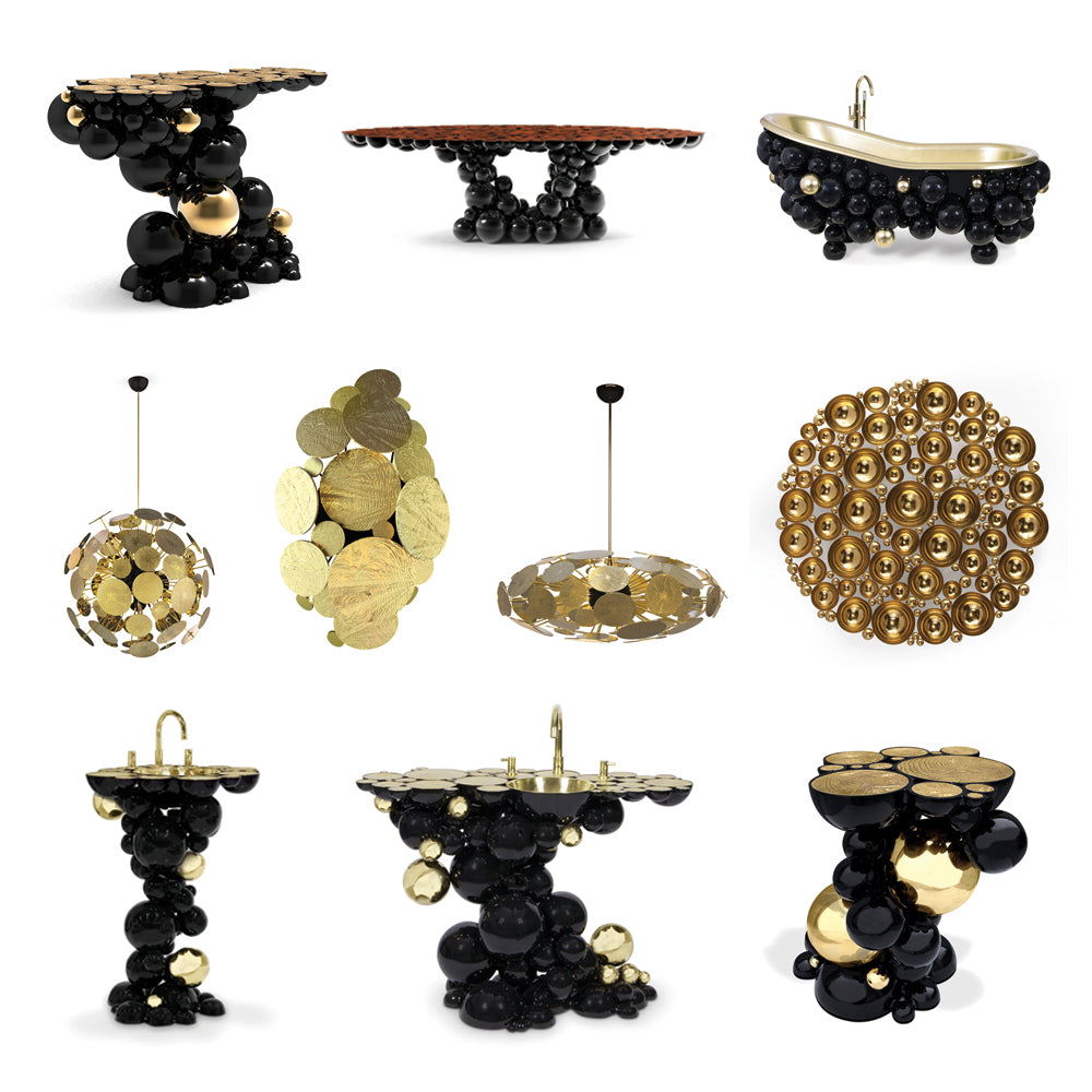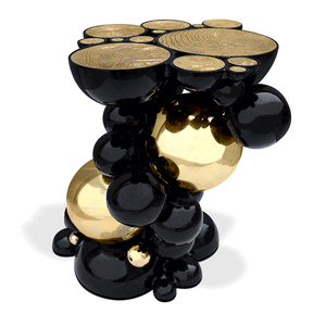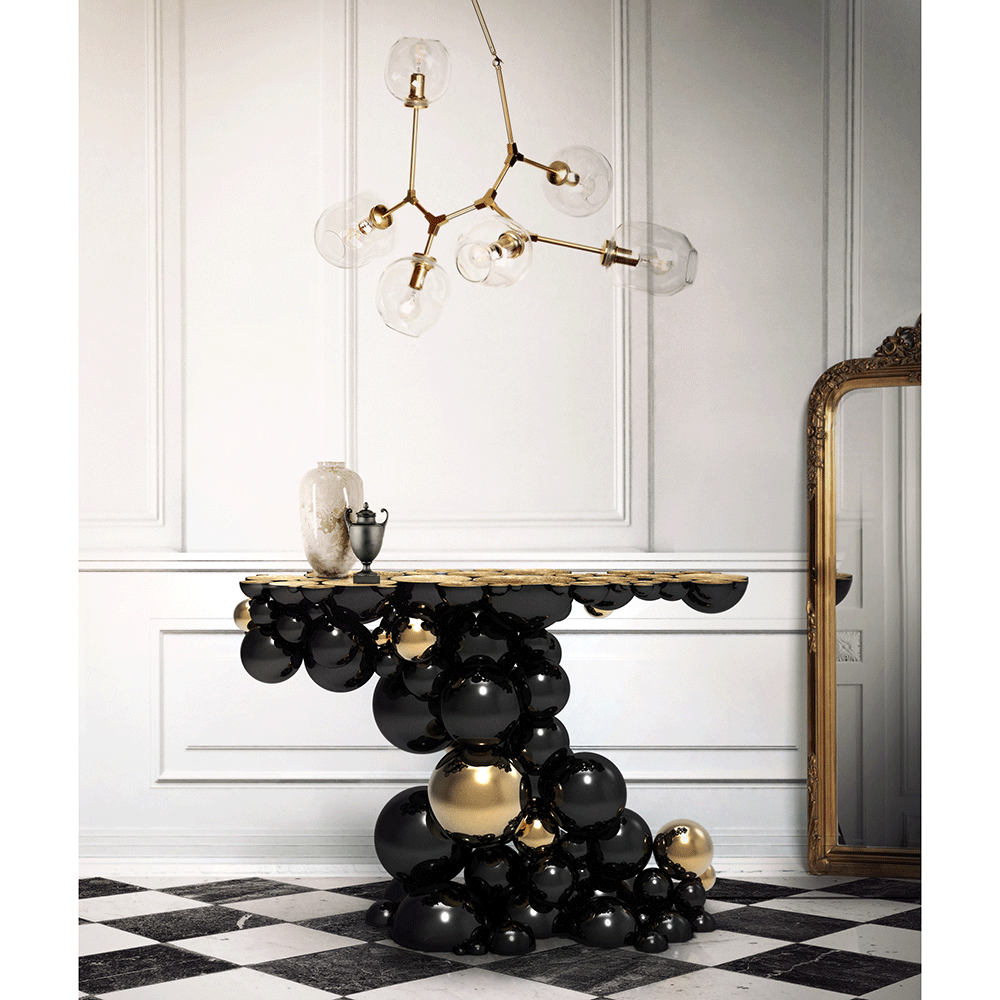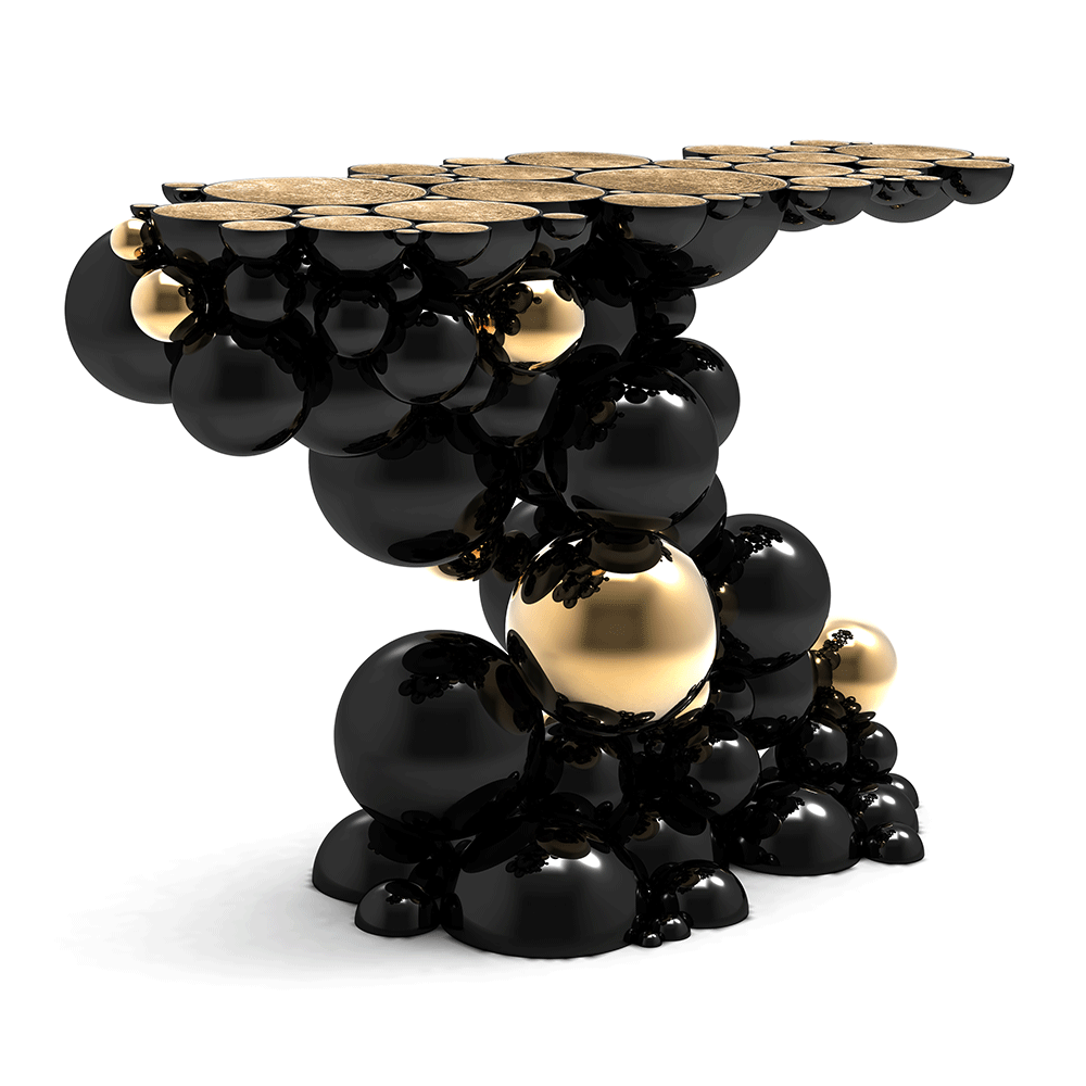 The Newton Collection is an extraordinary ensemble of tables, lights and mirrors made of hand crafted brass spheres which have been lacquered in black, gold and other finishes. The design resembles an explosion of bubbles or a cluster of atoms.
