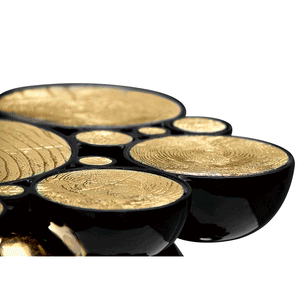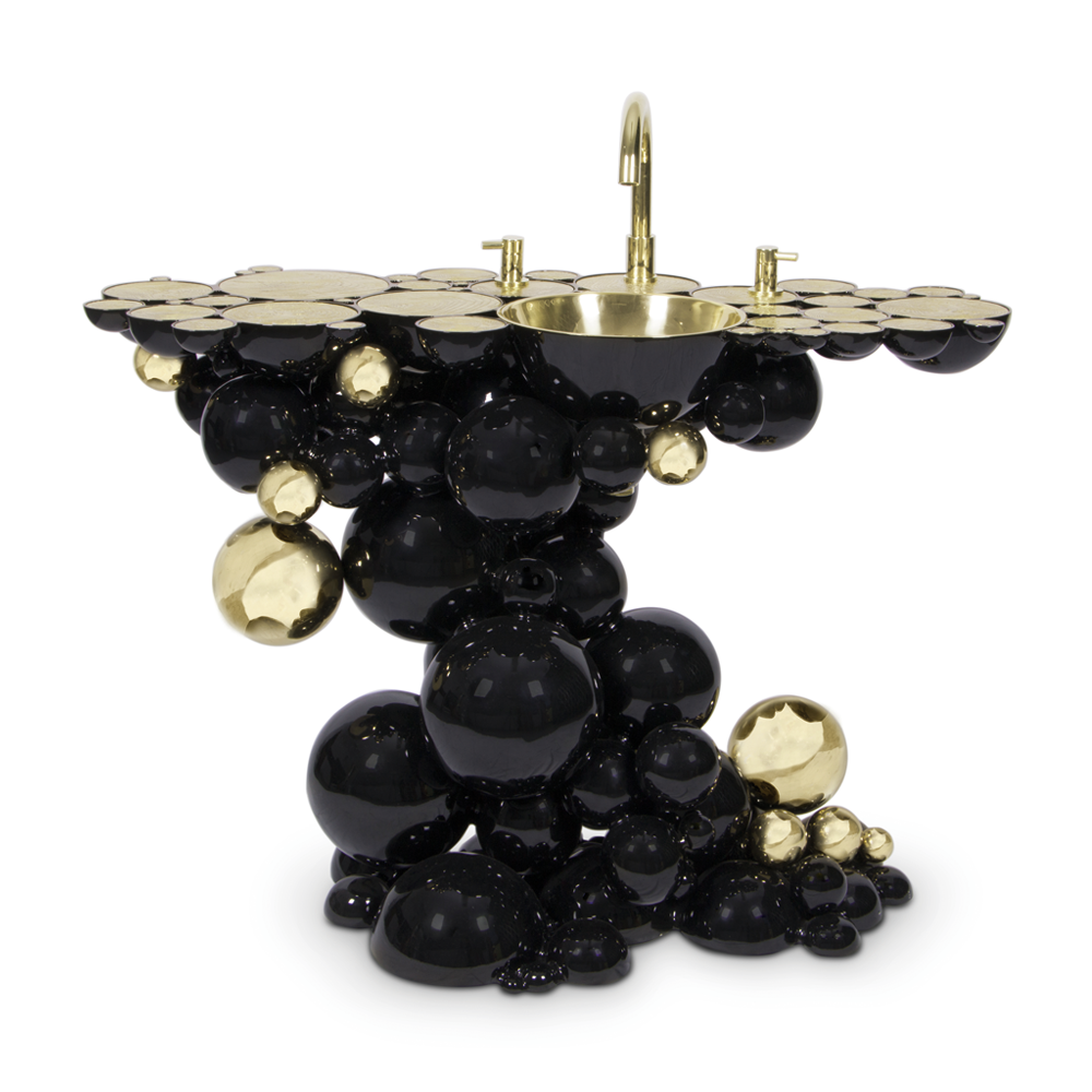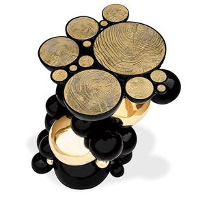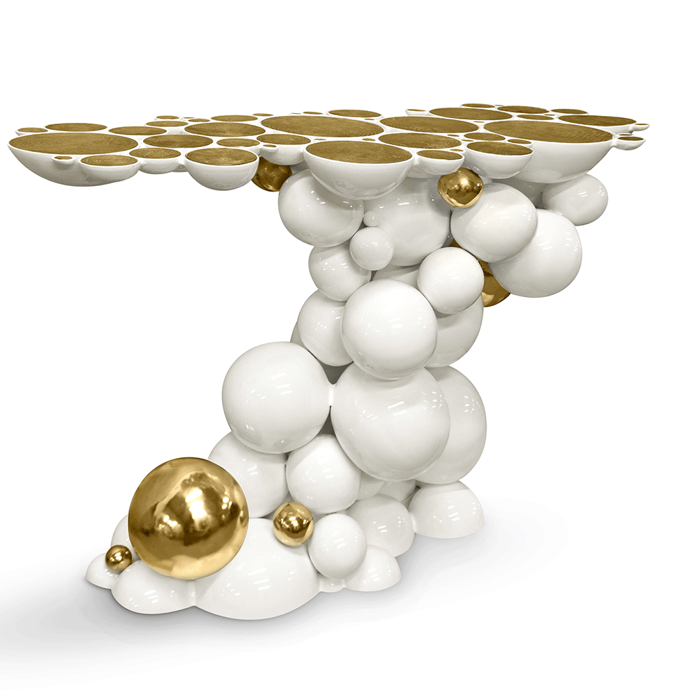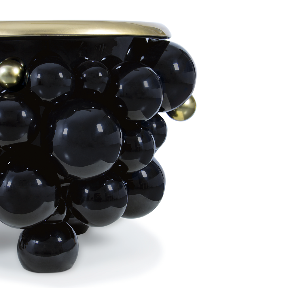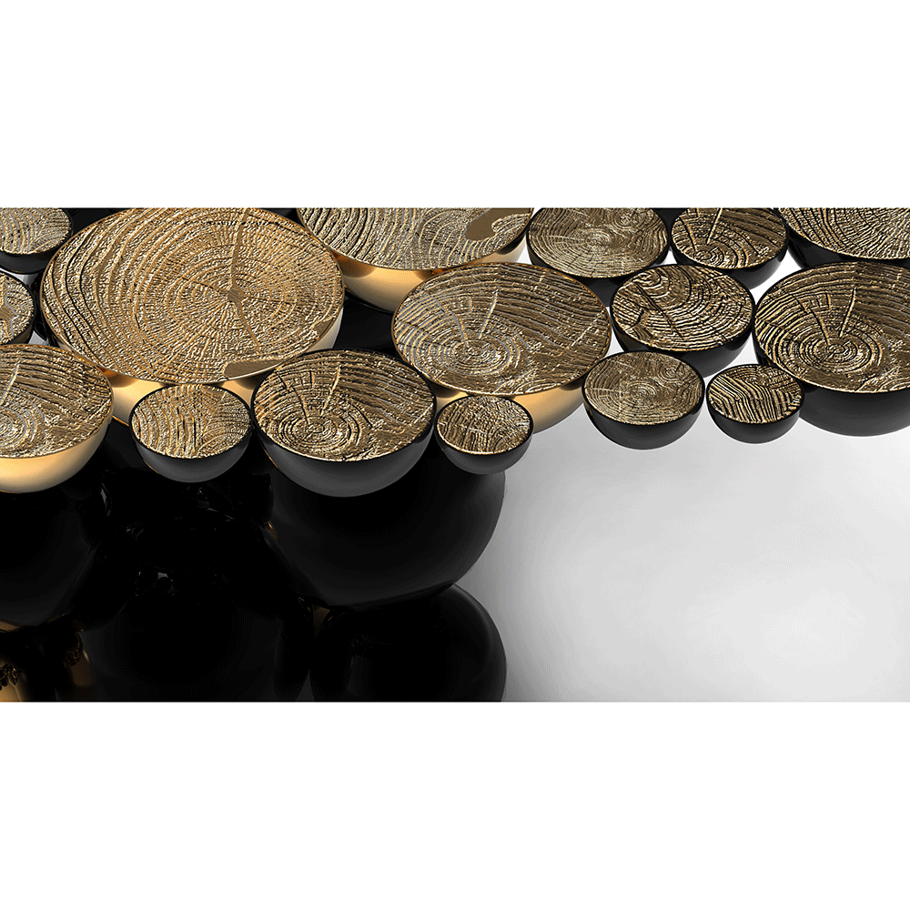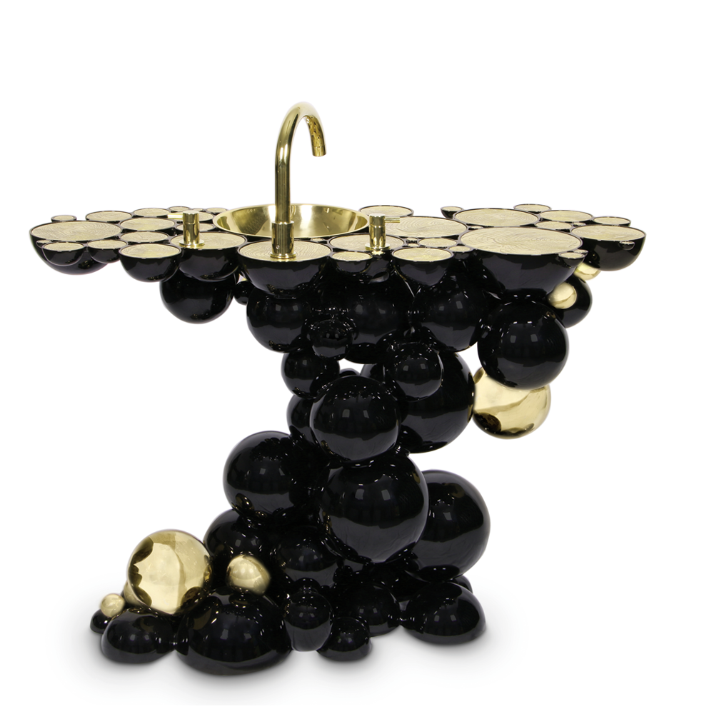 The Newton Collection is an extraordinary ensemble of tables, lights and mirrors made of hand crafted brass spheres which have been lacquered in black, gold and other finishes. The design resembles an explosion of bubbles or a cluster of atoms.