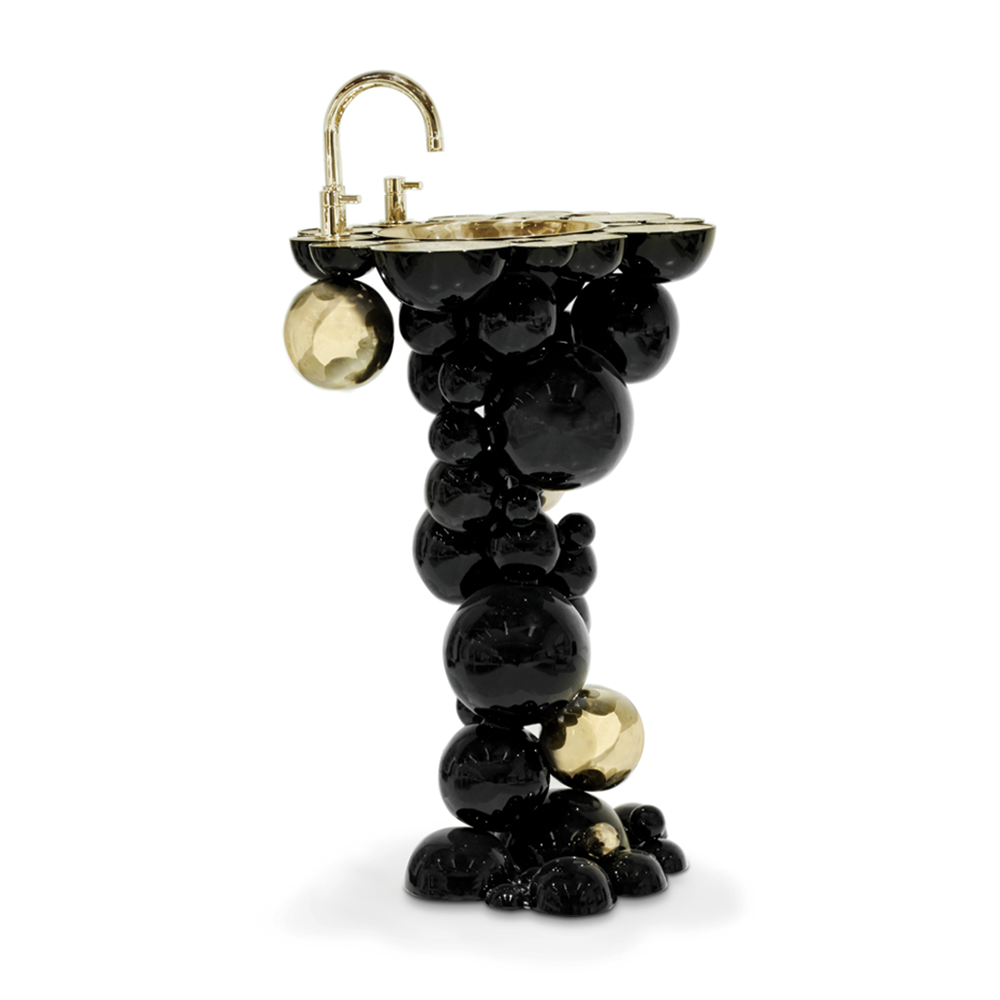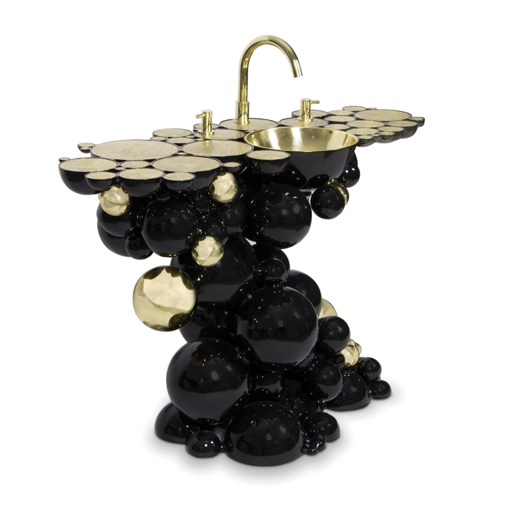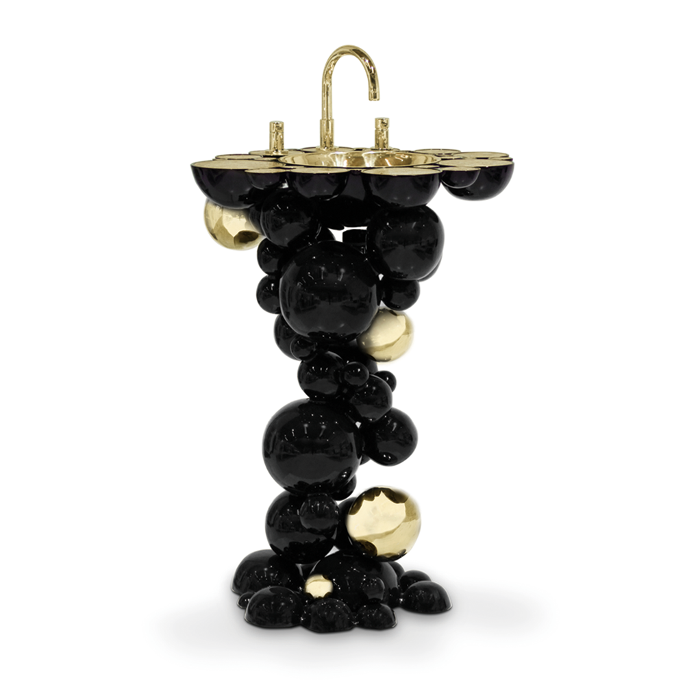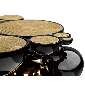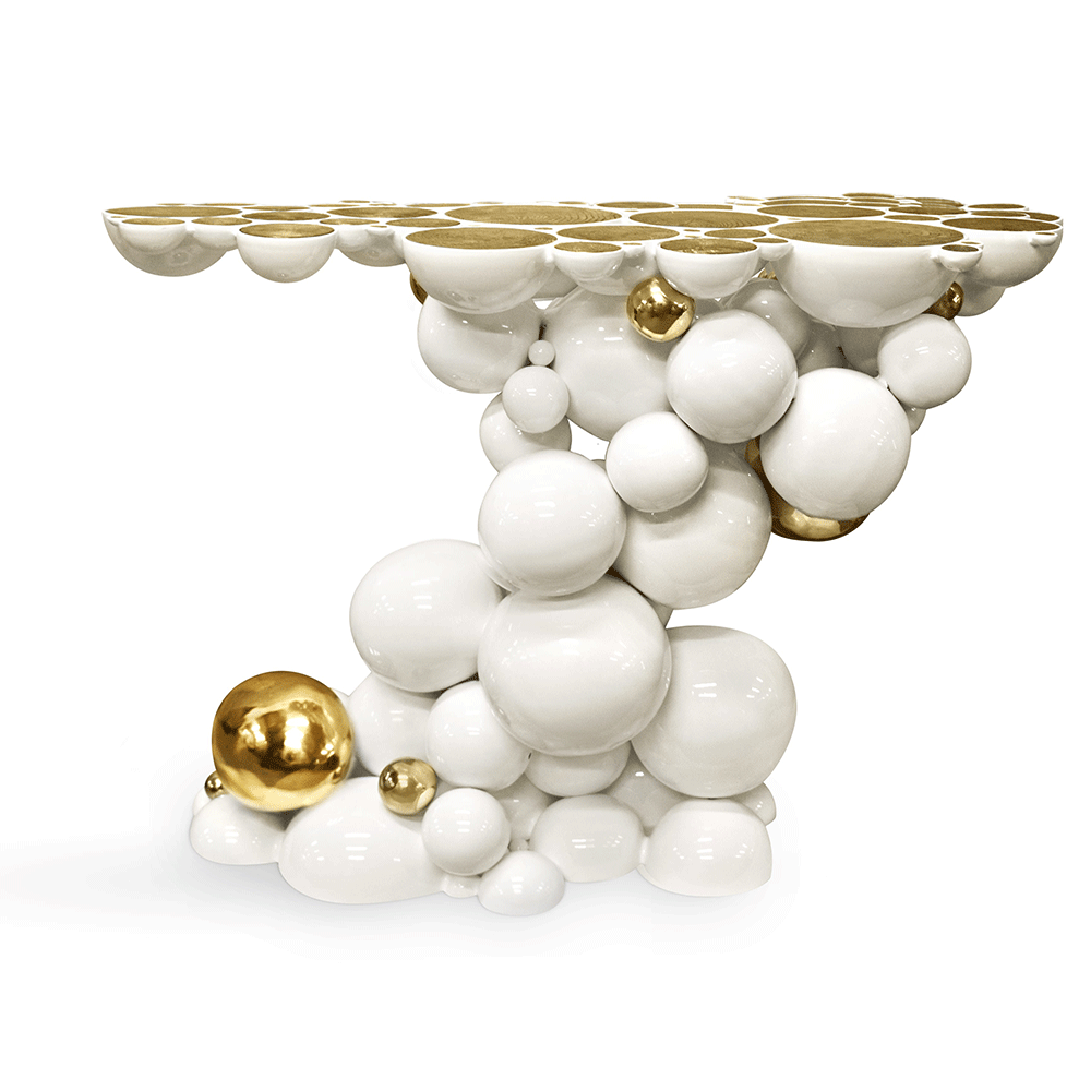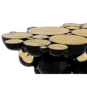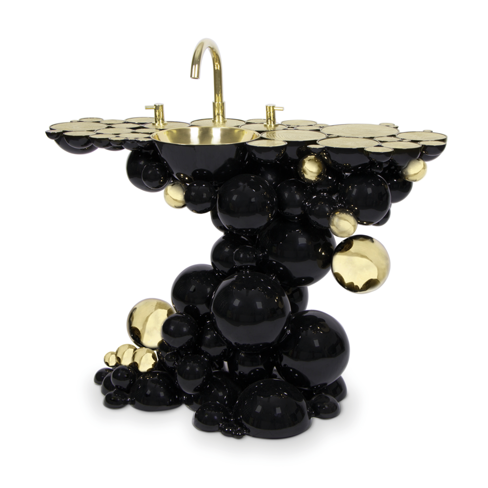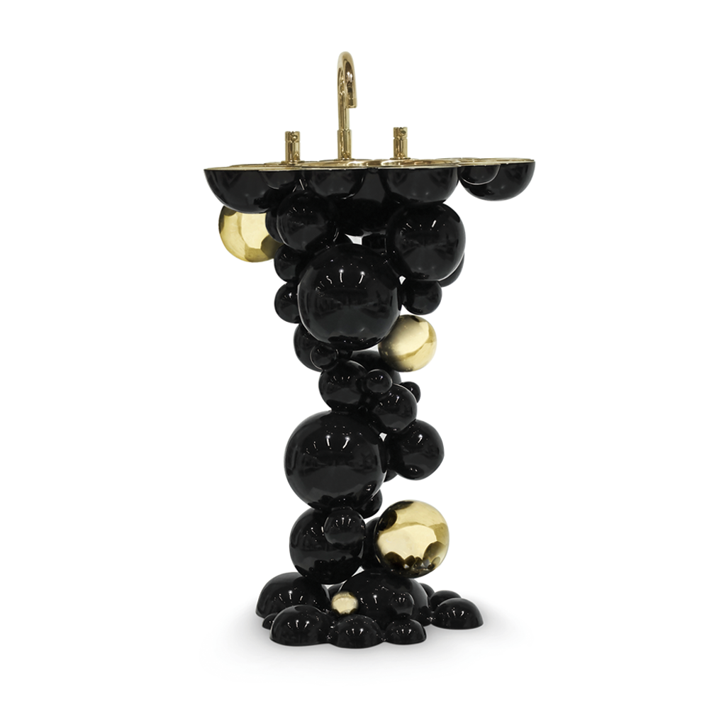 The Newton Collection is an extraordinary ensemble of tables, lights and mirrors made of hand crafted brass spheres which have been lacquered in black, gold and other finishes. The design resembles an explosion of bubbles or a cluster of atoms.
