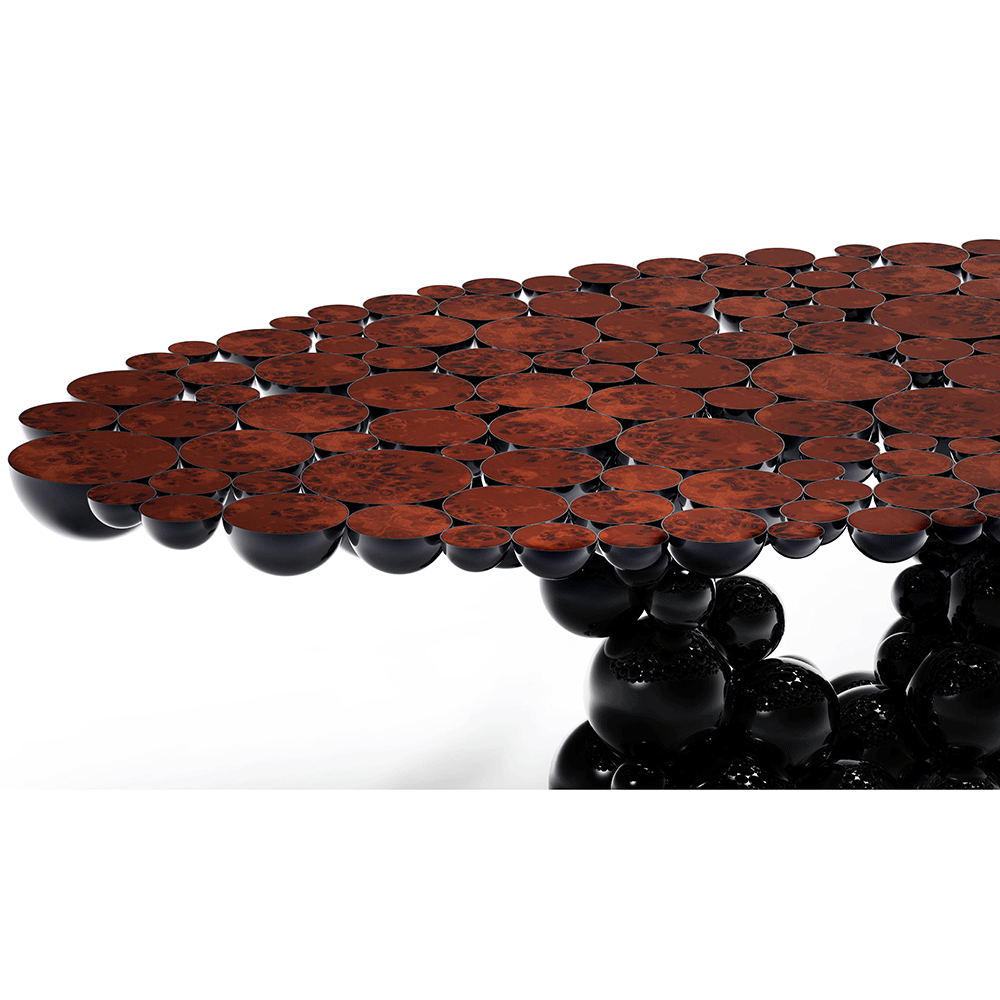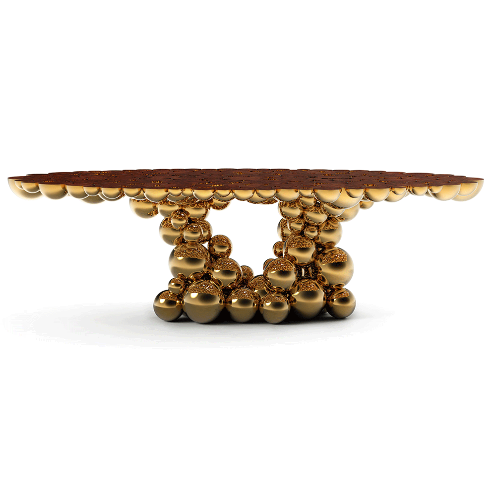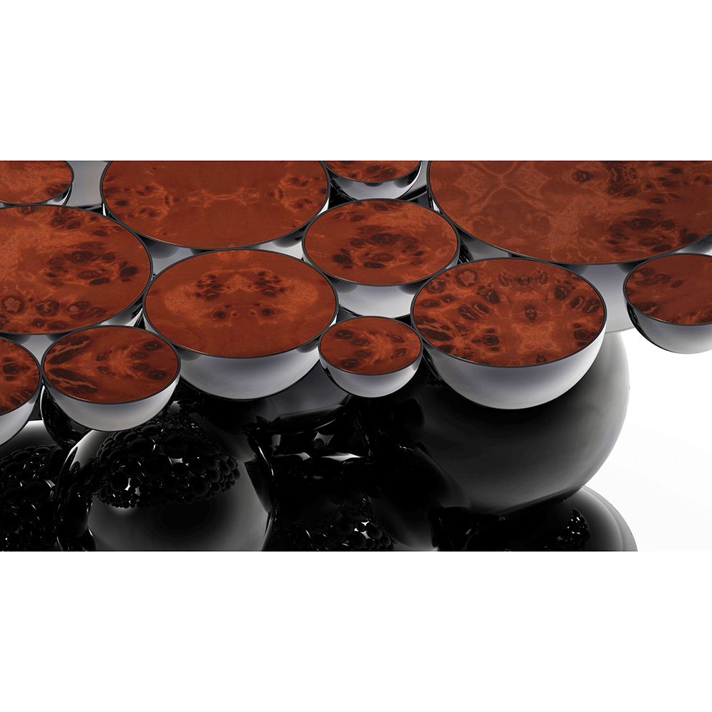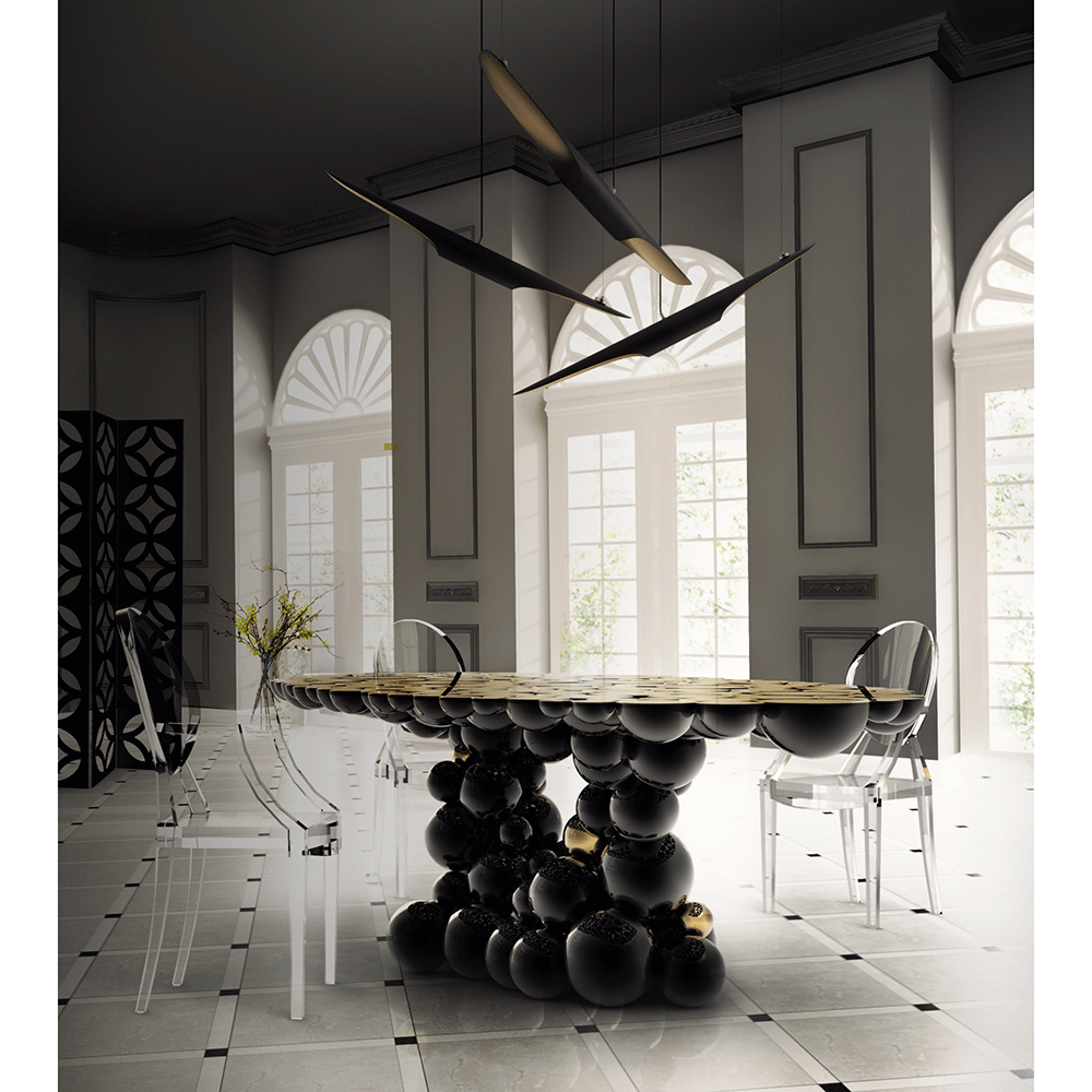 Materials: aluminium, black lacquered and gold plated; high gloss black lacquer and gold plated metallic spheres with gold plated brass surface with wood texture; pads on the base to protect the support area; for the dining table with wooden top: top made with myrtle burl veneer, finished with a high gloss varnish