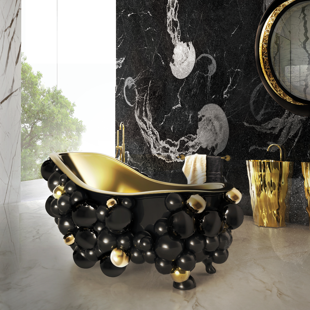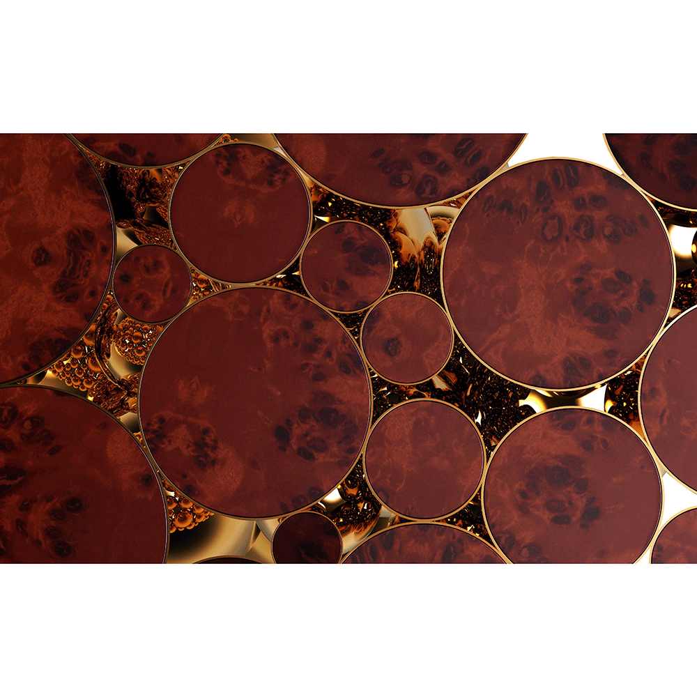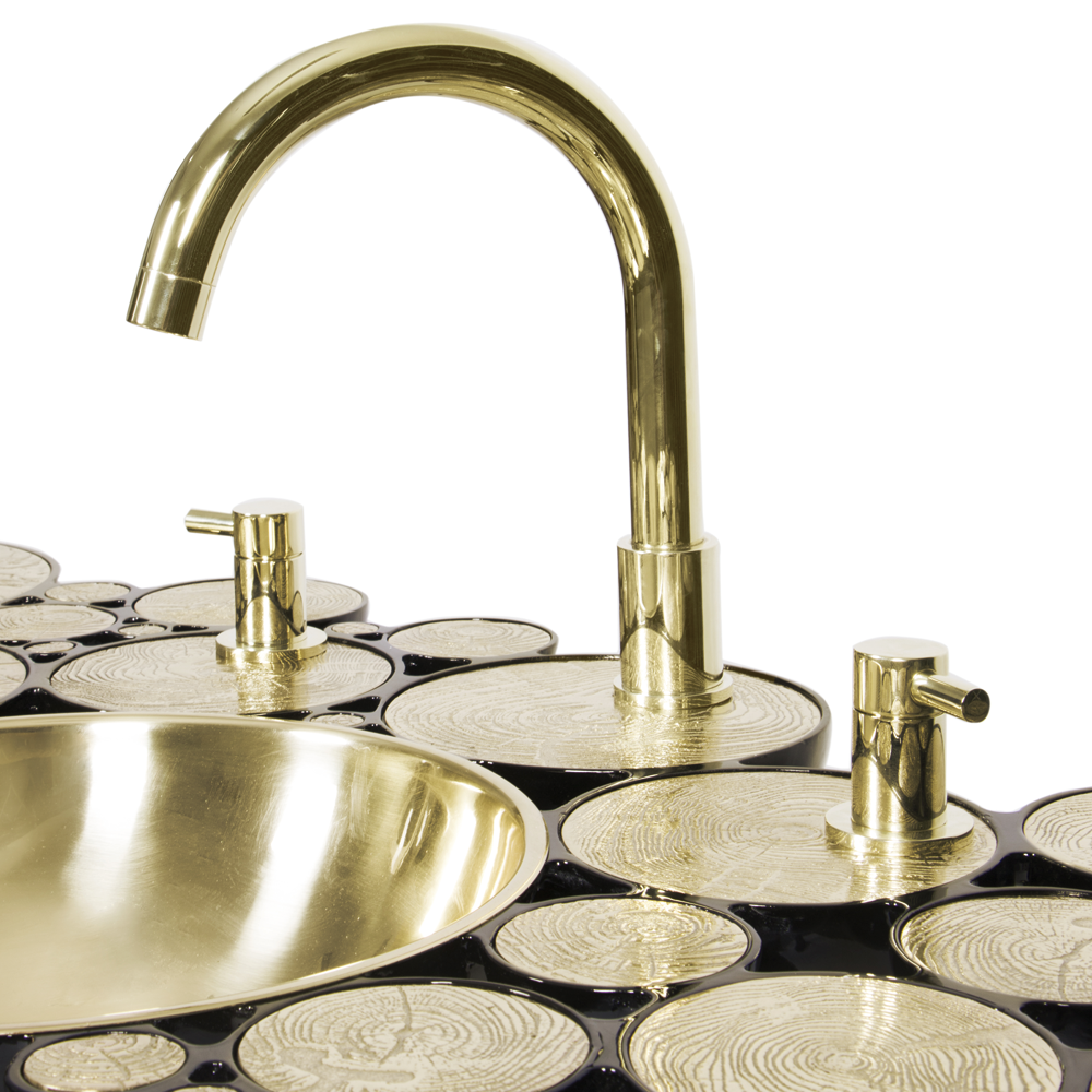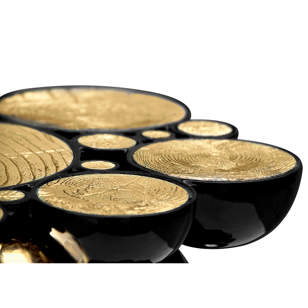 Materials: aluminium, black lacquered and gold plated; high gloss black lacquer and gold plated metallic spheres with gold plated brass surface with wood texture; pads on the base to protect the support area; for the dining table with wooden top: top made with myrtle burl veneer, finished with a high gloss varnish