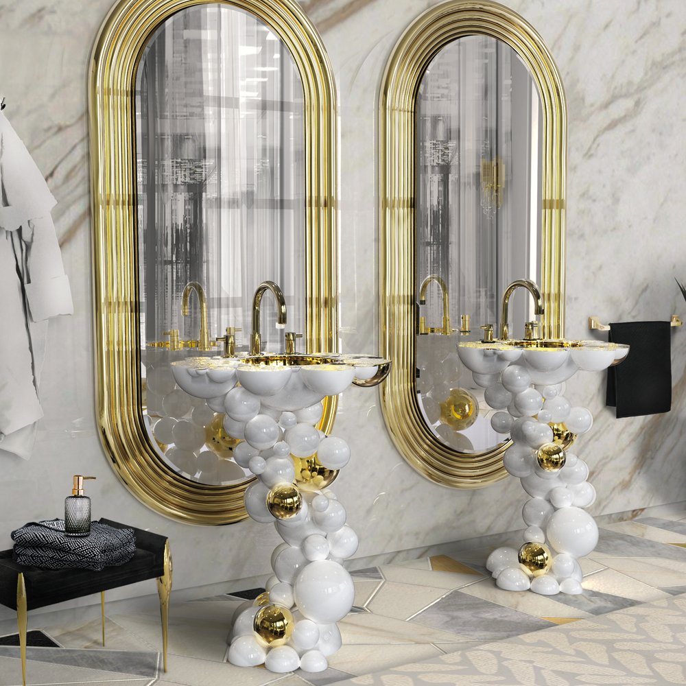 Bathtub, Console Table, Dining Table in 3 versions, Freestanding Sink, Mirror, Side Table, three Suspension Lights (Sphere, Elliptic and Chandelier), Wall Light and Washbasin