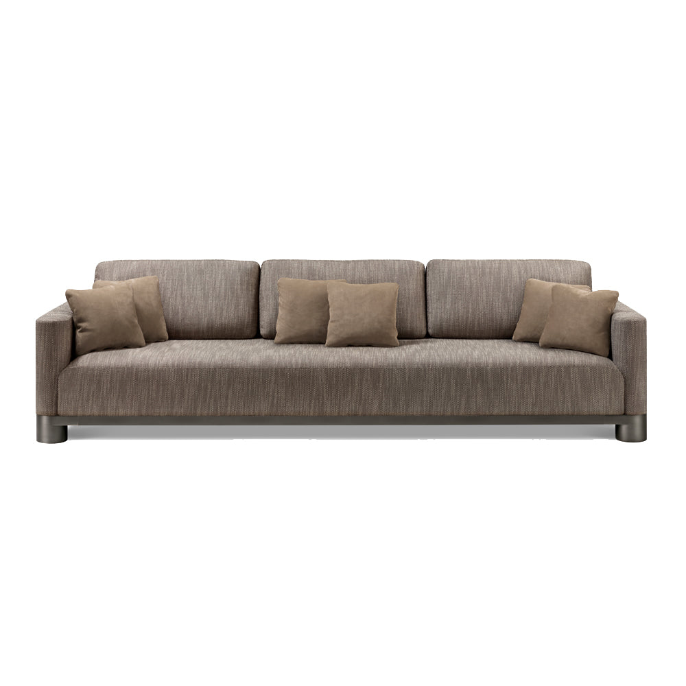 The Bold Sofa features a metal rim graphically encompassing the structure, which also has the effect of embellishing the luxurious materials, creating a sculptural and striking effect.
