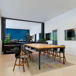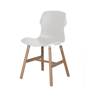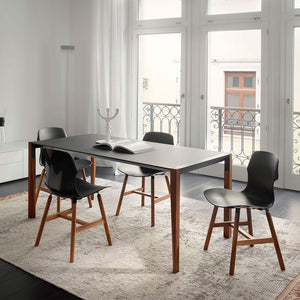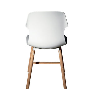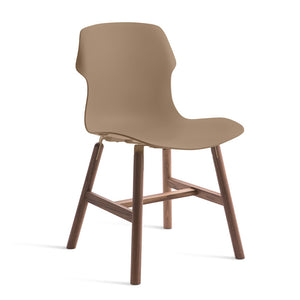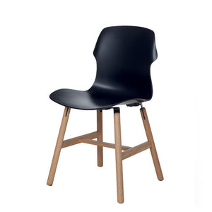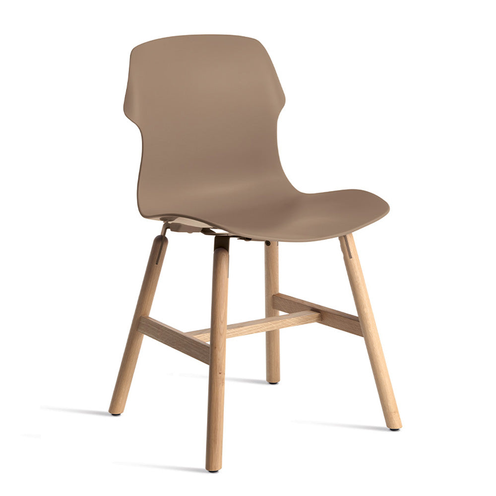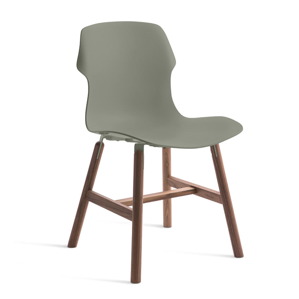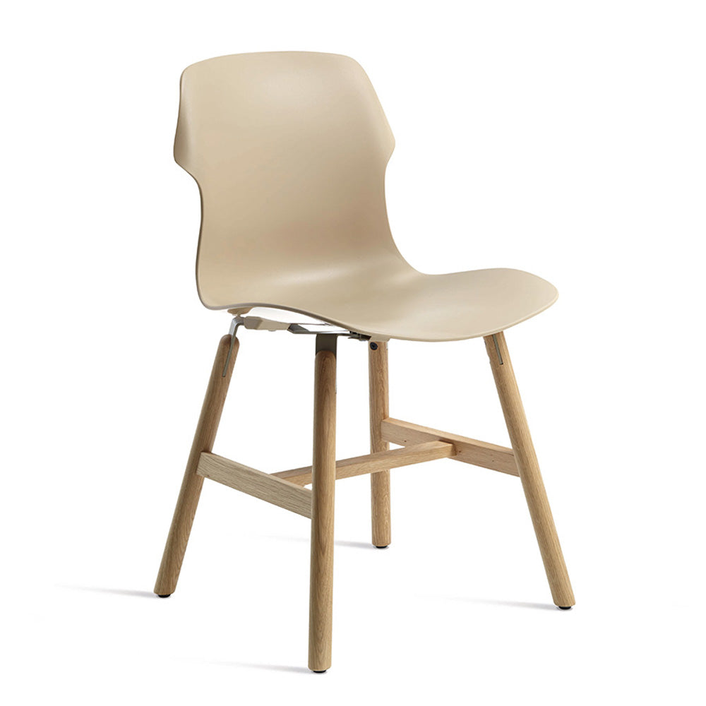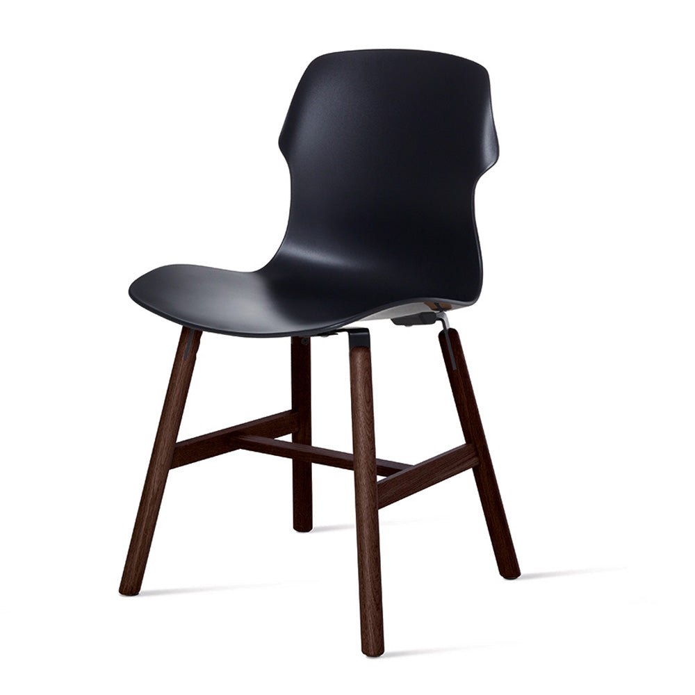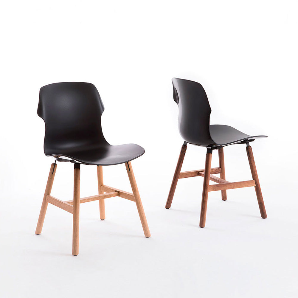 The Stereo chair comes in multiple versions to suit different functions but they all share the same polypropylene seat with its distinctive sculpted shape, which looks contemporary and elegant as well as offering a high level of comfort. This version of the Stereo chair comes with solid oak or walnut legs with cross supports. As an option, the seat can be upholstered in fabric or leather. Please enquire for more details.