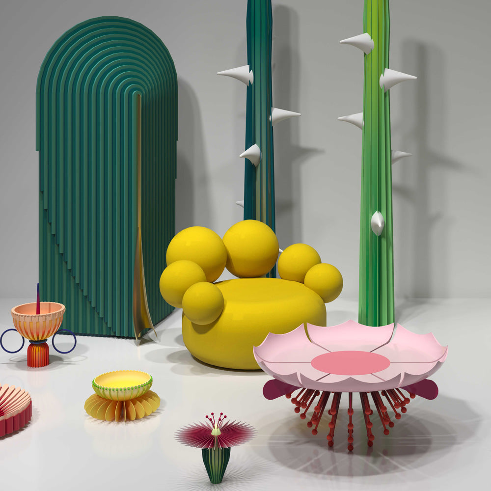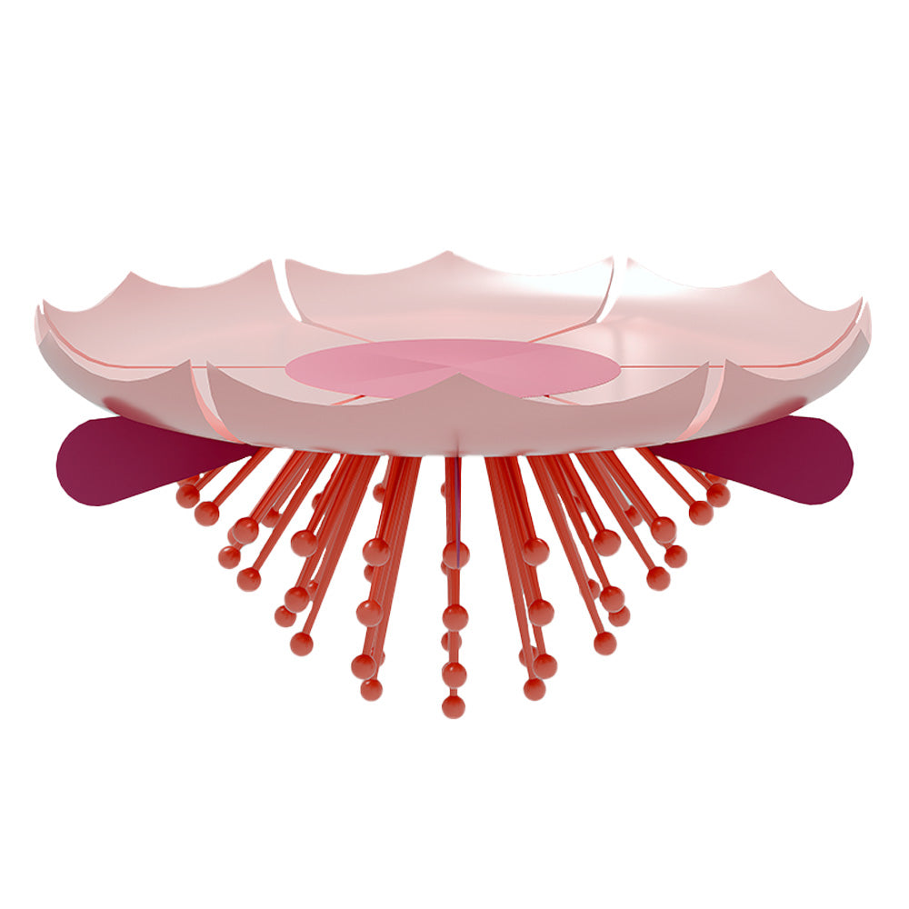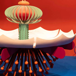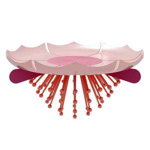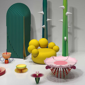 The Garden Table is part of the Garden Collection, designed by Richard Yasmine and crafted by Scarlet Splendour. It is shaped as a giant blossomed flower with a rush of pollen laden filaments which reach the floor acting as legs. The collection includes chairs, tables, cabinets, lamps and vases, all inspired by the outdoors, the colours and shapes of a fantastic garden. The collection is suitable for indoor use only.