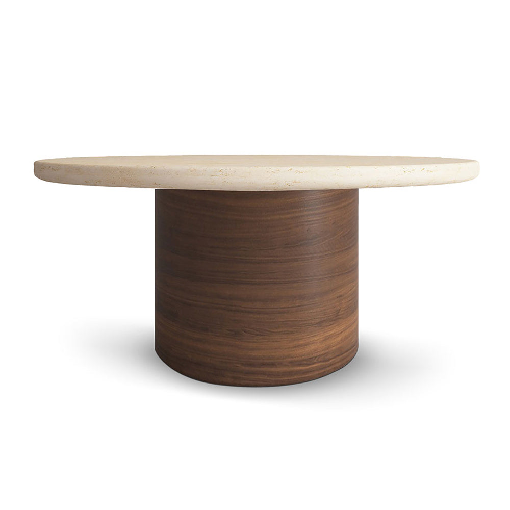 - First image: structure in solid walnut wood; table top in Travertino marble