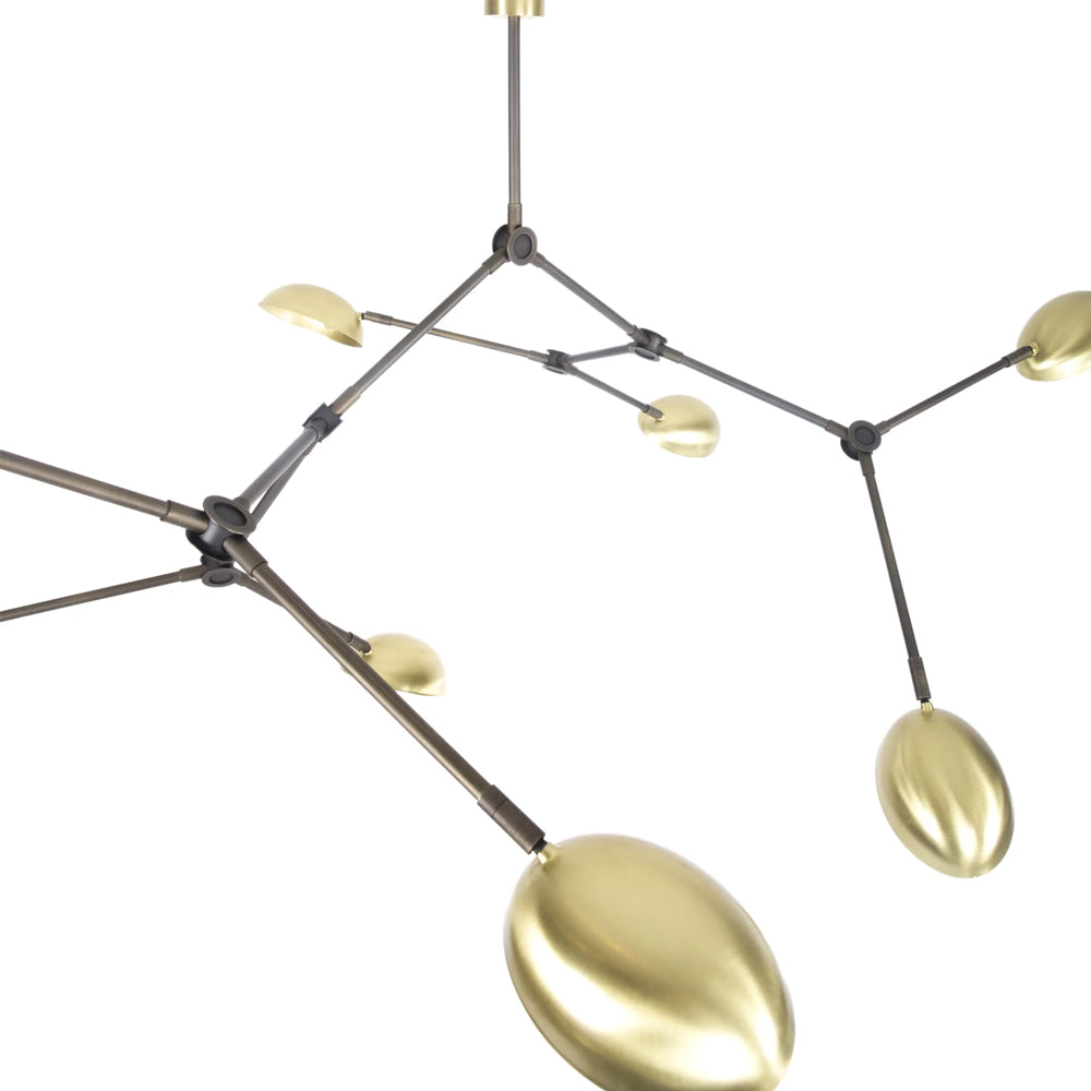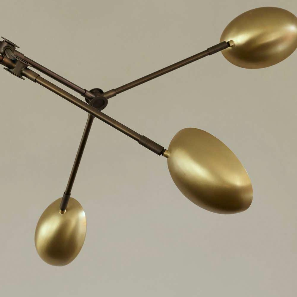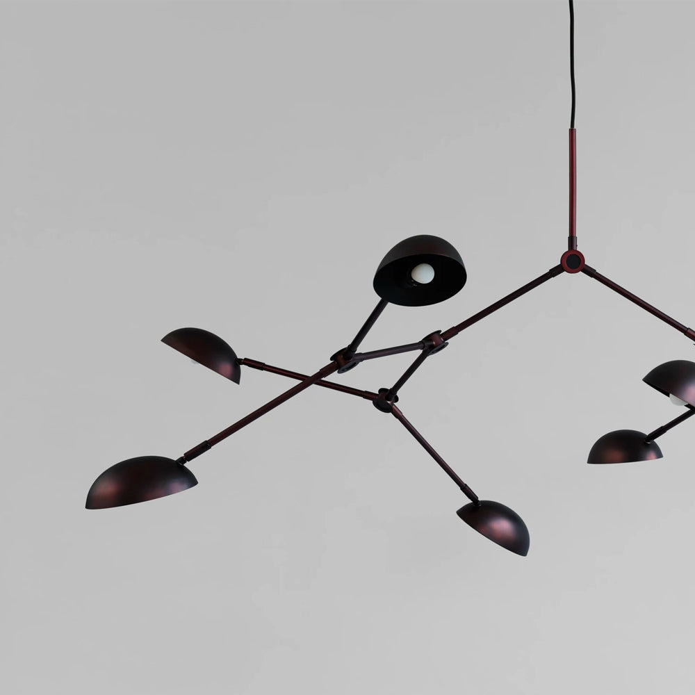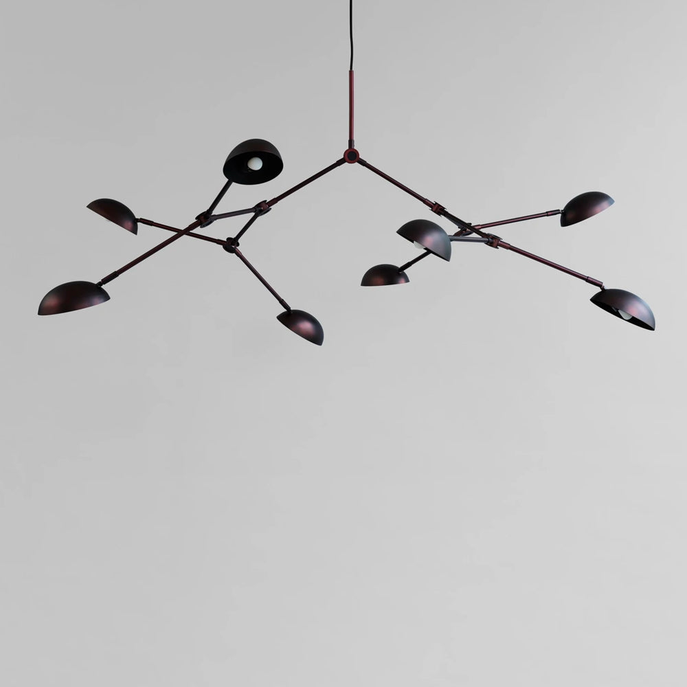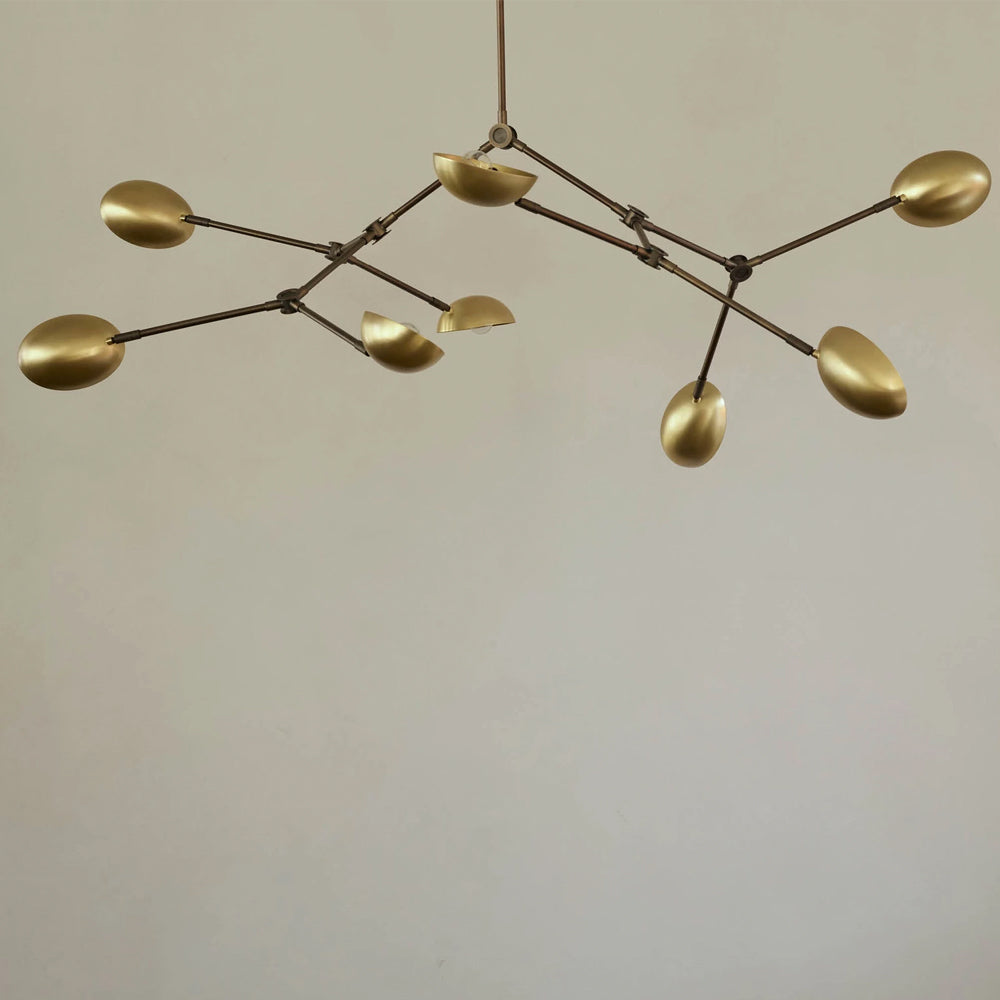 The Drop Chandelier is inspired both by Danish Modernism and the 1950s iconic and experimental approach to light design, with some industrial and maritime references. It features eight drop shaped adjustable lampshades, which enables the shades to be positioned in countless ways whilst creating optimal light diffusion. The lampshades are made in hand-brushed oxidised brass or aluminium, which infuse the room with a warm light.