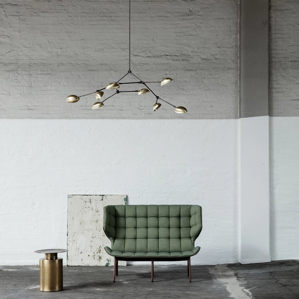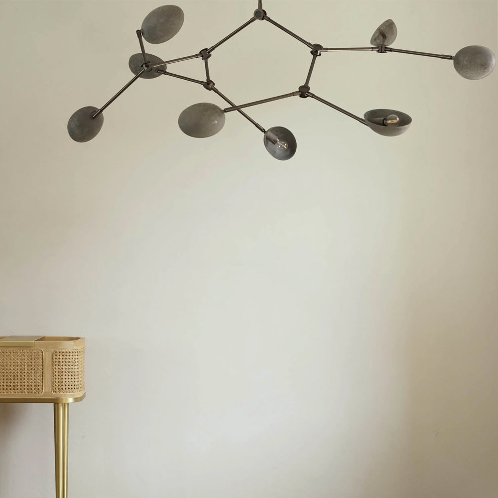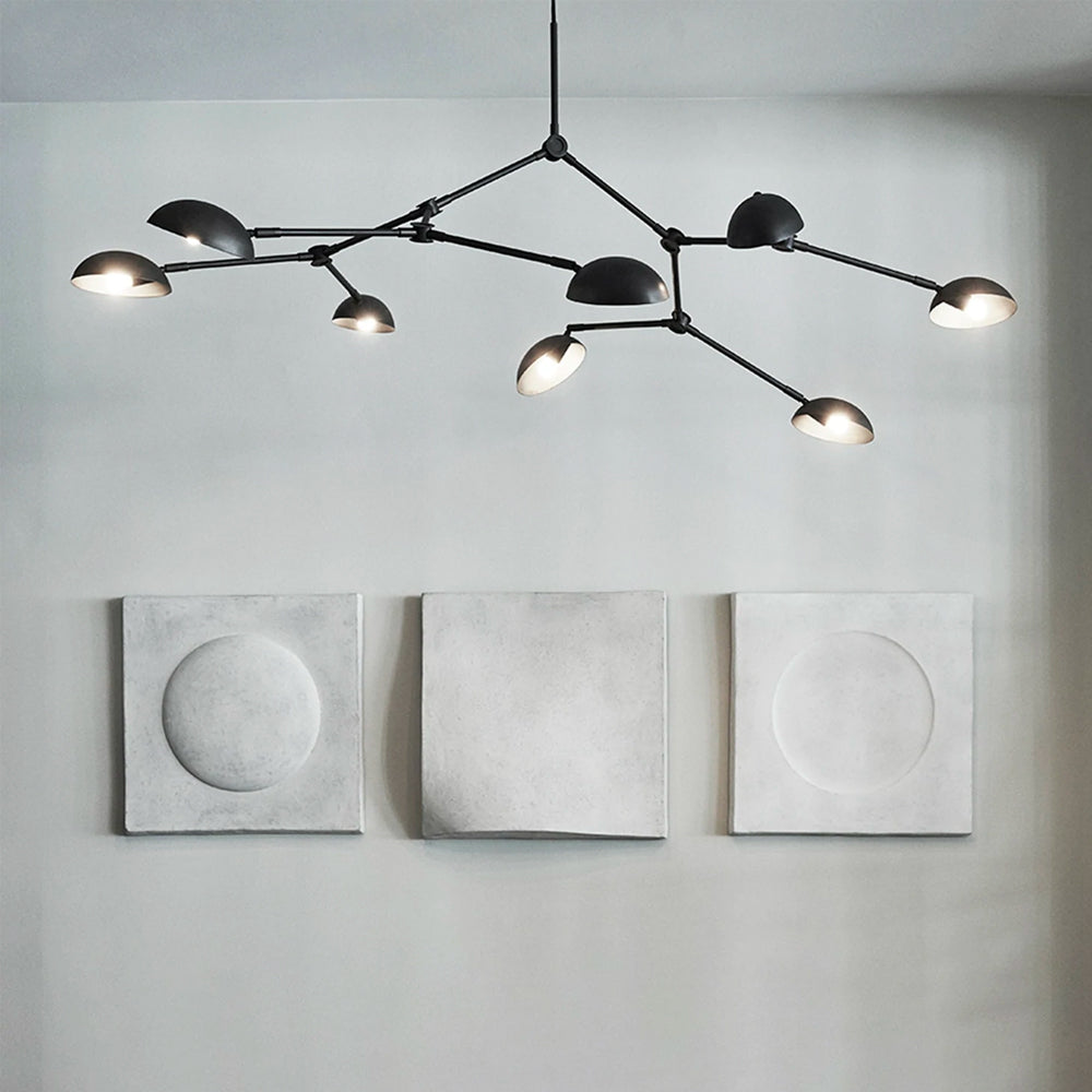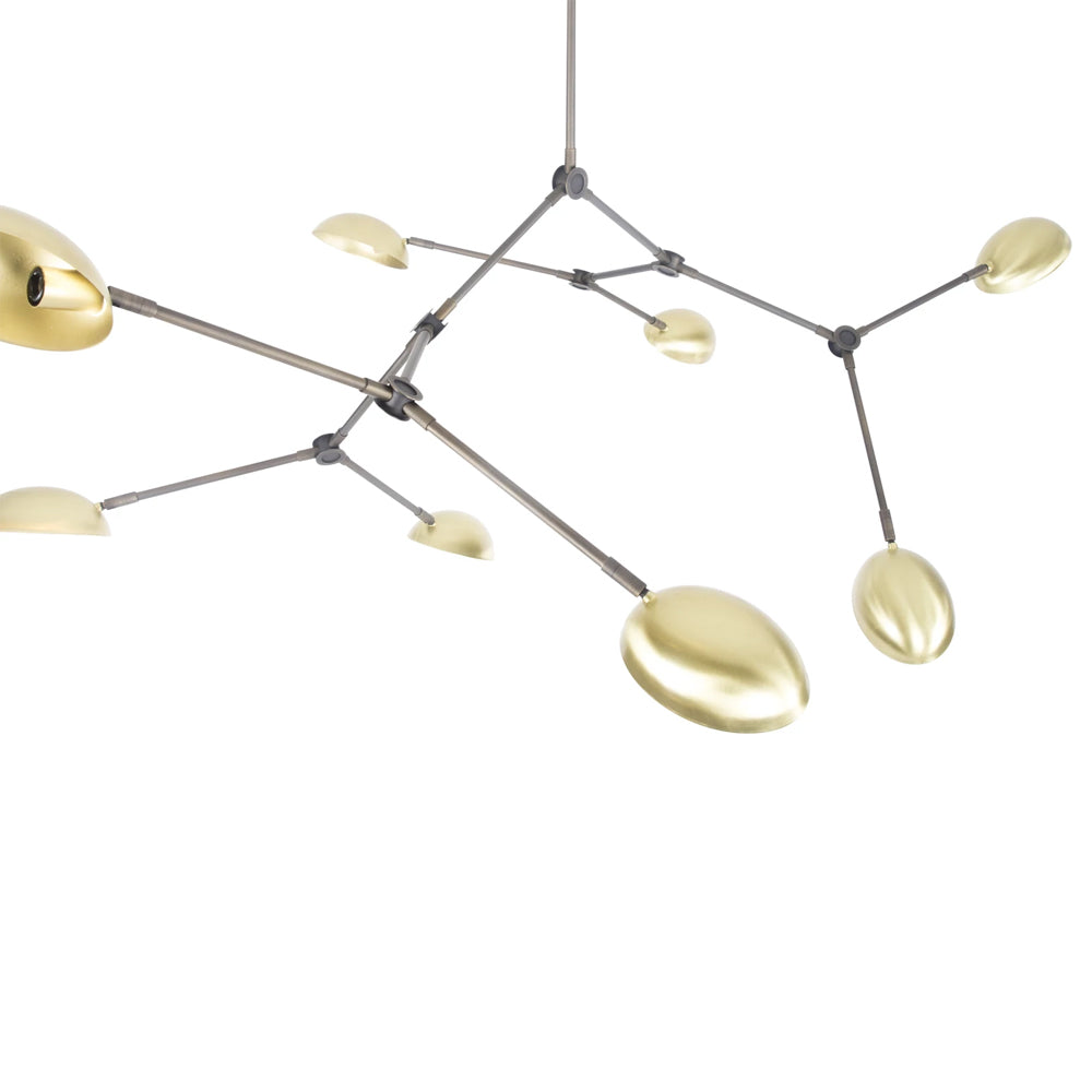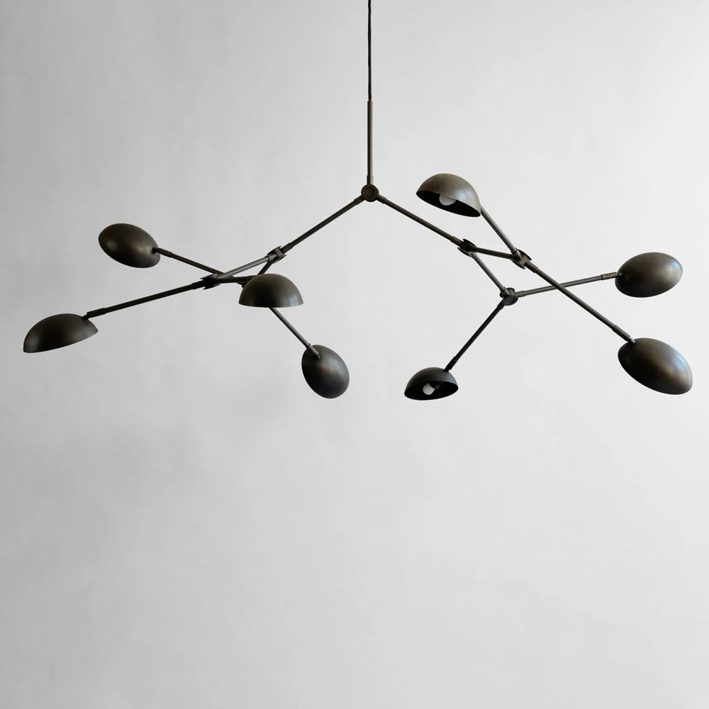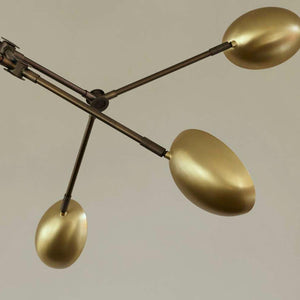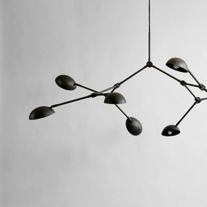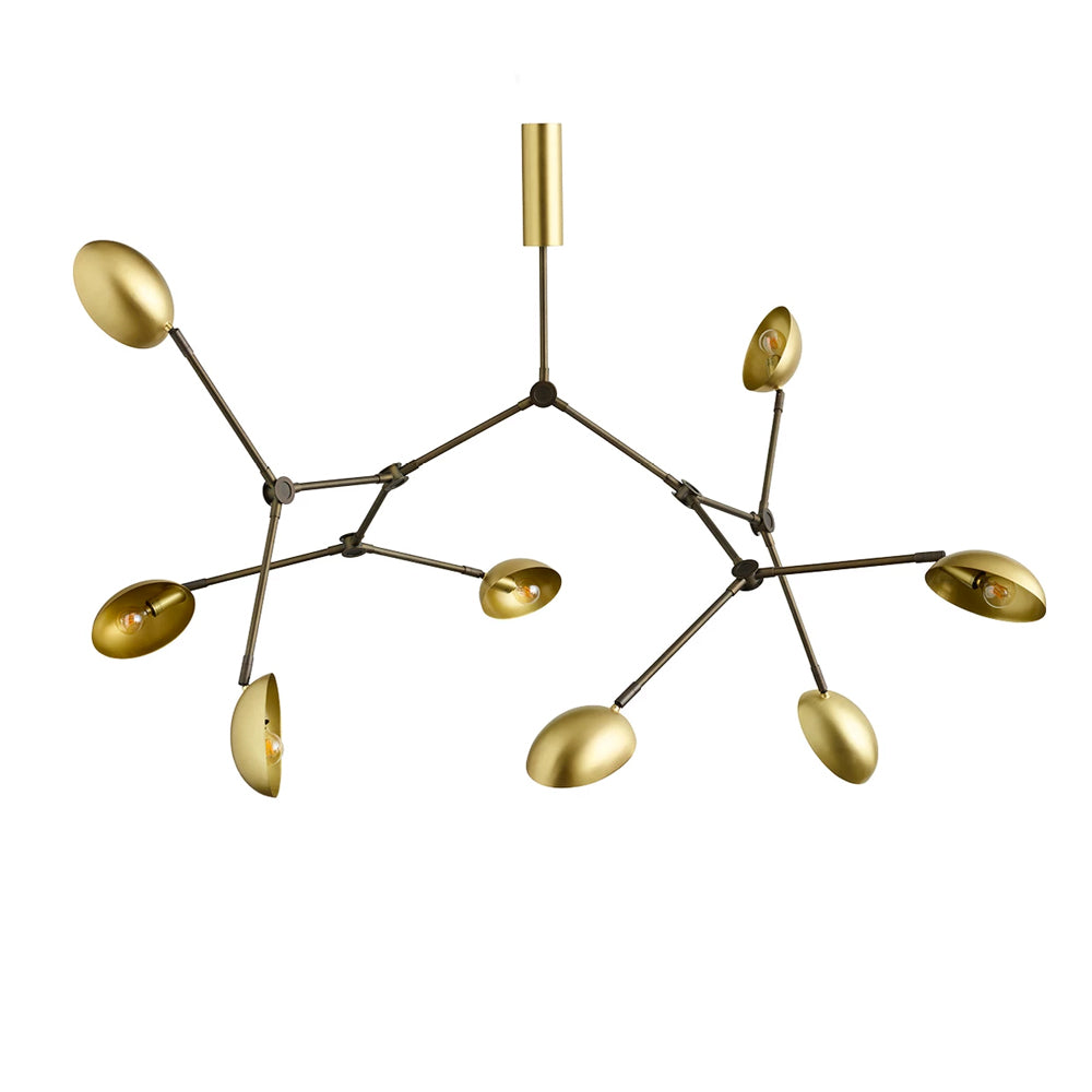 The Drop Chandelier is inspired both by Danish Modernism and the 1950s iconic and experimental approach to light design, with some industrial and maritime references. It features eight drop shaped adjustable lampshades, which enables the shades to be positioned in countless ways whilst creating optimal light diffusion. The lampshades are made in hand-brushed oxidised brass or aluminium, which infuse the room with a warm light.