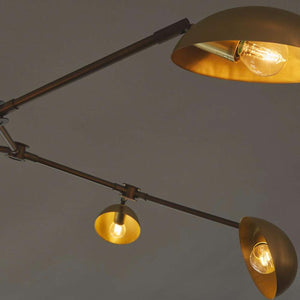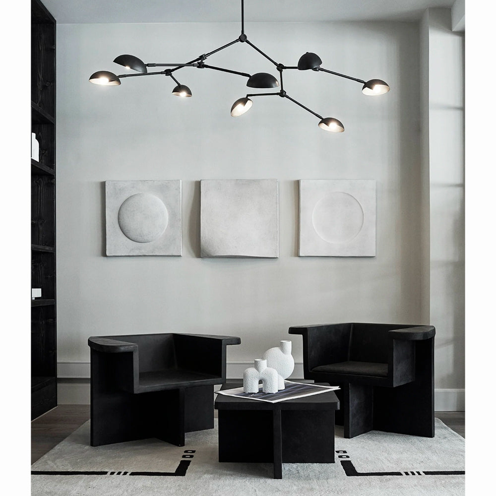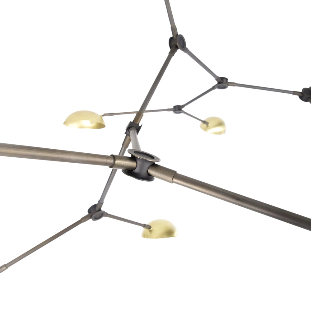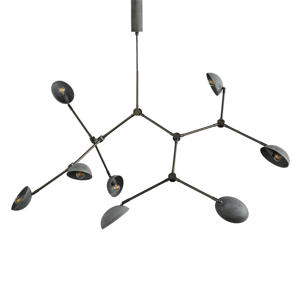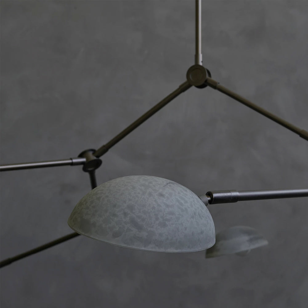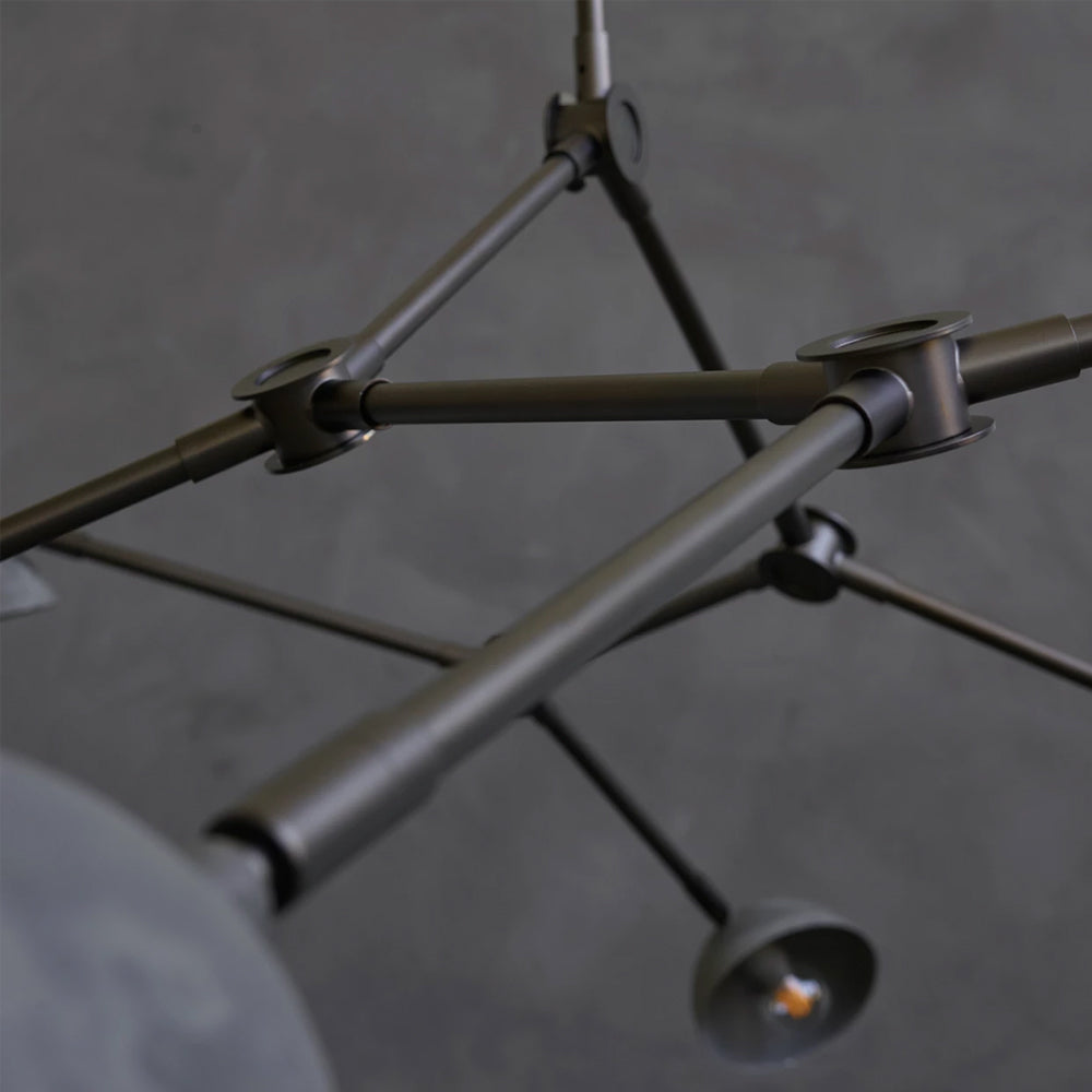 The Drop Chandelier is inspired both by Danish Modernism and the 1950s iconic and experimental approach to light design, with some industrial and maritime references. It features eight drop shaped adjustable lampshades, which enables the shades to be positioned in countless ways whilst creating optimal light diffusion. The lampshades are made in hand-brushed oxidised brass or aluminium, which infuse the room with a warm light.