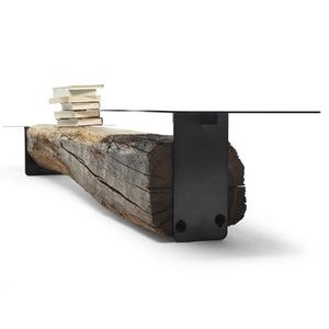 The Beam TV Bench is made of a solid wood trunk with two metal shelves attached to it in a distinct design combining the rustic with the industrial. The wood is deliberately untreated to showcase all its natural irregularities. As a result, every bench is unique and full of personality. The Beam TV Bench comes in two different sizes and can be used as a general purpose sideboard as well as a TV bench.