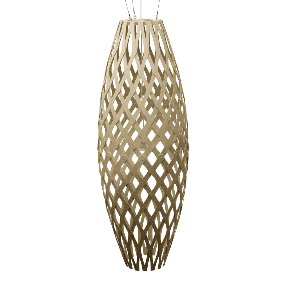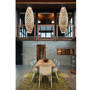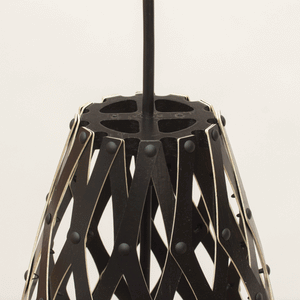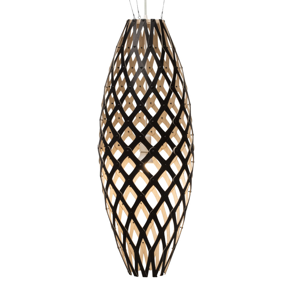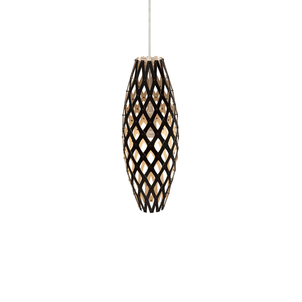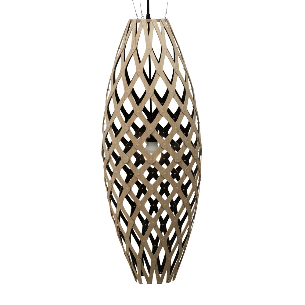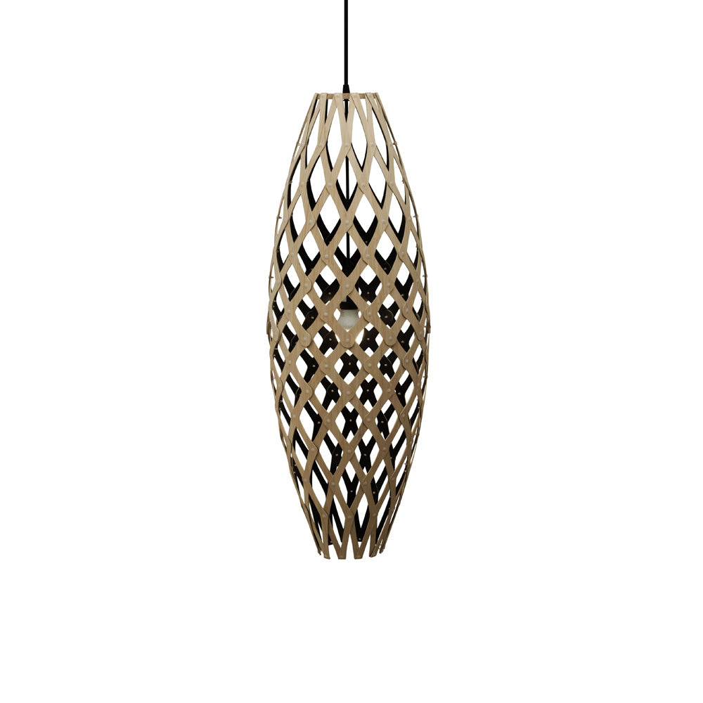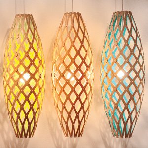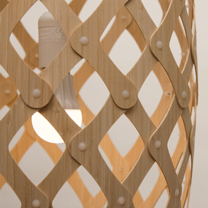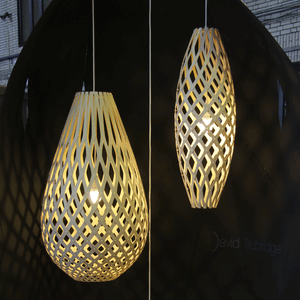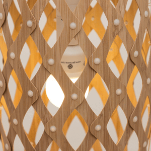The design of the Hinaki Suspension Light is inspired by the fishtraps used by the Maori fishermen. The light is made of bamboo veneer components which are clipped together to create a three dimensional shape. The design highlights the pattern of the natural bamboo veneer and enables the light to cast beautiful shadows through the intricate patterns. The effect is particularly striking with different colour finishes or if multiple lights of different sizes are clustered together. This clever flat-packed kit system also lowers the shipping weight of the light substantially, thereby reducing its carbon footprint.