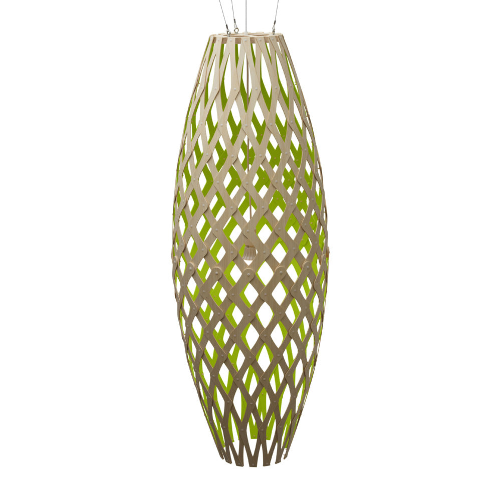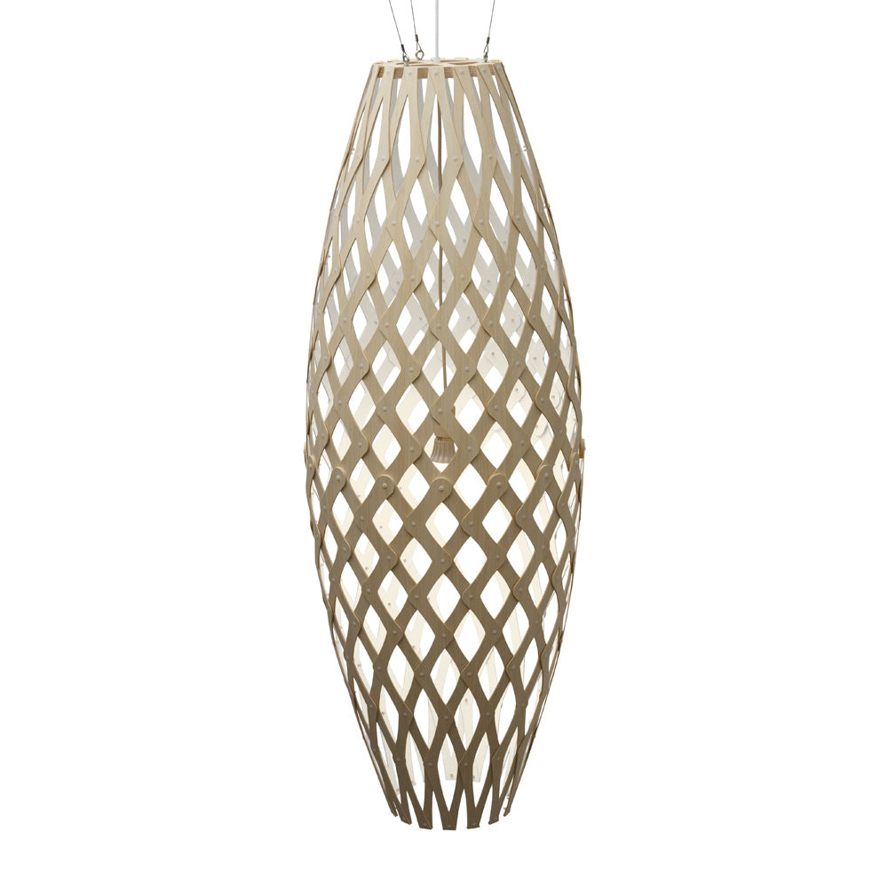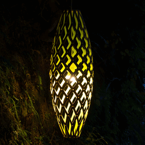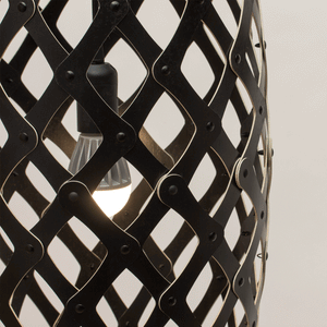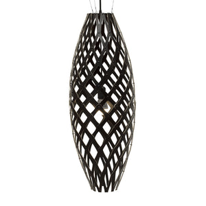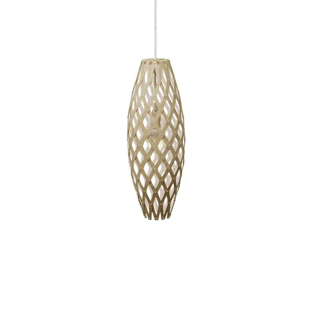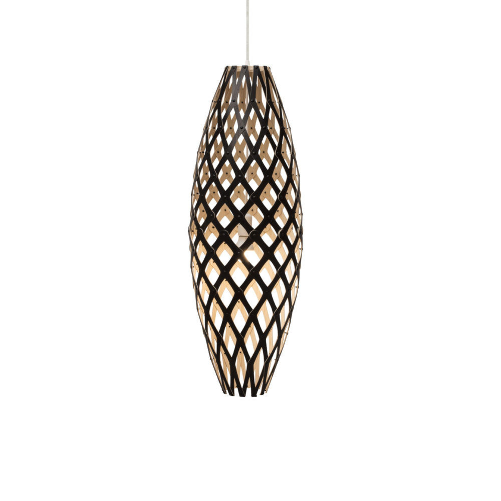 The design of the Hinaki Suspension Light is inspired by the fishtraps used by the Maori fishermen. The light is made of bamboo veneer components which are clipped together to create a three dimensional shape. The design highlights the pattern of the natural bamboo veneer and enables the light to cast beautiful shadows through the intricate patterns. The effect is particularly striking with different colour finishes or if multiple lights of different sizes are clustered together. This clever flat-packed kit system also lowers the shipping weight of the light substantially, thereby reducing its carbon footprint.