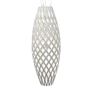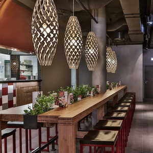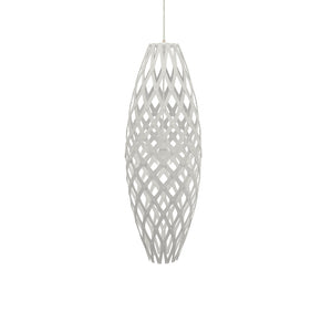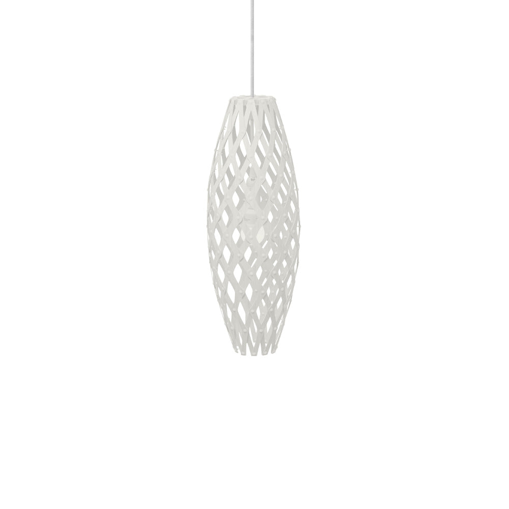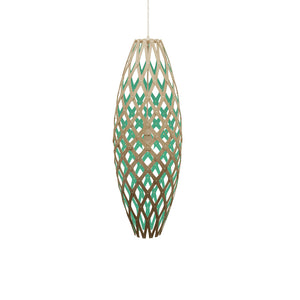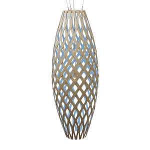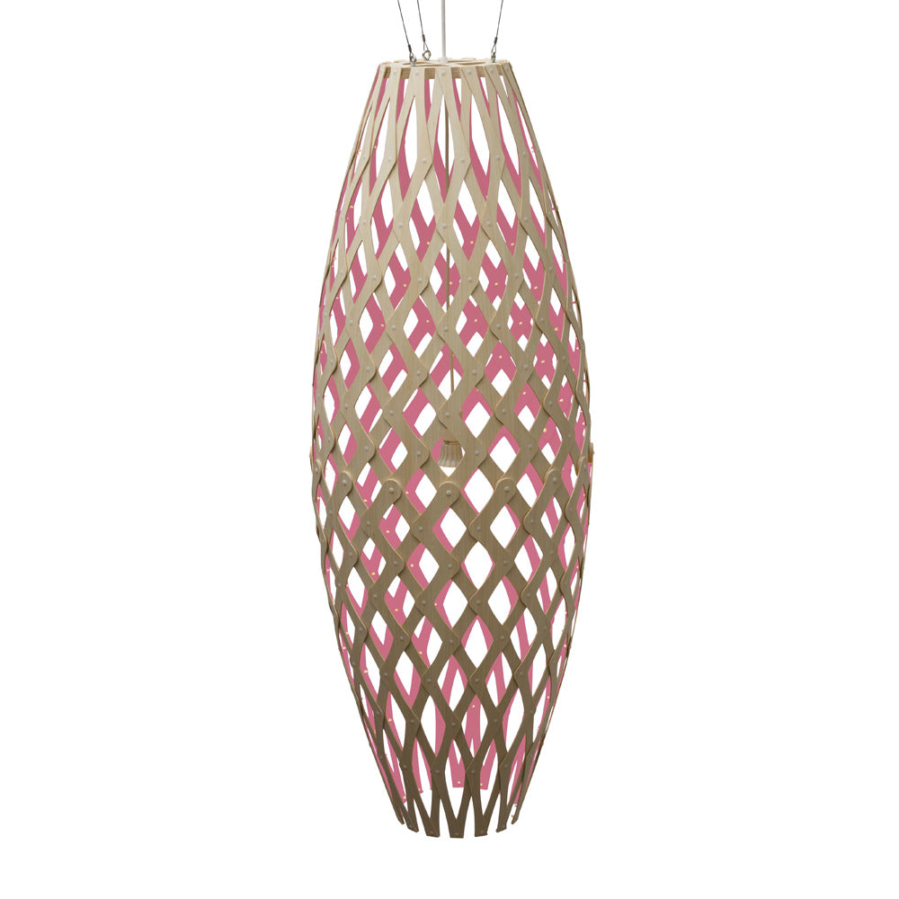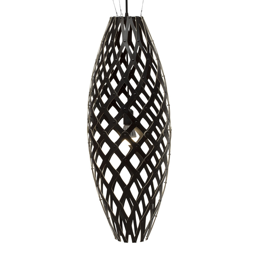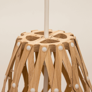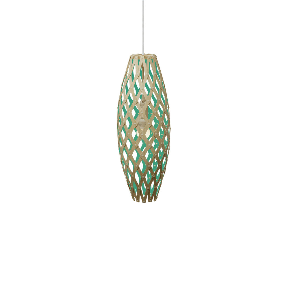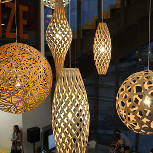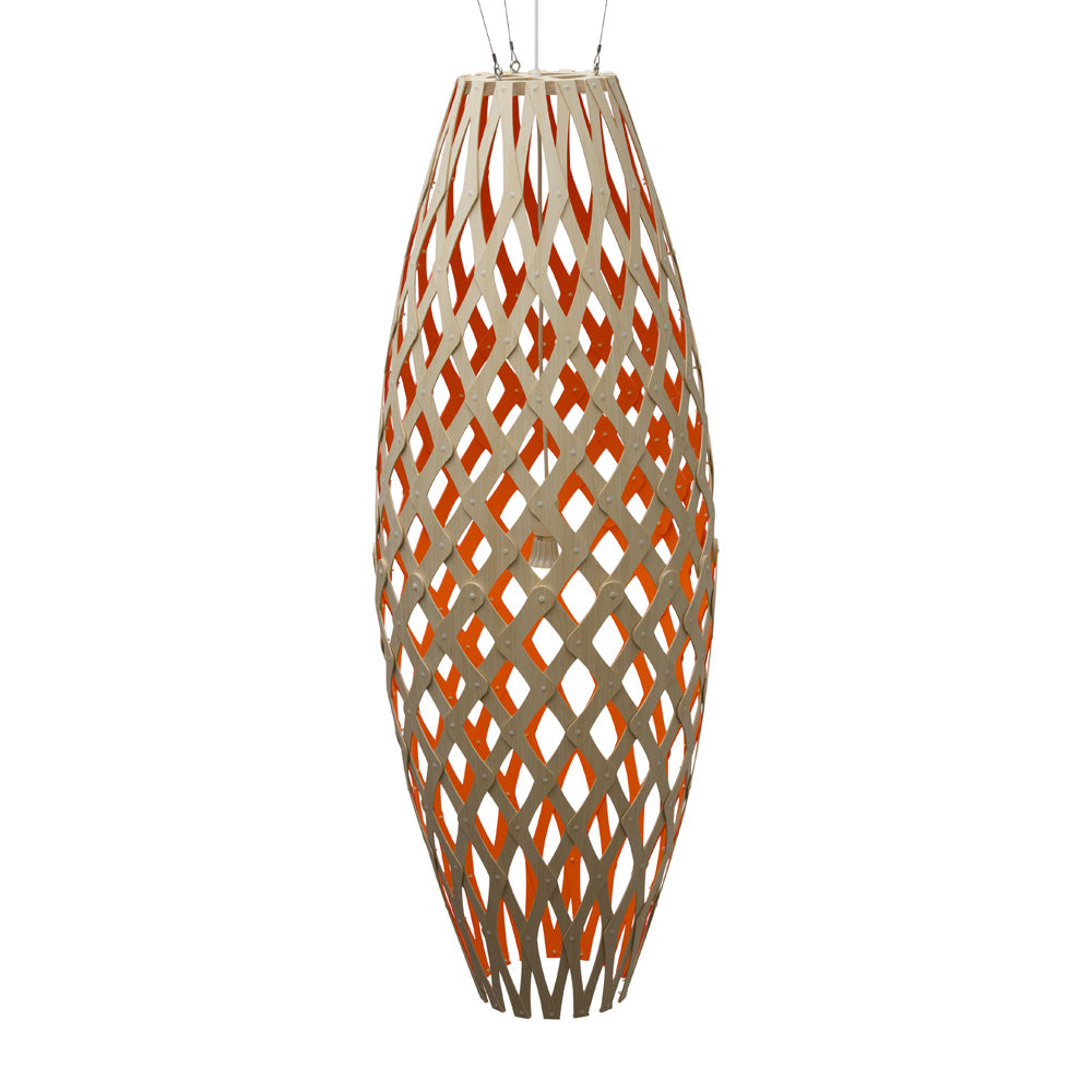The design of the Hinaki Suspension Light is inspired by the fishtraps used by the Maori fishermen. The light is made of bamboo veneer components which are clipped together to create a three dimensional shape. The design highlights the pattern of the natural bamboo veneer and enables the light to cast beautiful shadows through the intricate patterns. The effect is particularly striking with different colour finishes or if multiple lights of different sizes are clustered together. This clever flat-packed kit system also lowers the shipping weight of the light substantially, thereby reducing its carbon footprint.