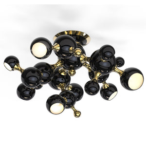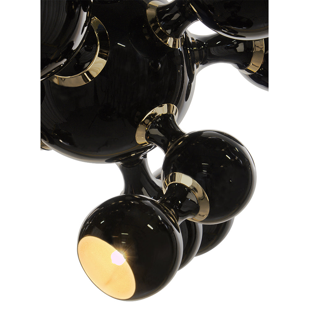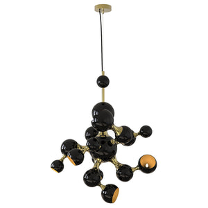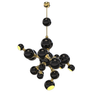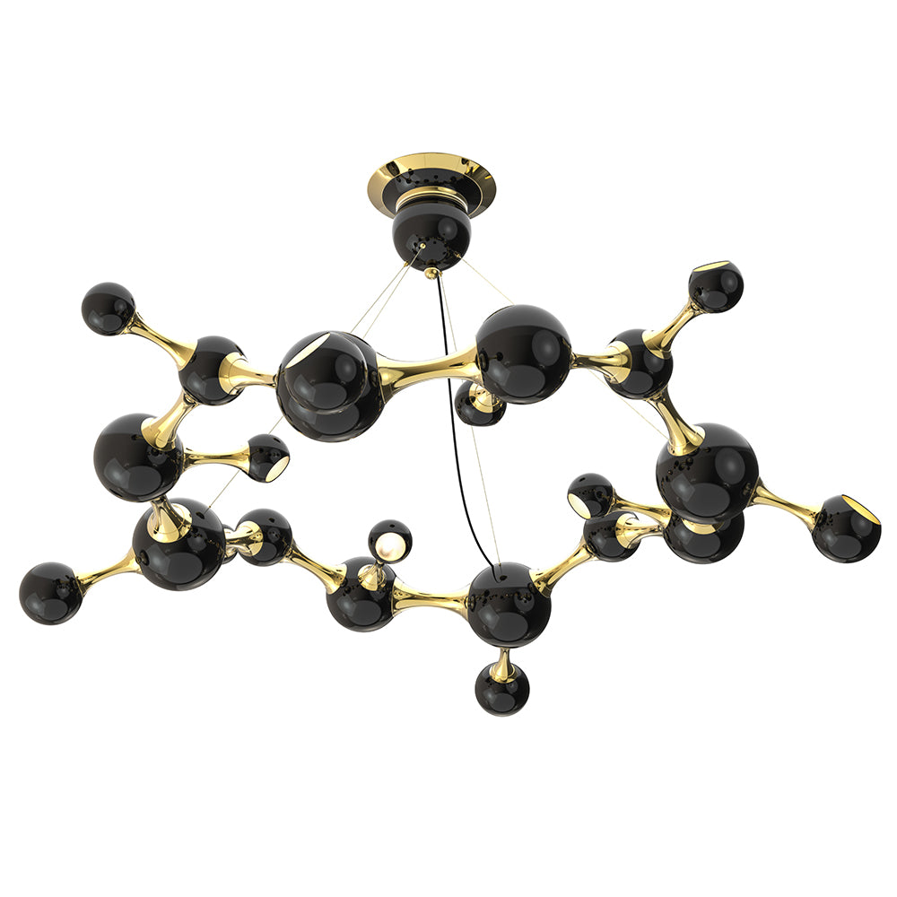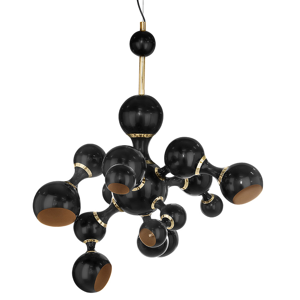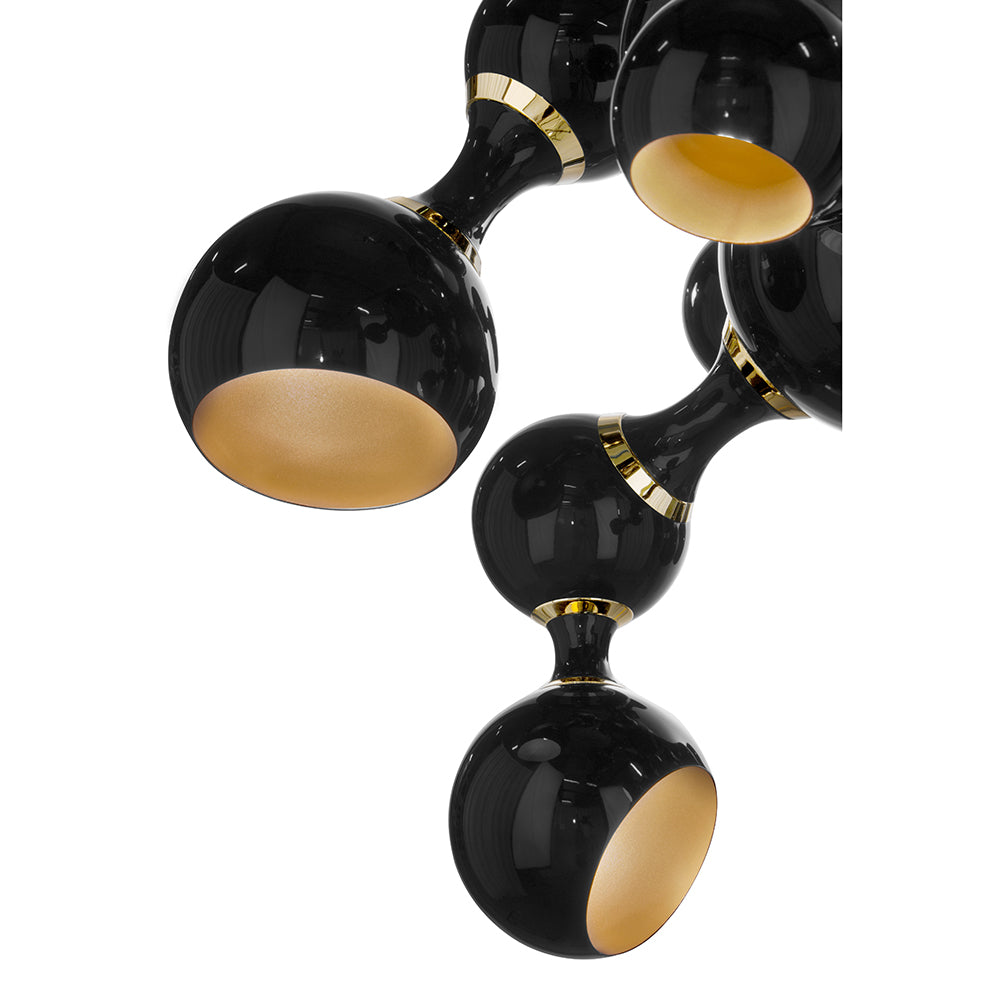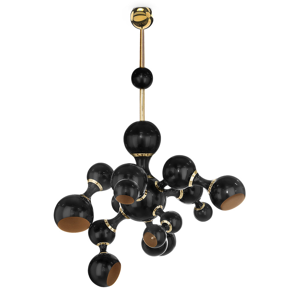 Atomic Suspension Lights is a collection of lights inspired by the molecular composition of the atom, a nod to the atomic age and to the race to space during the mid-century era. The Atomic lights are handmade in brass and steel, with a gold-finish body and glossy black lacquered shades. The inside of the spotlights is lacquered with a gold powder paint, which creates a more soothing light to the eye. Atomic Suspension lights are available in three versions: pendant, ceiling and round chandelier.
