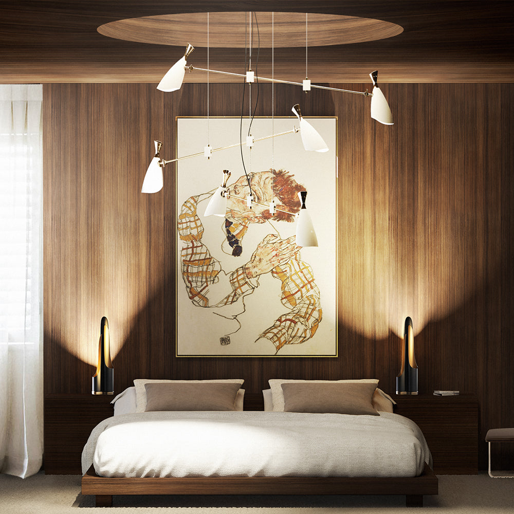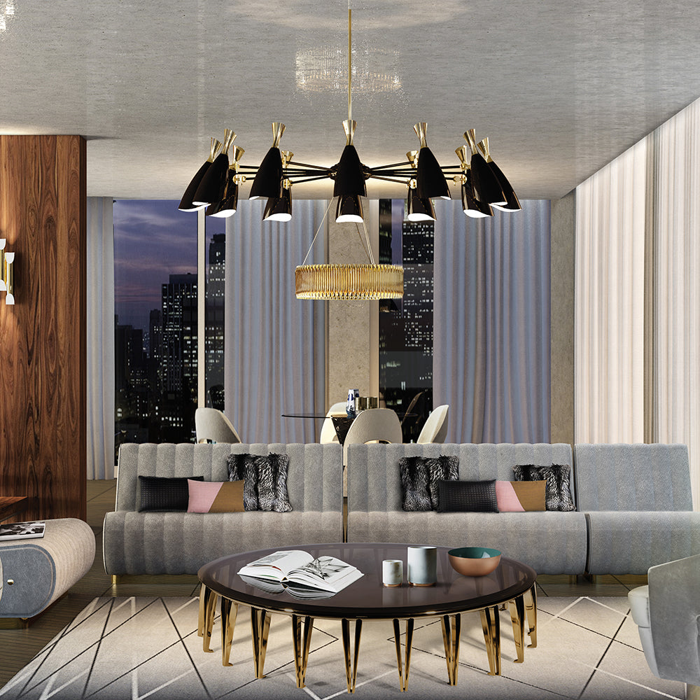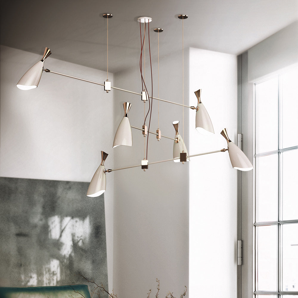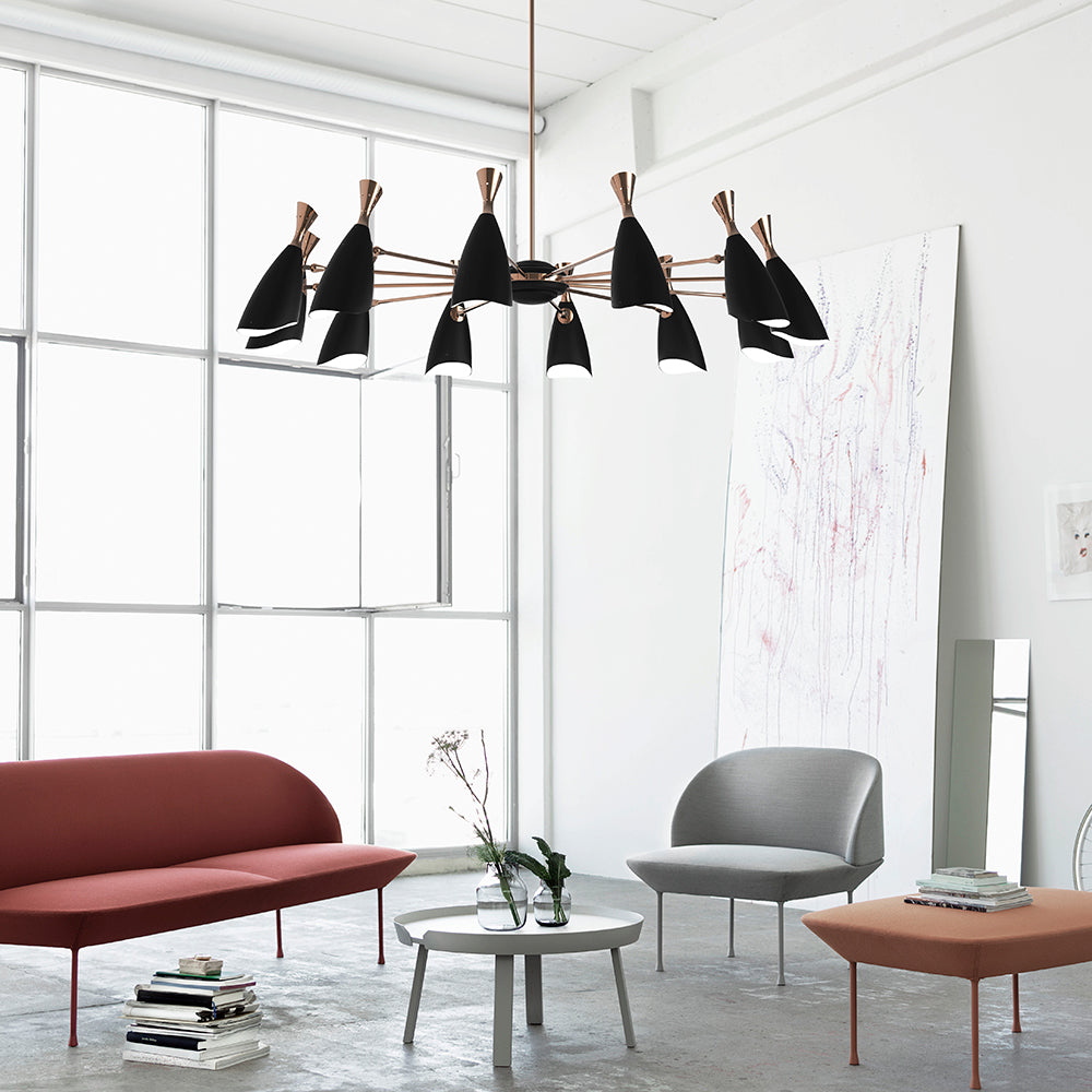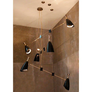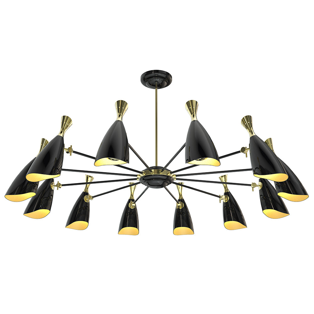 The Duke Suspension Lights are inspired by the style of the 1970s and are a tribute to Duke Ellington, the legendary American composer, pianist, and leader of jazz orchestras. As a standard, Duke is handmade in brass and aluminium. The body is cast in brass in both matte black and gold-plated finishes, while the shades are lacquered in glossy black outside and matte white inside. These are also available with a gold powder paint finish. Duke Suspension lights are available in two versions: pendant and round.