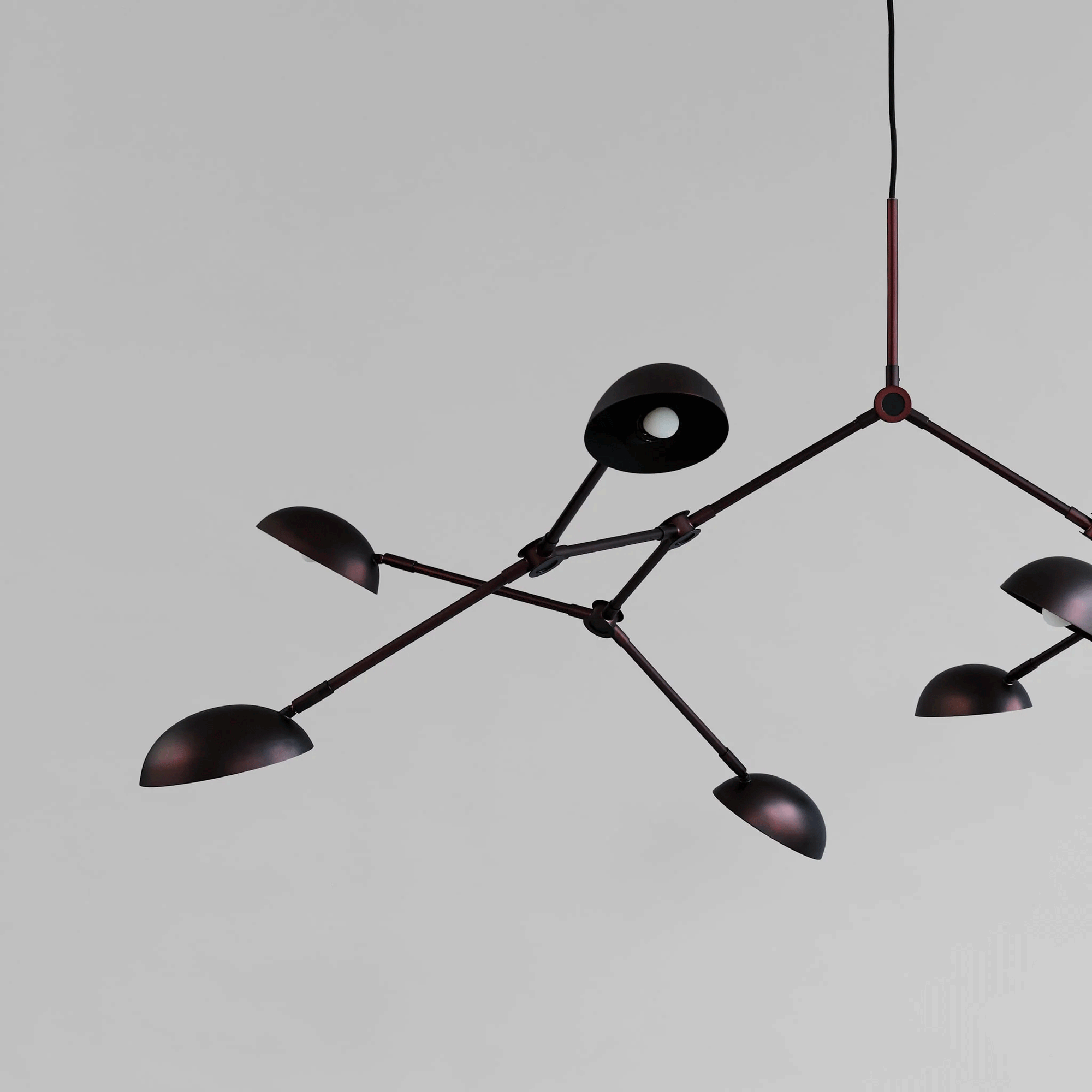 The Drop Chandelier is inspired both by Danish Modernism and the 1950s iconic and experimental approach to light design, with some industrial and maritime references. It features eight drop shaped adjustable lampshades, which enables the shades to be positioned in countless ways whilst creating optimal light diffusion. The lampshades are made in hand-brushed oxidised brass or aluminium, which infuse the room with a warm light.