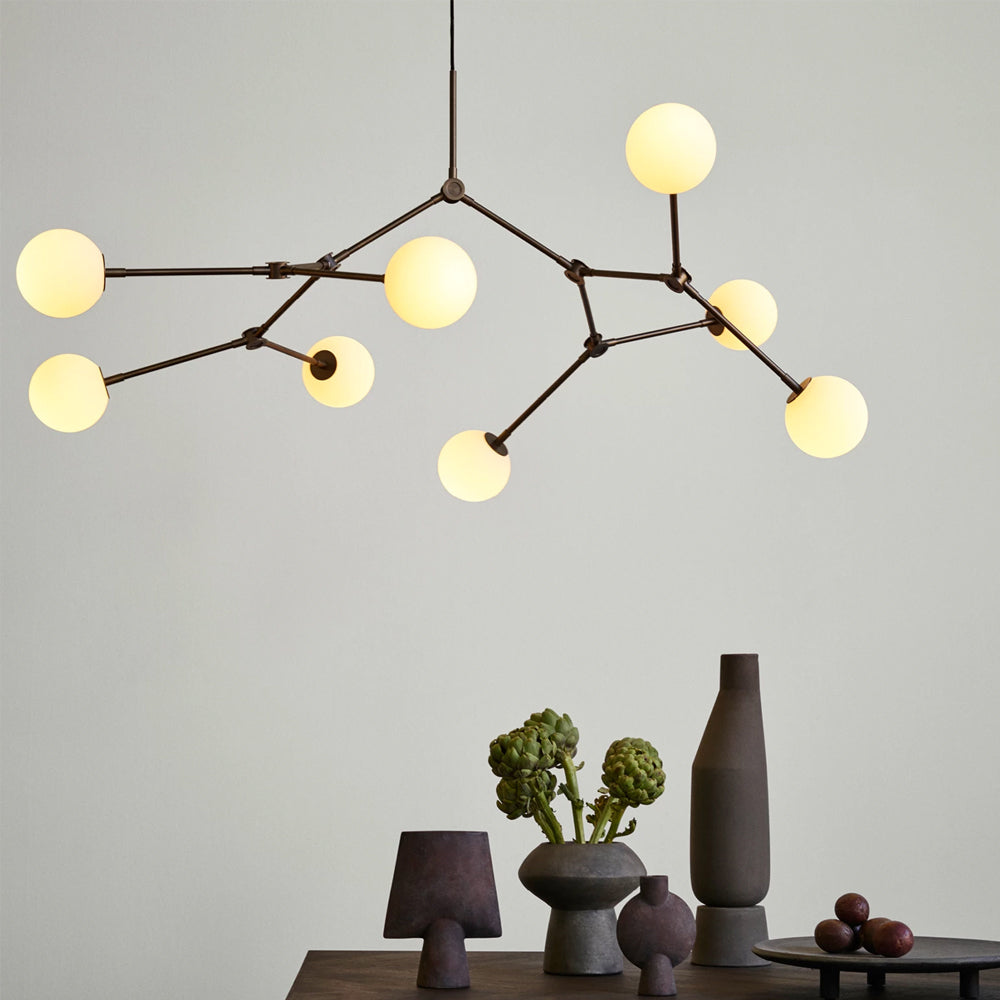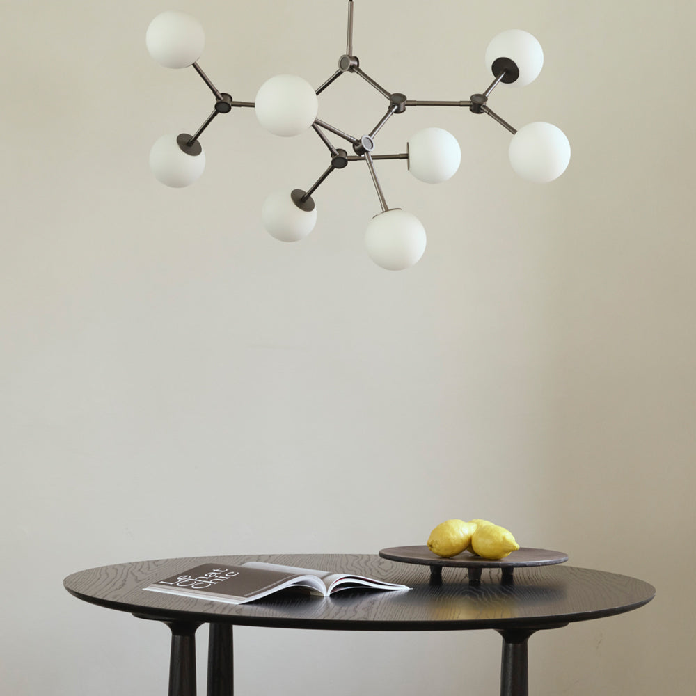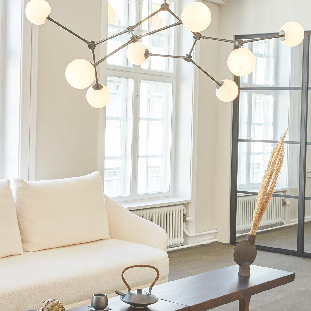 The Drop Chandelier Bulb Grey is inspired both by Danish Modernism and the 1950s iconic and experimental approach to light design, with some industrial and maritime references. It features eight ball-shaped adjustable lampshades, which enables the shades to be positioned in countless ways whilst creating optimal light diffusion. The opal glass lampshades infuse the room in a beautiful warm light, creating a homely "hygge" ambiance.