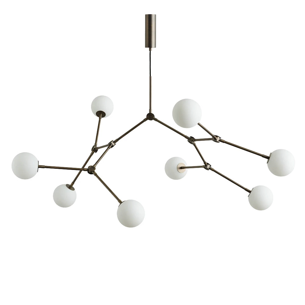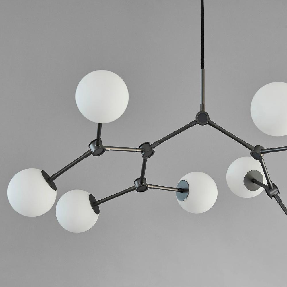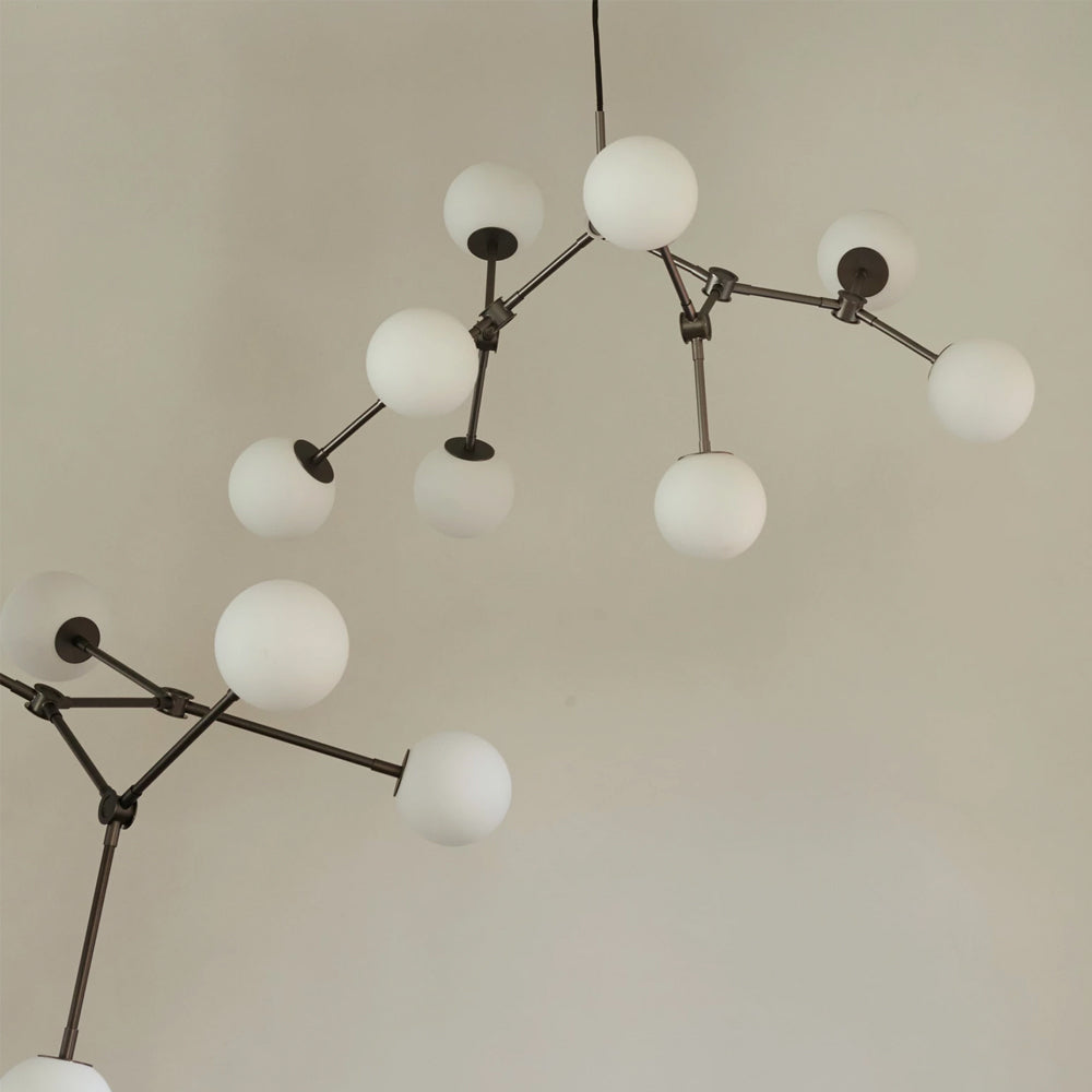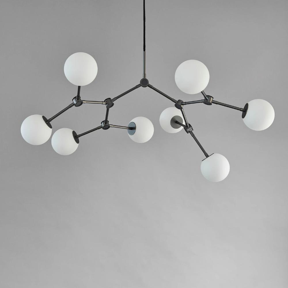 The Drop Chandelier Bulb Grey is inspired both by Danish Modernism and the 1950s iconic and experimental approach to light design, with some industrial and maritime references. It features eight ball-shaped adjustable lampshades, which enables the shades to be positioned in countless ways whilst creating optimal light diffusion. The opal glass lampshades infuse the room in a beautiful warm light, creating a homely "hygge" ambiance.