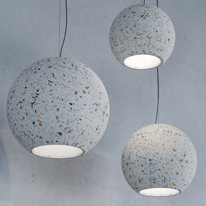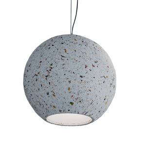 The Reglobe suspension light is made with a rotational moulding process to assemble plastic grains of different colours, creating a random terrazzo effect which looks different on every lamp. The end result is a large, spherical object with a light volume, featuring a white background with brightly coloured, speckled accents.