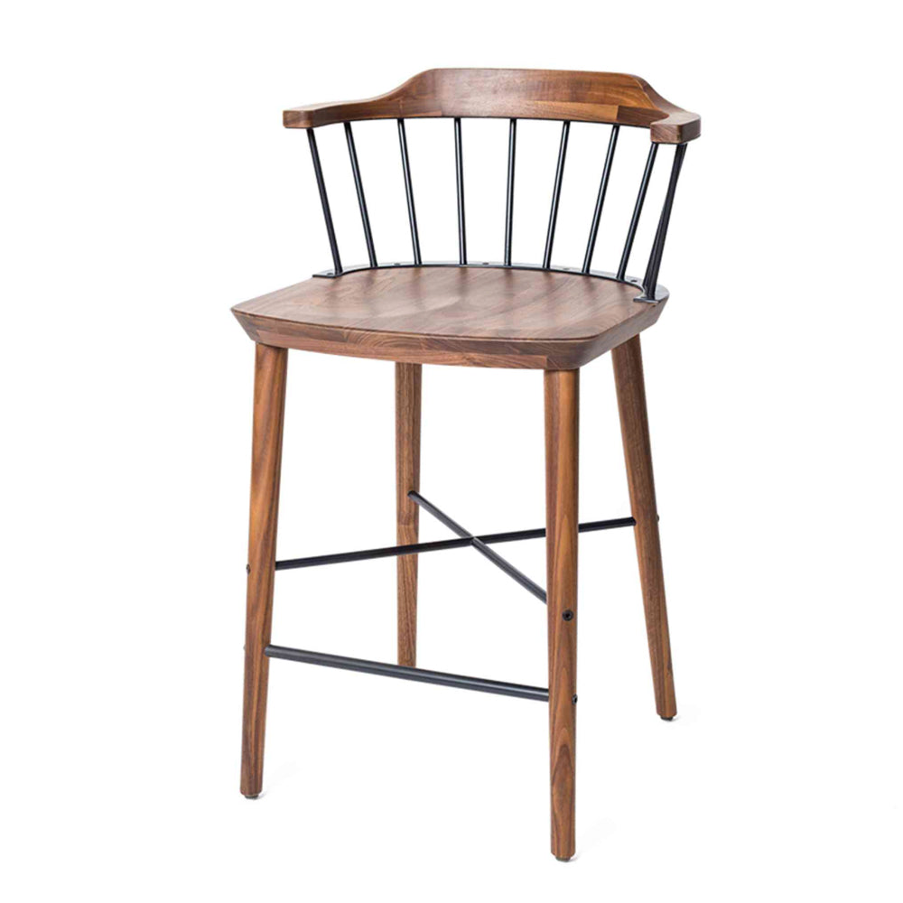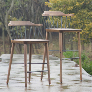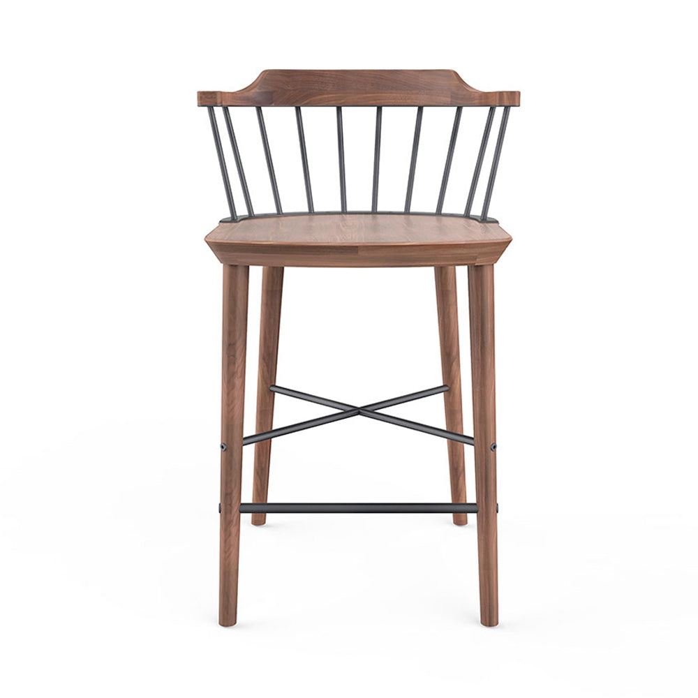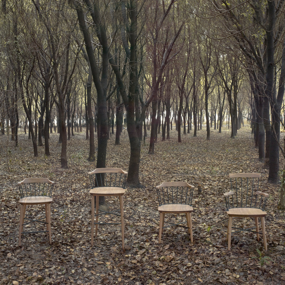 The Exchange Bar Chair SH610 is a wood and steel bar or counter stool inspired by the classic Windsor chair. By "exchanging" the wooden spindles and stretcher of the back of the traditional Windsor chair with blackened steel, Crème has produced a new design which feels both contemporary and traditional at the same time.