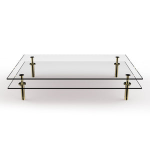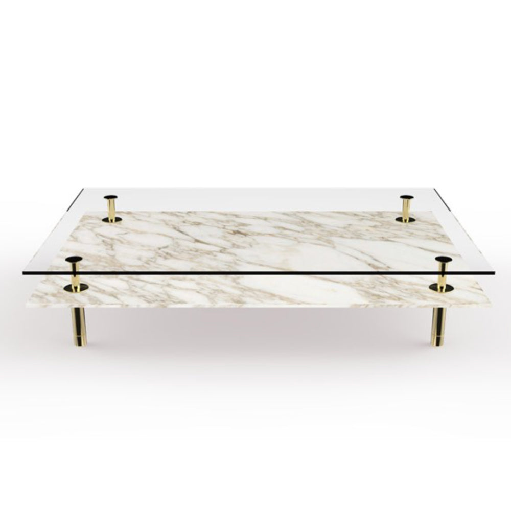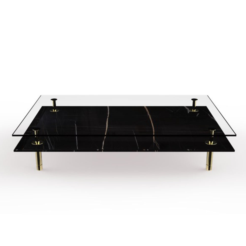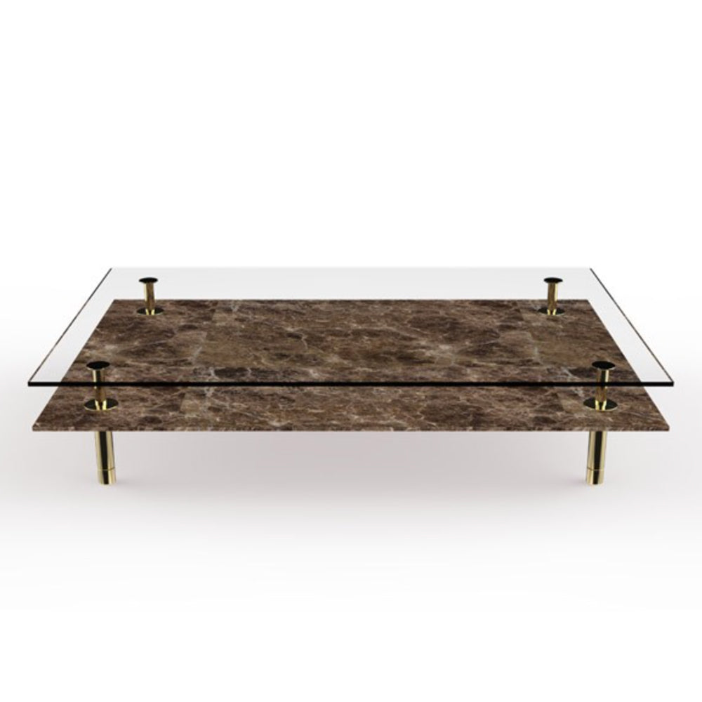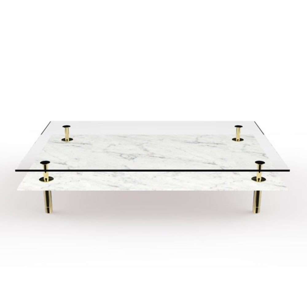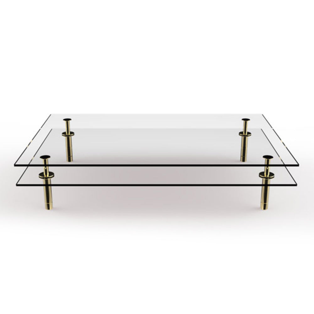 The Legs Coffee Table features slim brass supports, inspired by classical columns, supporting two layers of tops, made either in glass or marble.