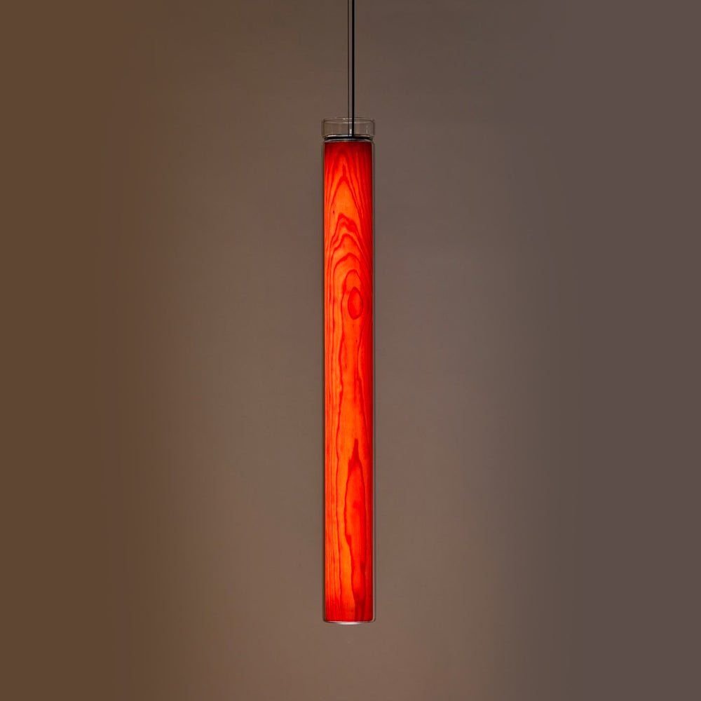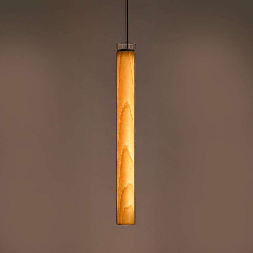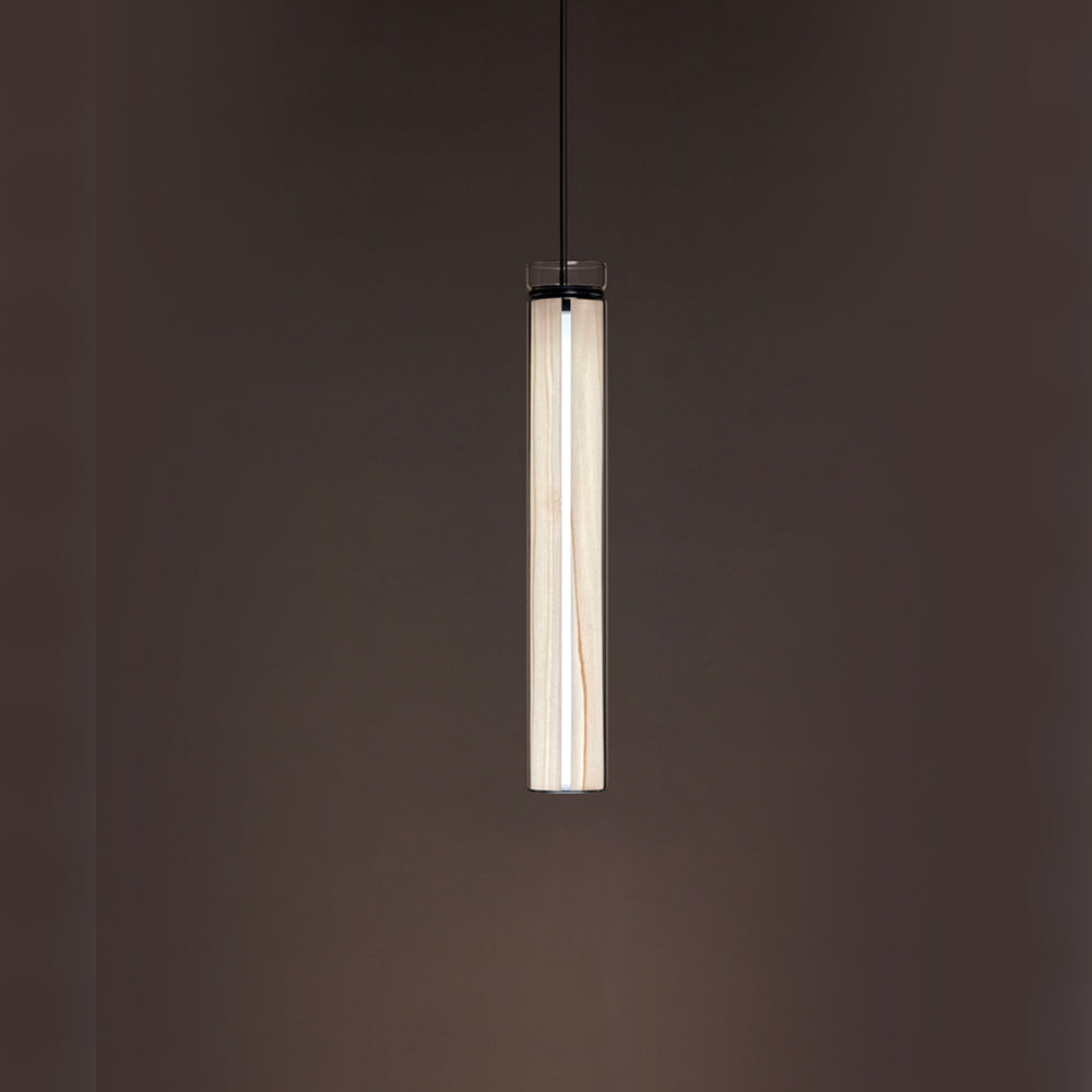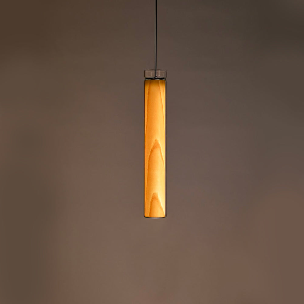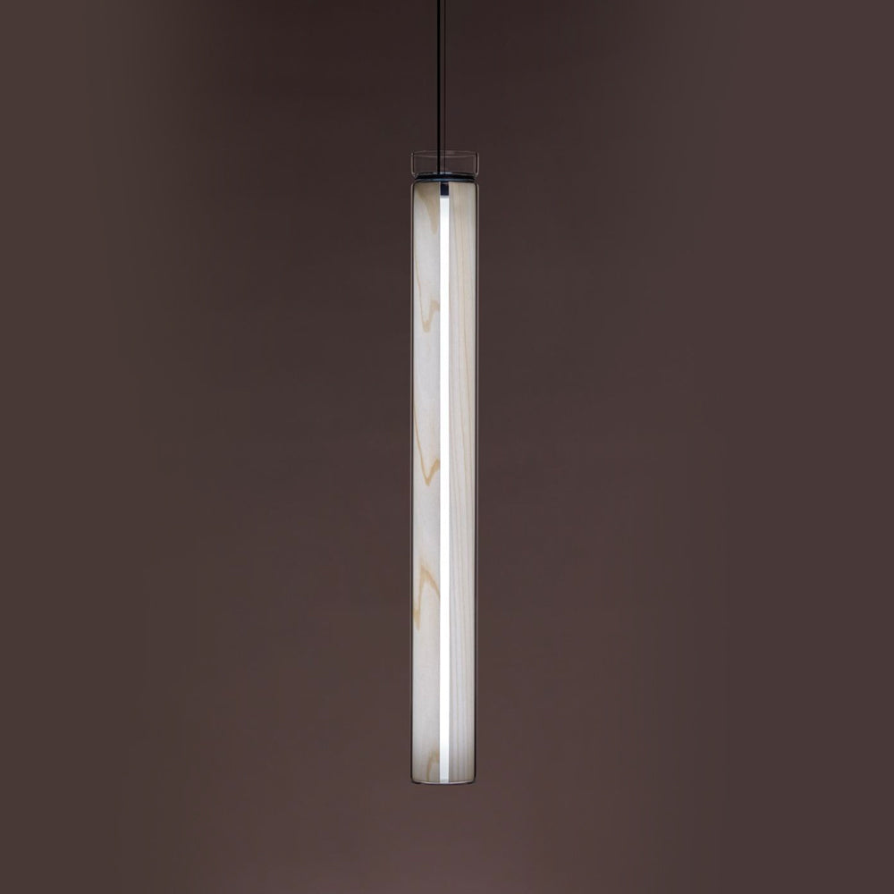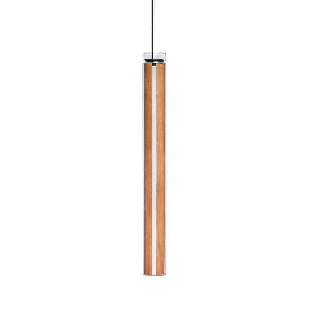 The Estela Suspension Light - Vertical is a captivating capsule of light, composed of a clean, clear, single piece of borosilicate glass (hand-blown by the accomplished artisan Eduard Garuti) enveloping a cylinder-like wood veneer diffuser. The wood veneer houses a dimmable LED light source and a straight opening on one side emits sideward light that is softened by the glass. Estela can also be used together with the Dune suspension light to create alternating design solutions.