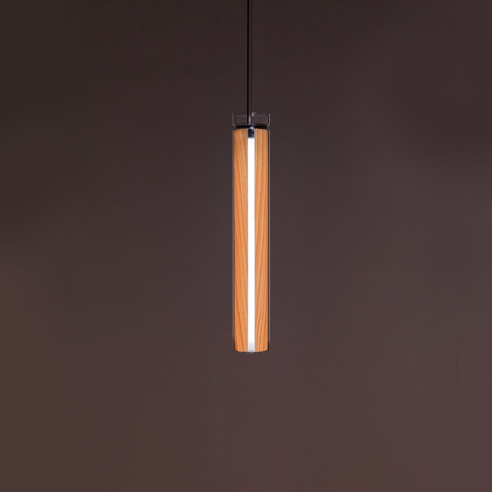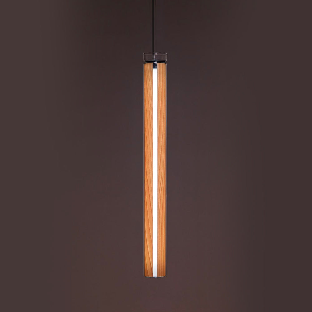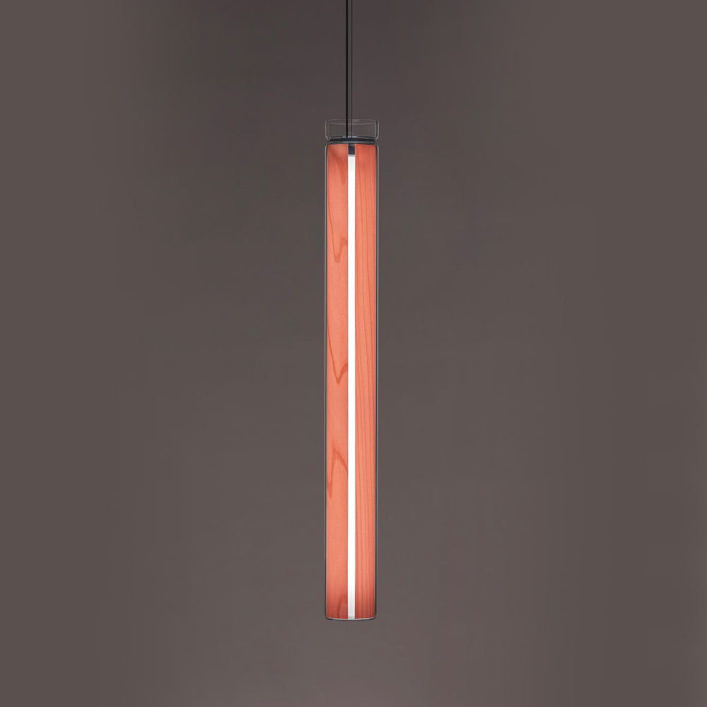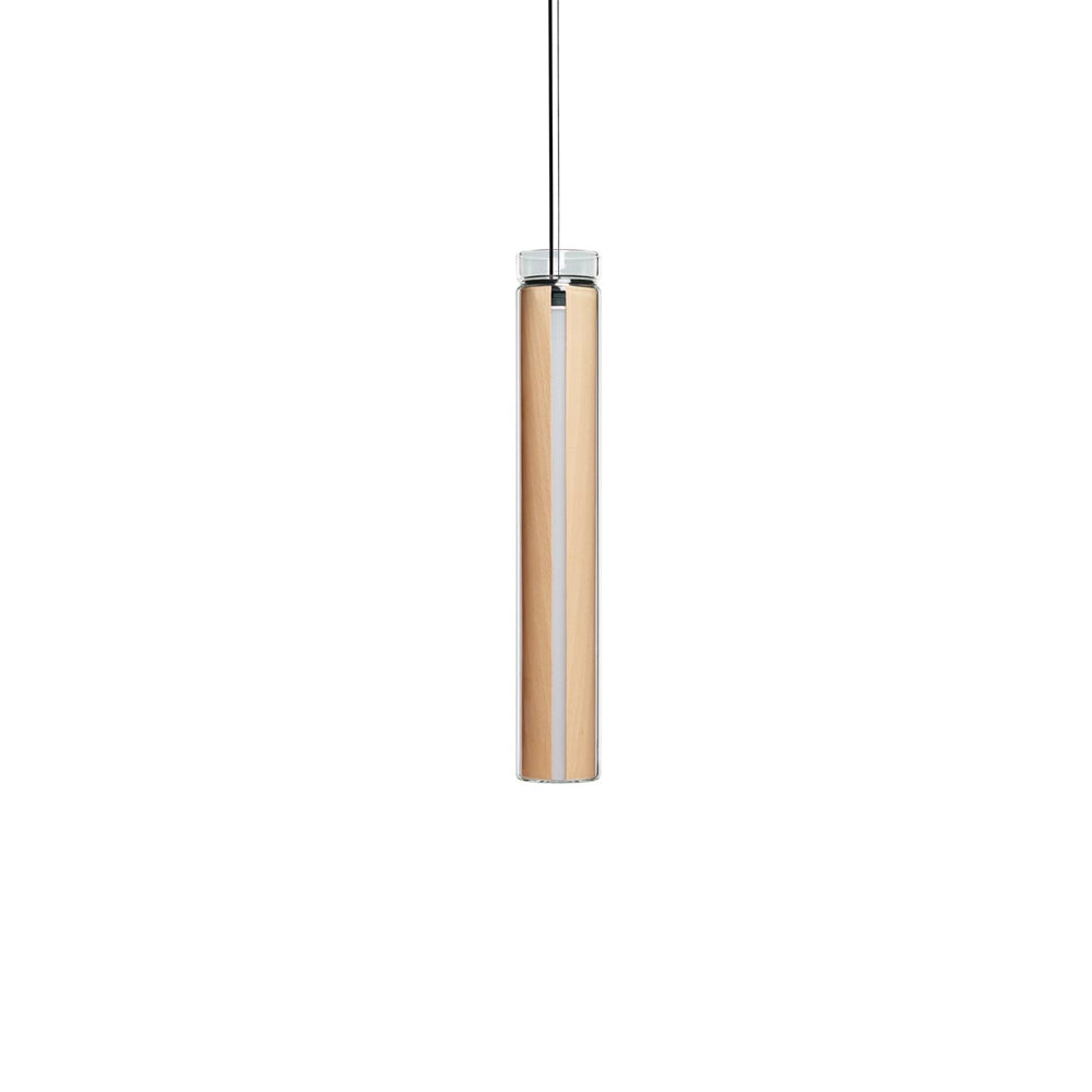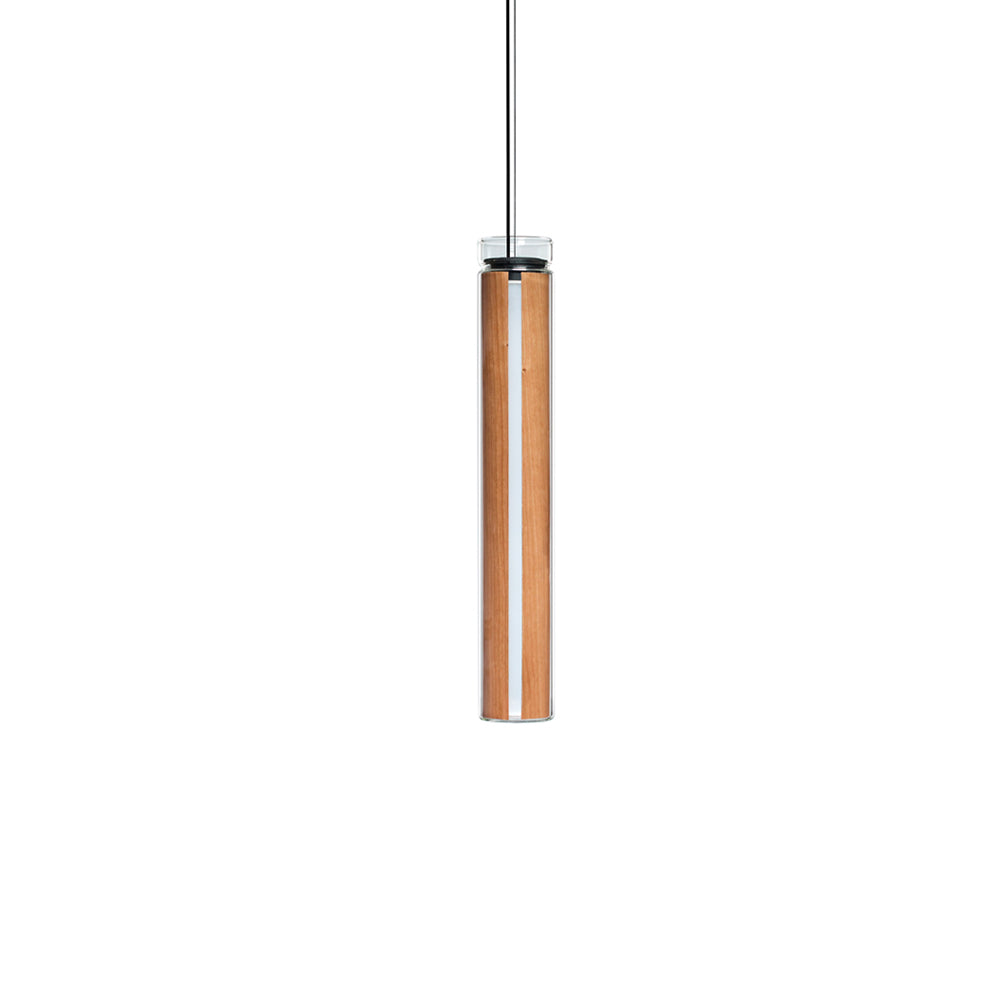 The Estela Suspension Light - Vertical is a captivating capsule of light, composed of a clean, clear, single piece of borosilicate glass (hand-blown by the accomplished artisan Eduard Garuti) enveloping a cylinder-like wood veneer diffuser. The wood veneer houses a dimmable LED light source and a straight opening on one side emits sideward light that is softened by the glass. Estela can also be used together with the Dune suspension light to create alternating design solutions.