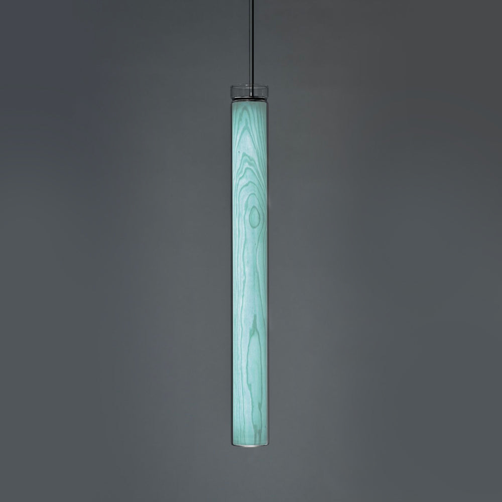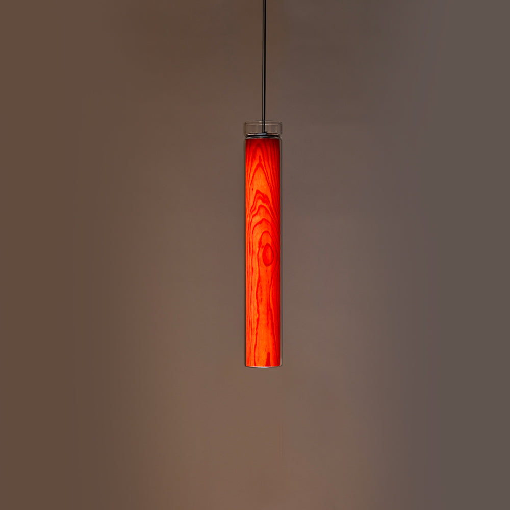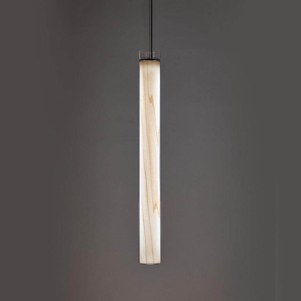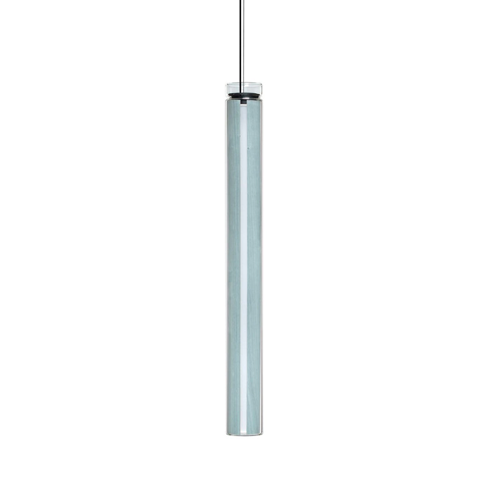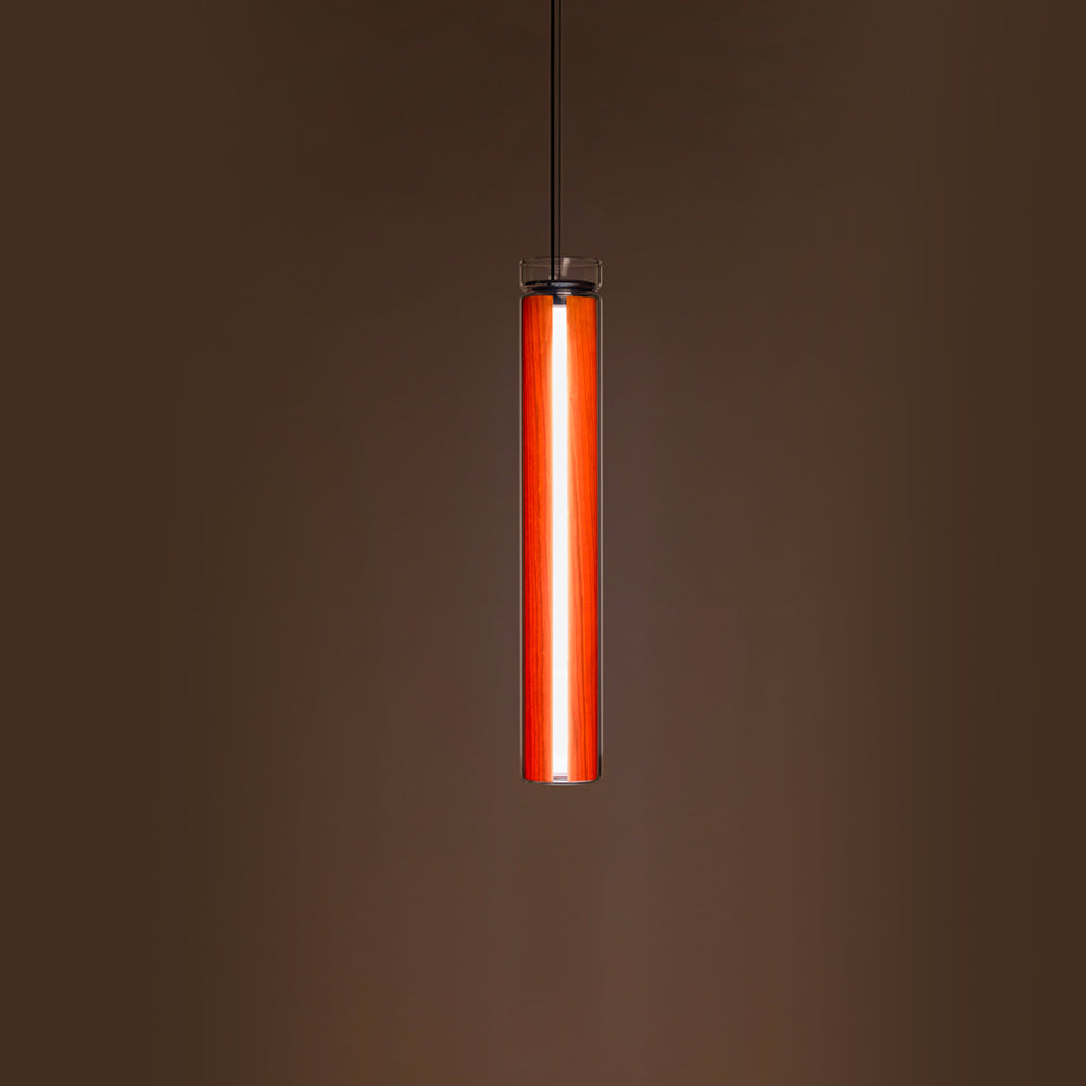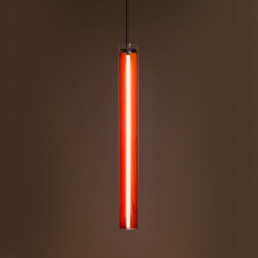 The Estela Suspension Light - Vertical is a captivating capsule of light, composed of a clean, clear, single piece of borosilicate glass (hand-blown by the accomplished artisan Eduard Garuti) enveloping a cylinder-like wood veneer diffuser. The wood veneer houses a dimmable LED light source and a straight opening on one side emits sideward light that is softened by the glass. Estela can also be used together with the Dune suspension light to create alternating design solutions.