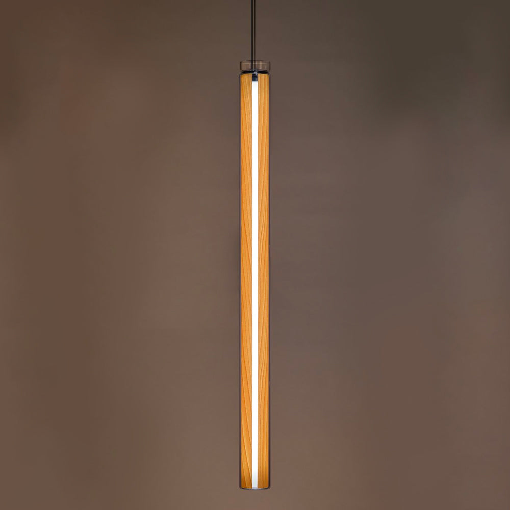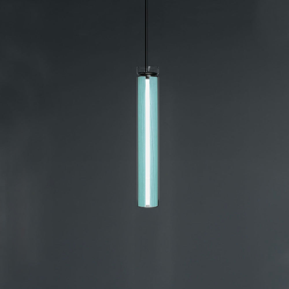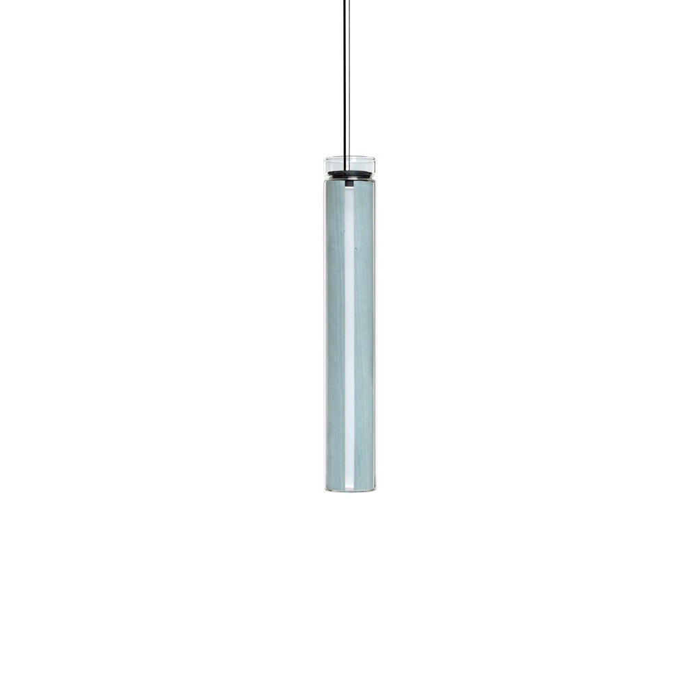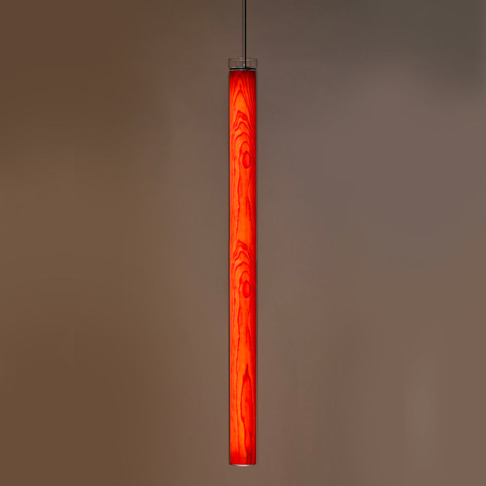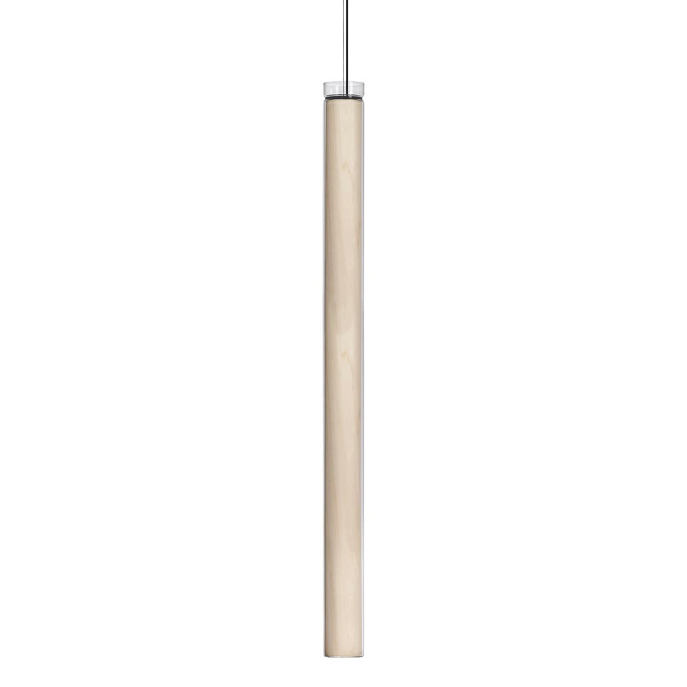 The Estela Suspension Light - Vertical is a captivating capsule of light, composed of a clean, clear, single piece of borosilicate glass (hand-blown by the accomplished artisan Eduard Garuti) enveloping a cylinder-like wood veneer diffuser. The wood veneer houses a dimmable LED light source and a straight opening on one side emits sideward light that is softened by the glass. Estela can also be used together with the Dune suspension light to create alternating design solutions.