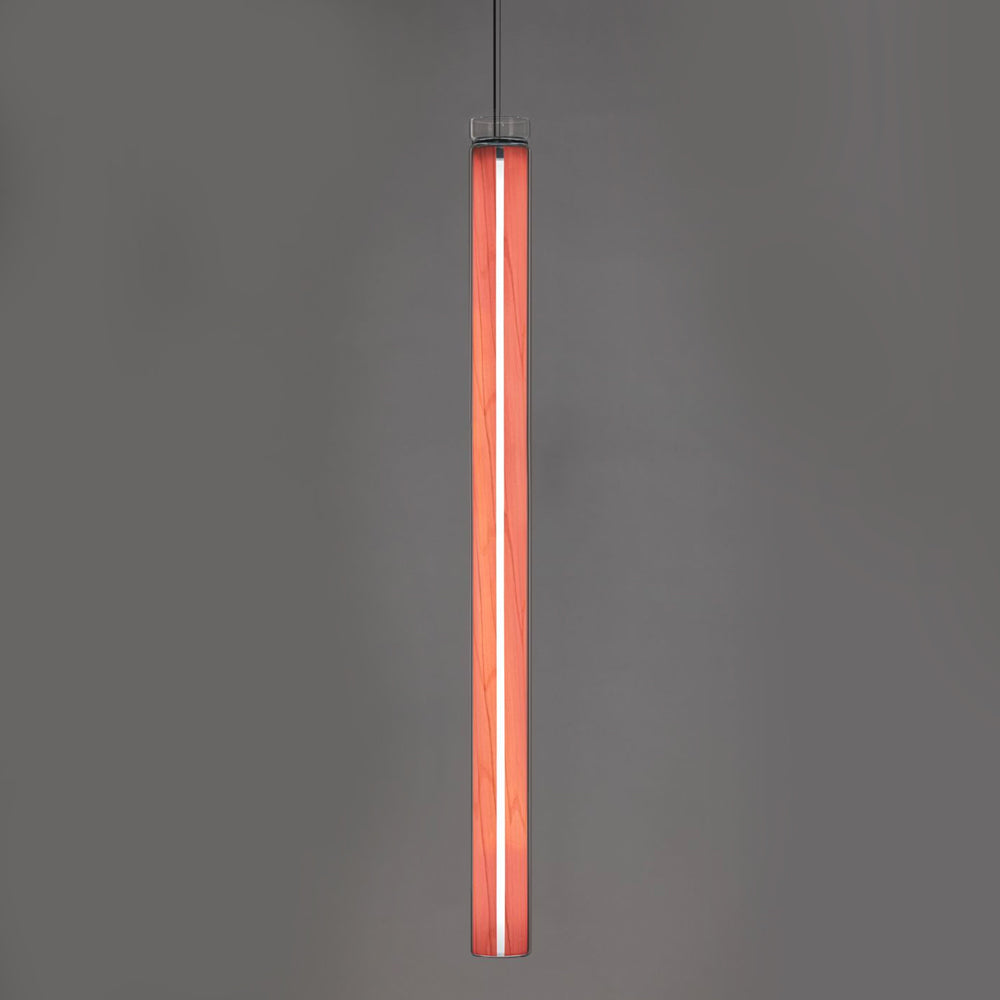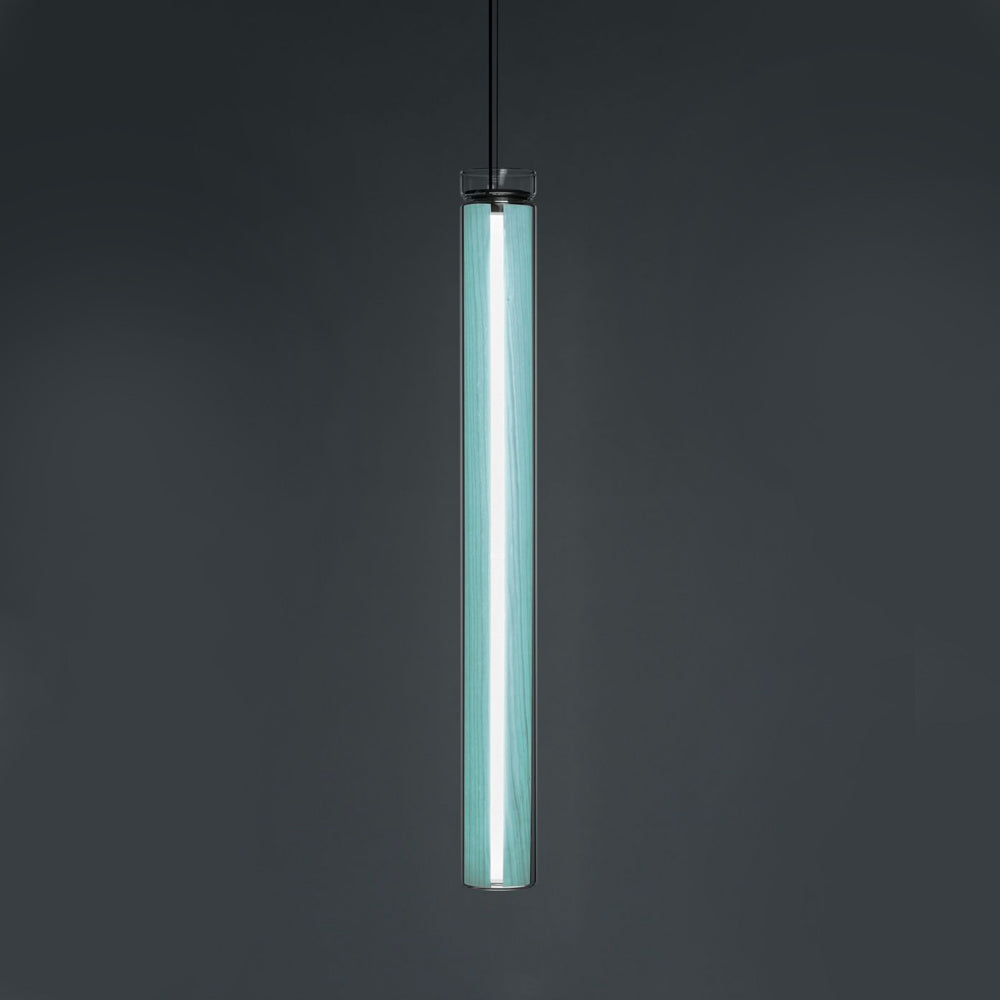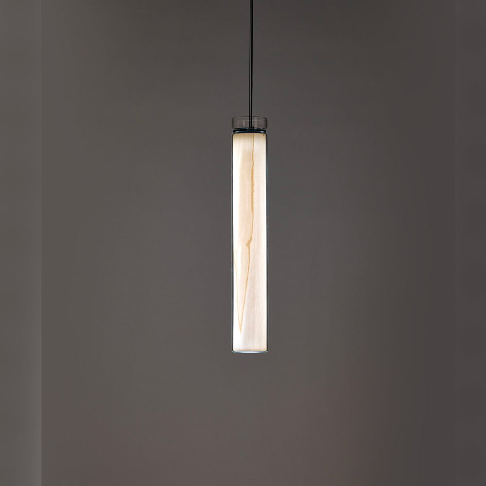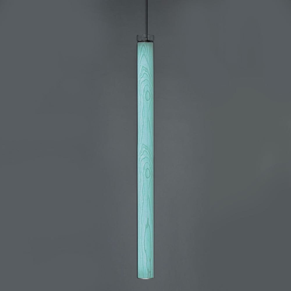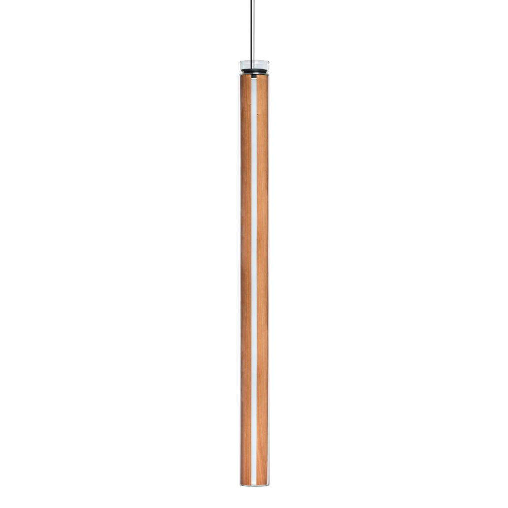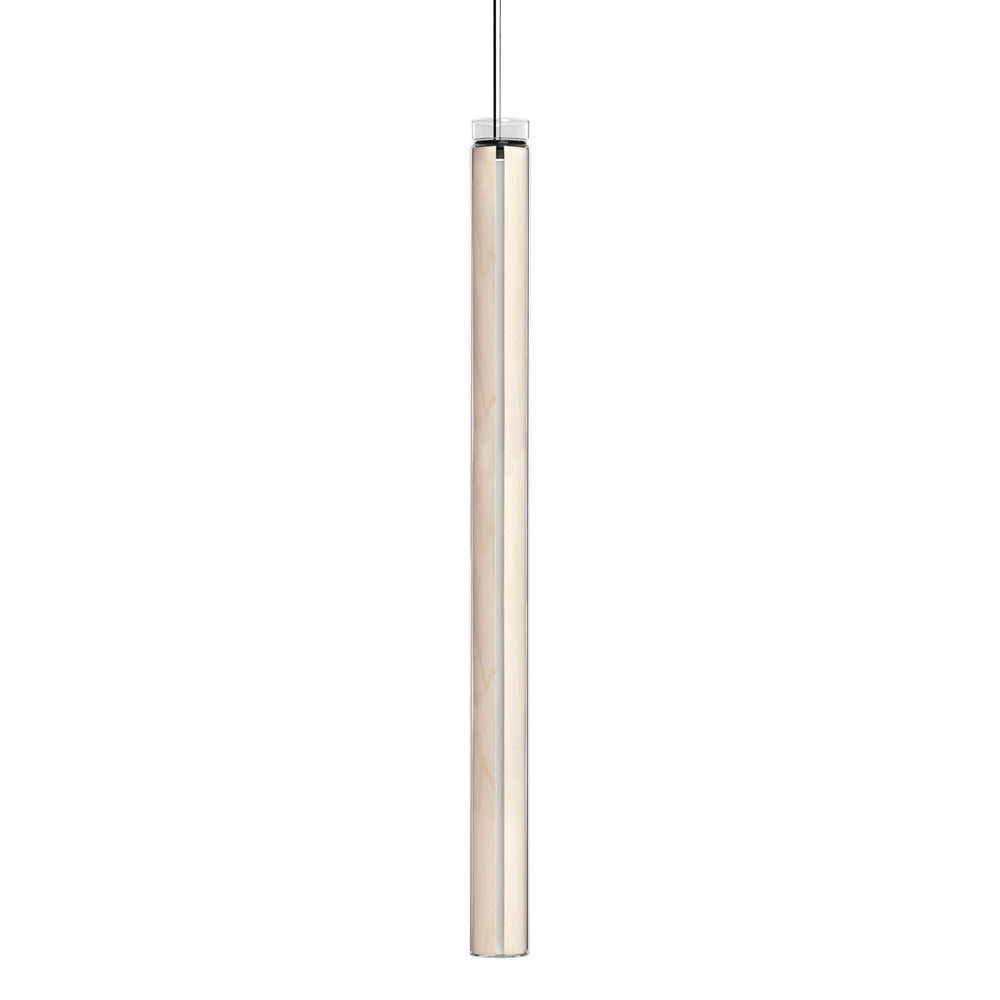 The Estela Suspension Light - Vertical is a captivating capsule of light, composed of a clean, clear, single piece of borosilicate glass (hand-blown by the accomplished artisan Eduard Garuti) enveloping a cylinder-like wood veneer diffuser. The wood veneer houses a dimmable LED light source and a straight opening on one side emits sideward light that is softened by the glass. Estela can also be used together with the Dune suspension light to create alternating design solutions.