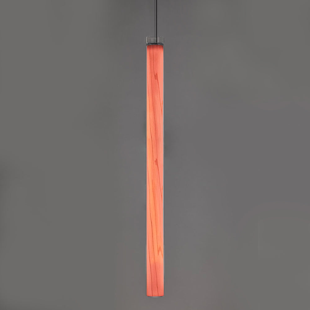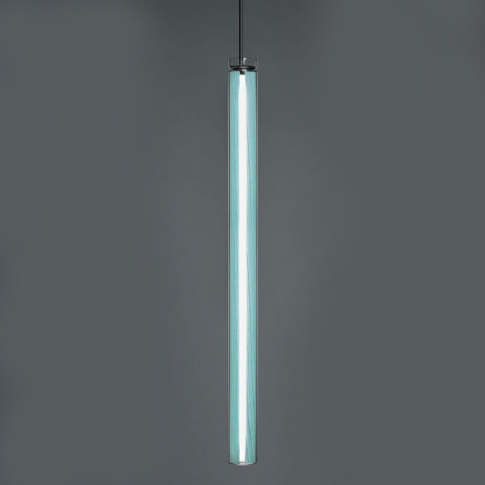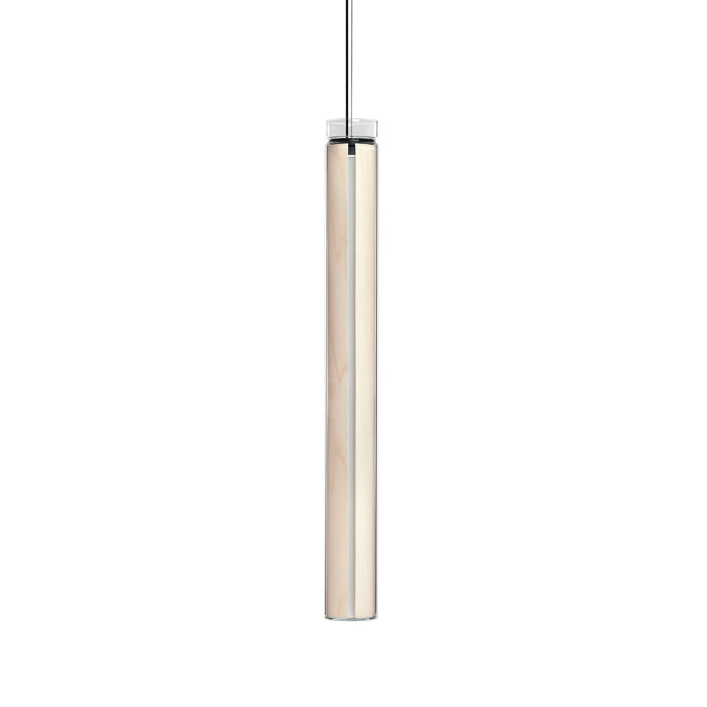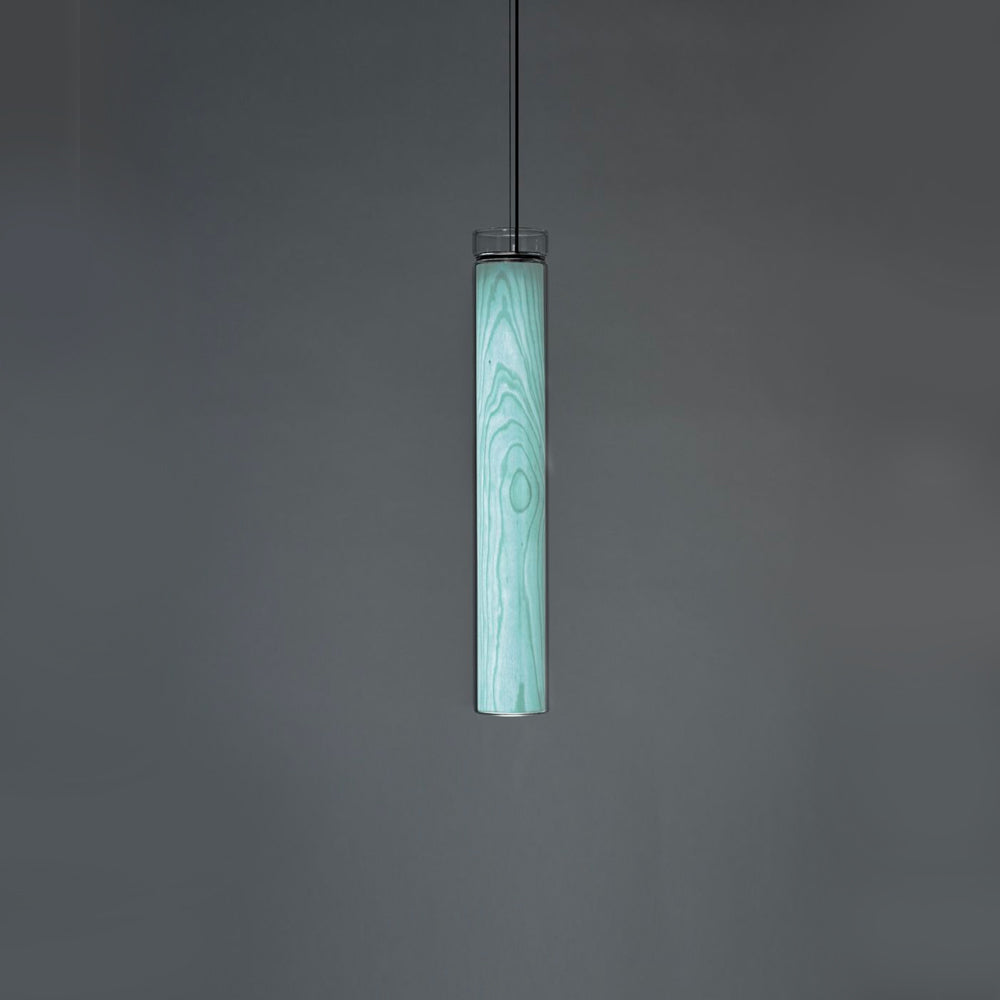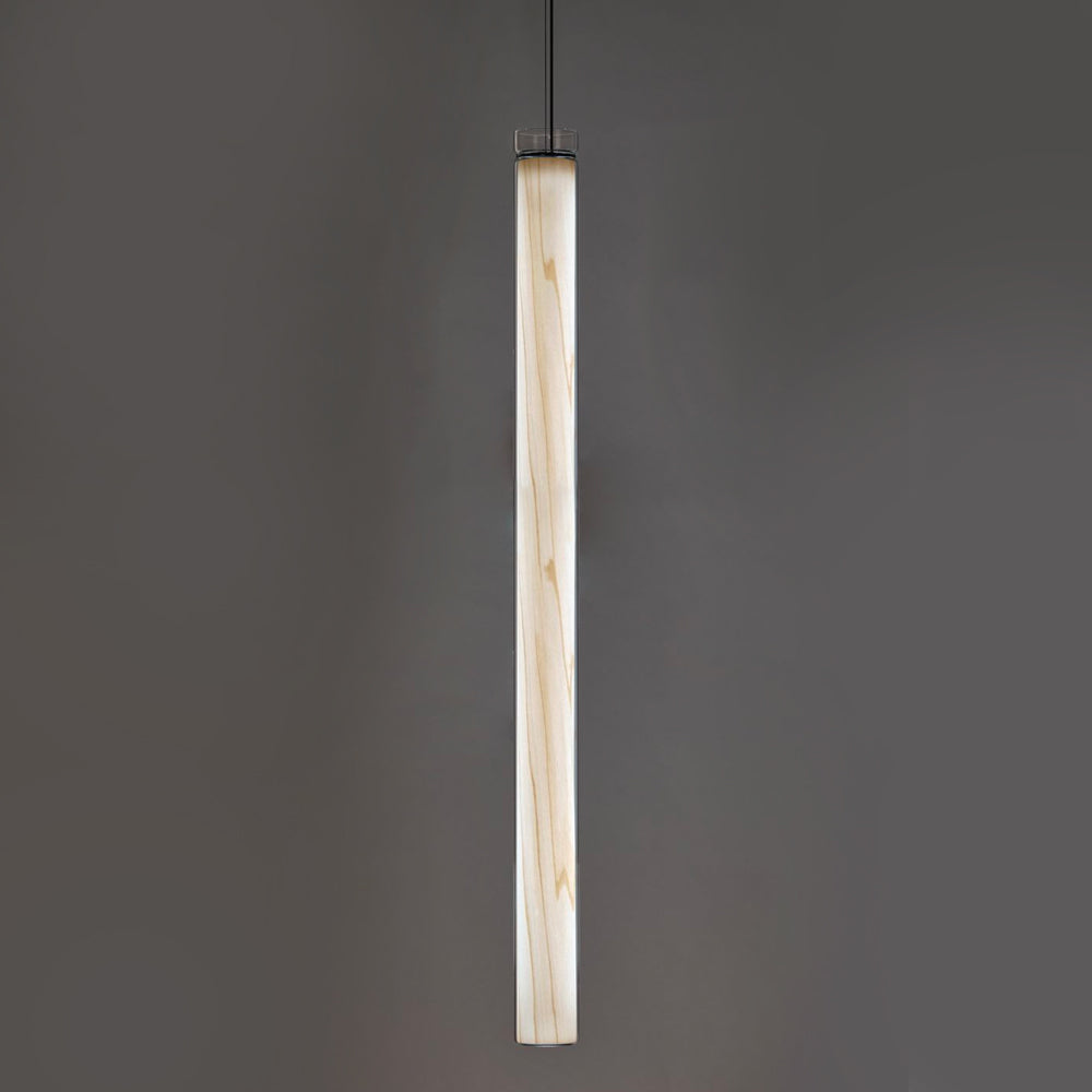 The Estela Suspension Light - Vertical is a captivating capsule of light, composed of a clean, clear, single piece of borosilicate glass (hand-blown by the accomplished artisan Eduard Garuti) enveloping a cylinder-like wood veneer diffuser. The wood veneer houses a dimmable LED light source and a straight opening on one side emits sideward light that is softened by the glass. Estela can also be used together with the Dune suspension light to create alternating design solutions.