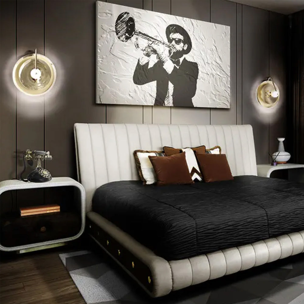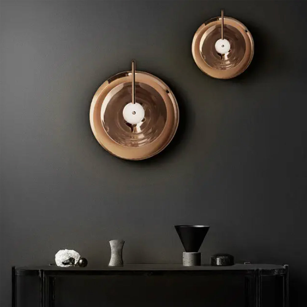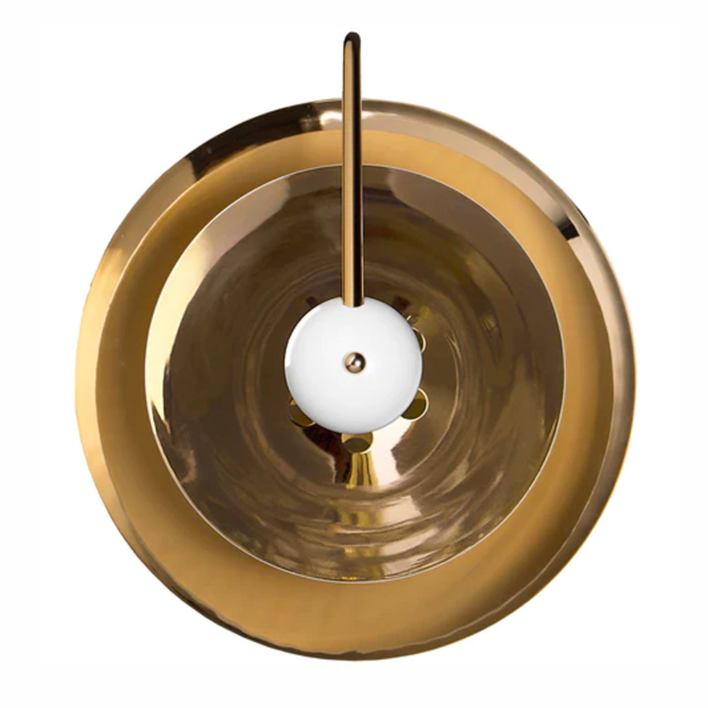 The Basie Wall Light is a modern representation of the sci-fi aesthetics of the 1960s. Basie is an indoor wall light handmade in brass, with a central shade made in aluminium and a mesmerising gold-plated finish. The lamp shade is lacquered a glossy white for a more modern look.