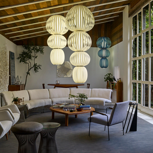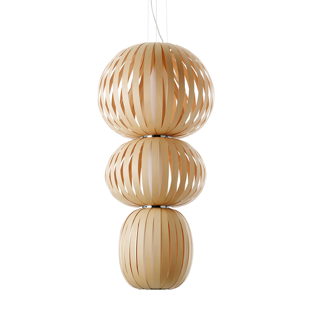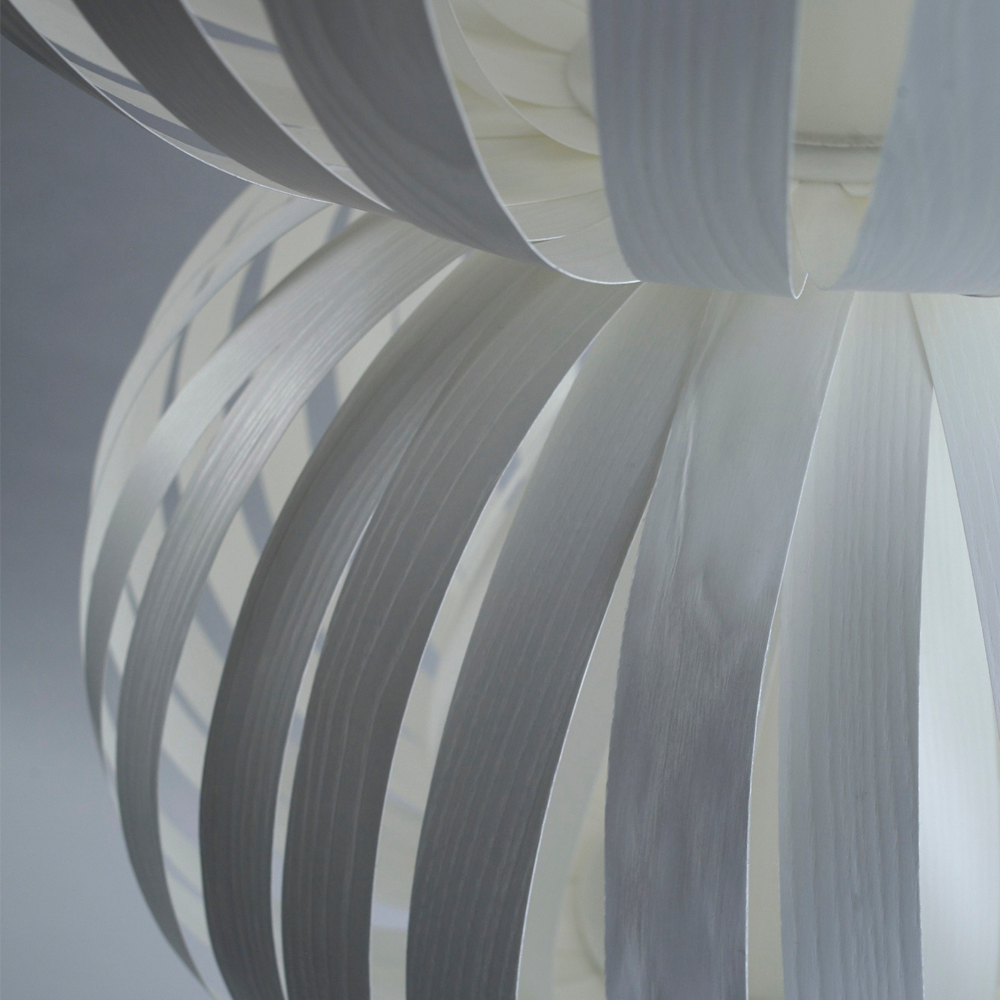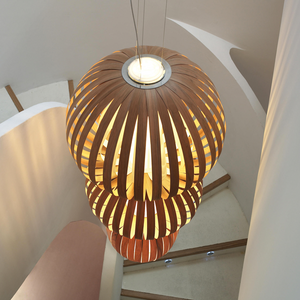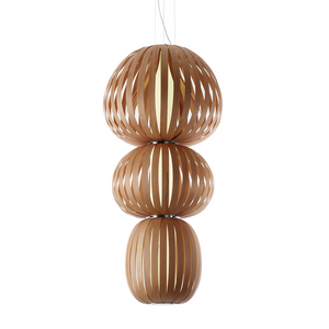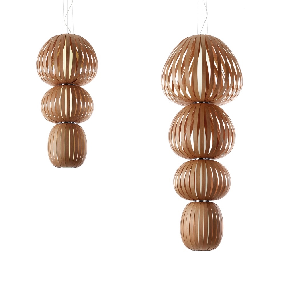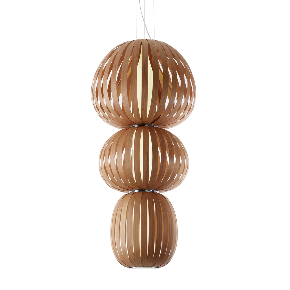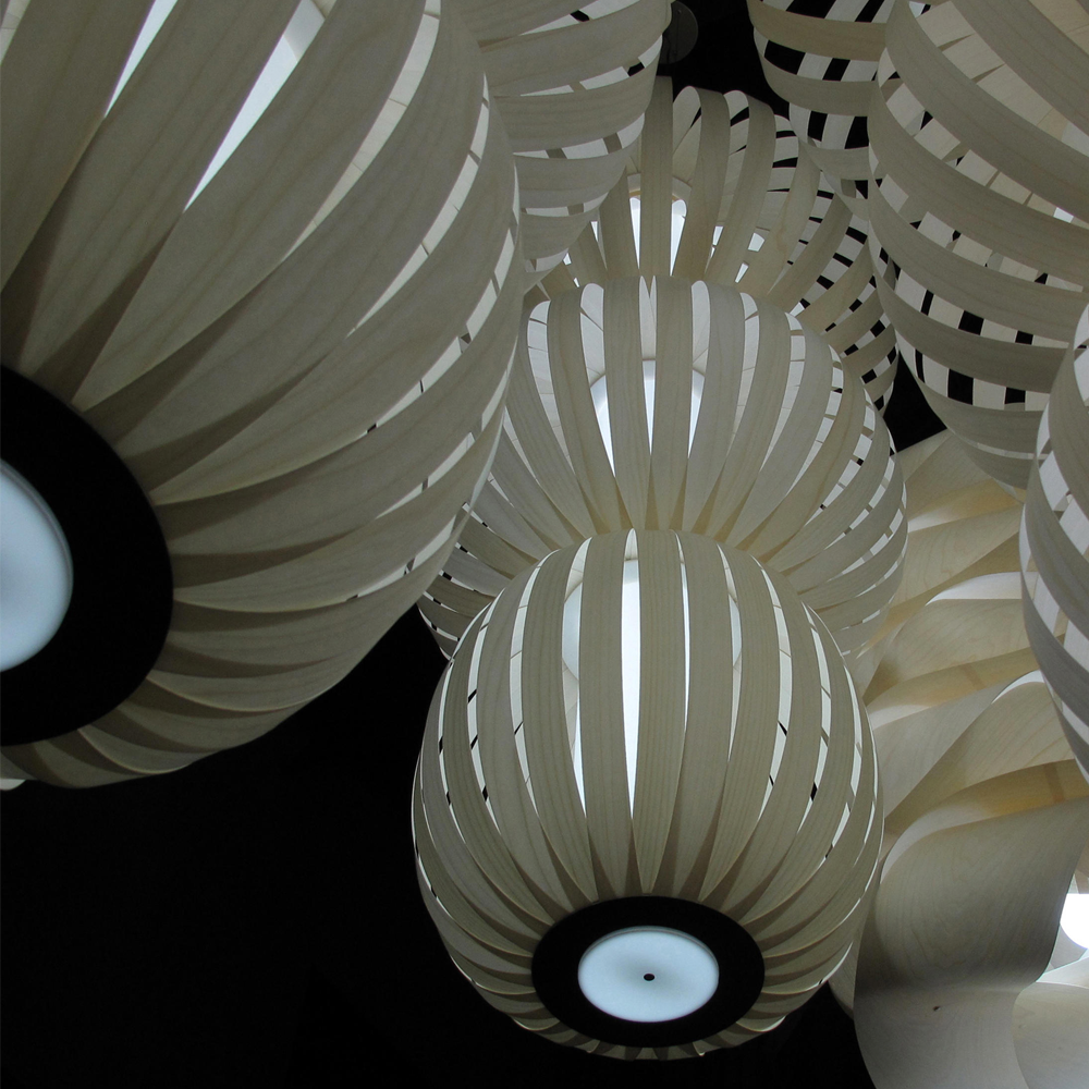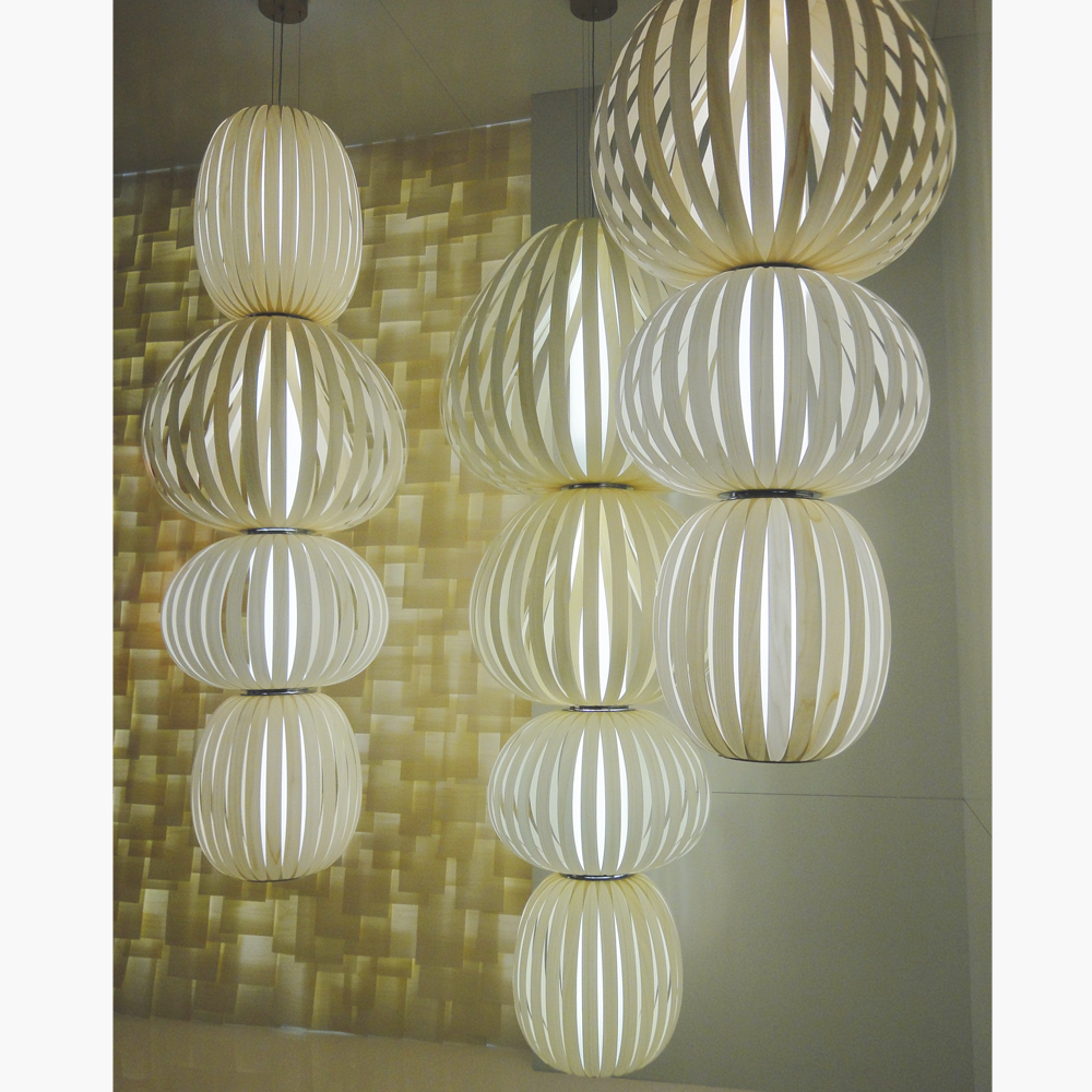 The Totem is an ensemble of wood veneer strips, where the small gaps between each strip allow the light to diffuse through. Various Poppy and Pod lights are combined together achieving monumental proportions.