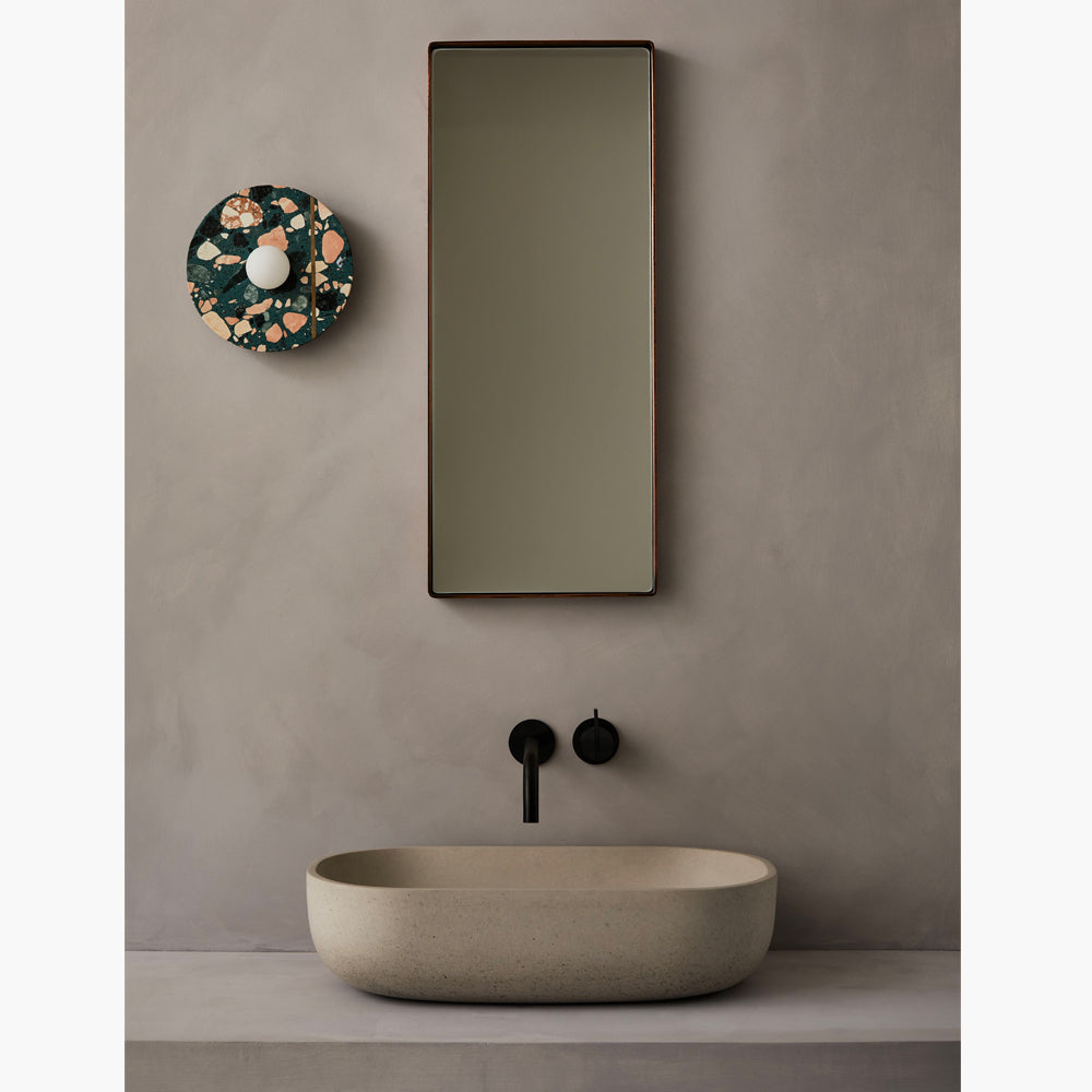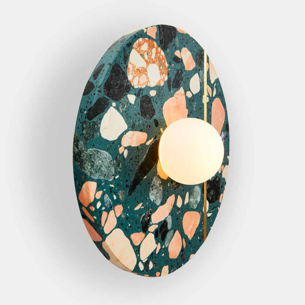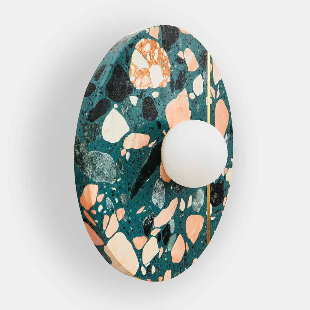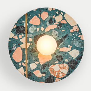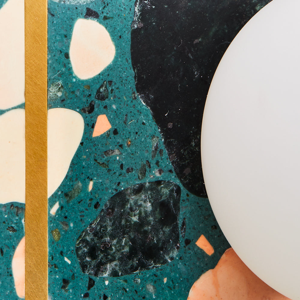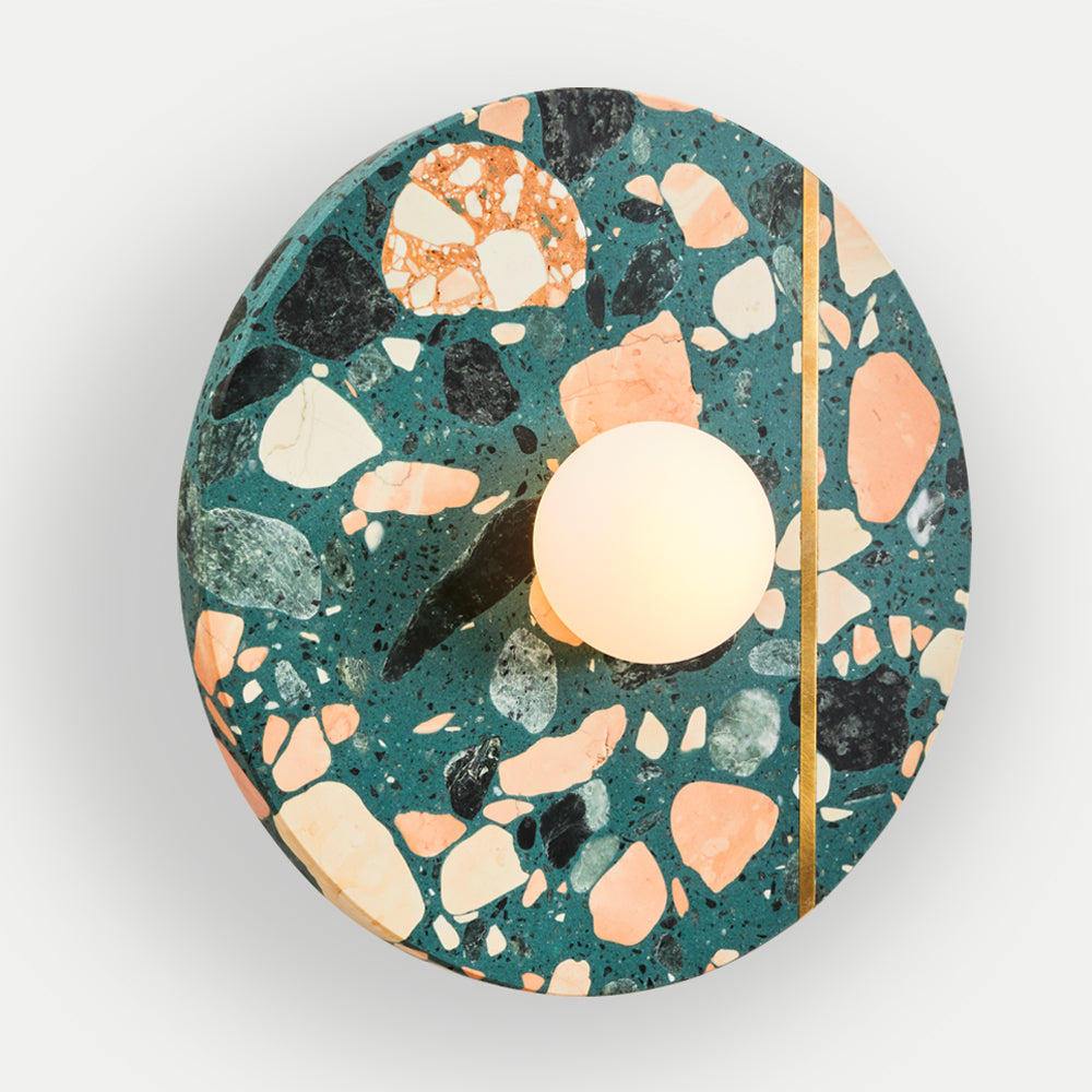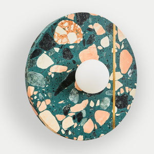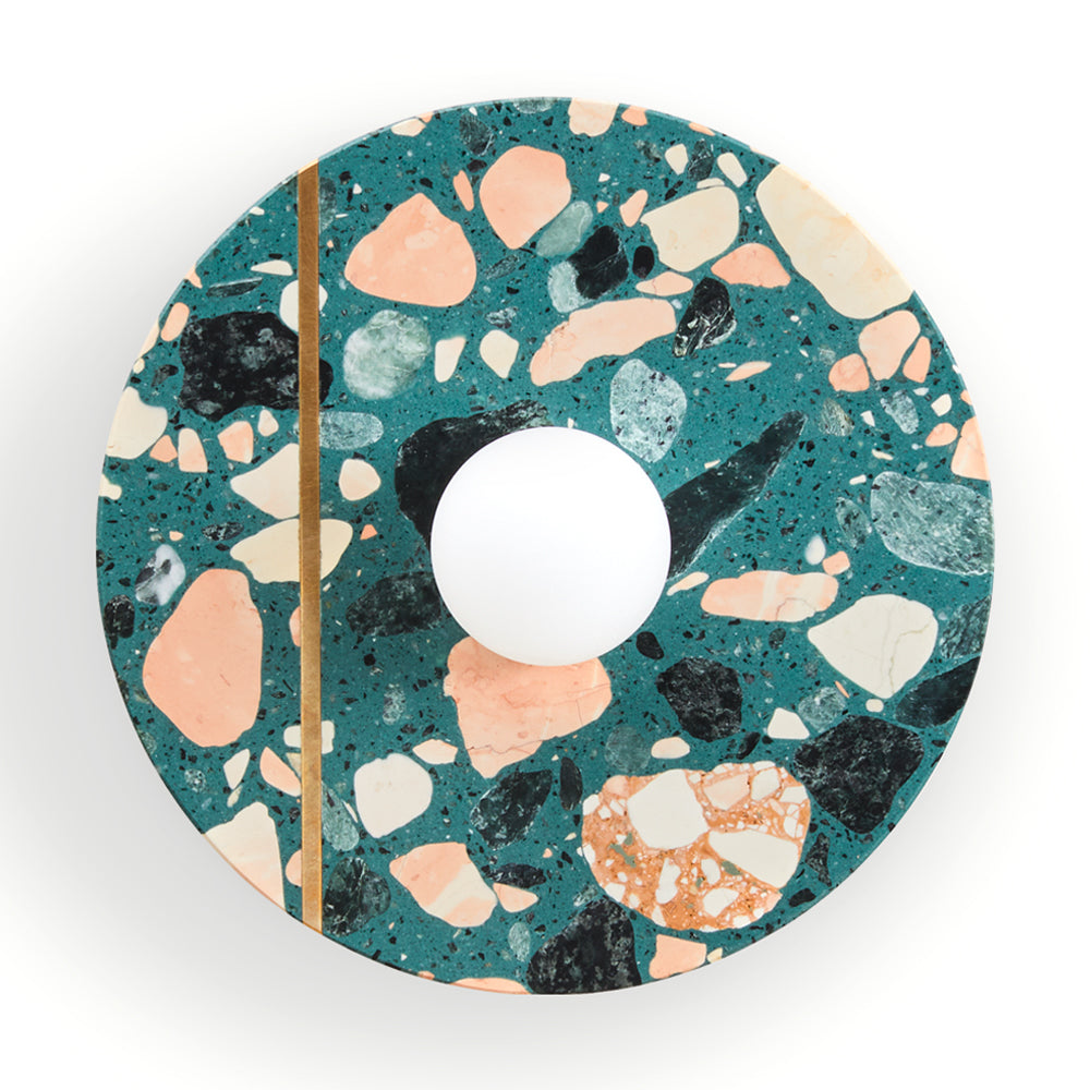 Palladio Brass Wall Light is a beautifully elegant wall light. The design is a tribute to the famous Venetian renaissance architect and is inspired by his Villa La Rotonda, where cosmic forces are believed to flow with a light that is always warm and that transforms its surroundings. This classic design features an ample solid circle of terrazzo in perfect proportion with an opal glass shade, with an inset unlacquered brass strip that patinas beautifully over time. The terrazzo is available in a range of colourful finishes, offering multiple possibilities for customisation.