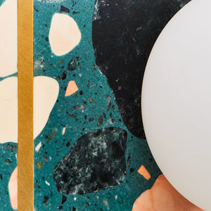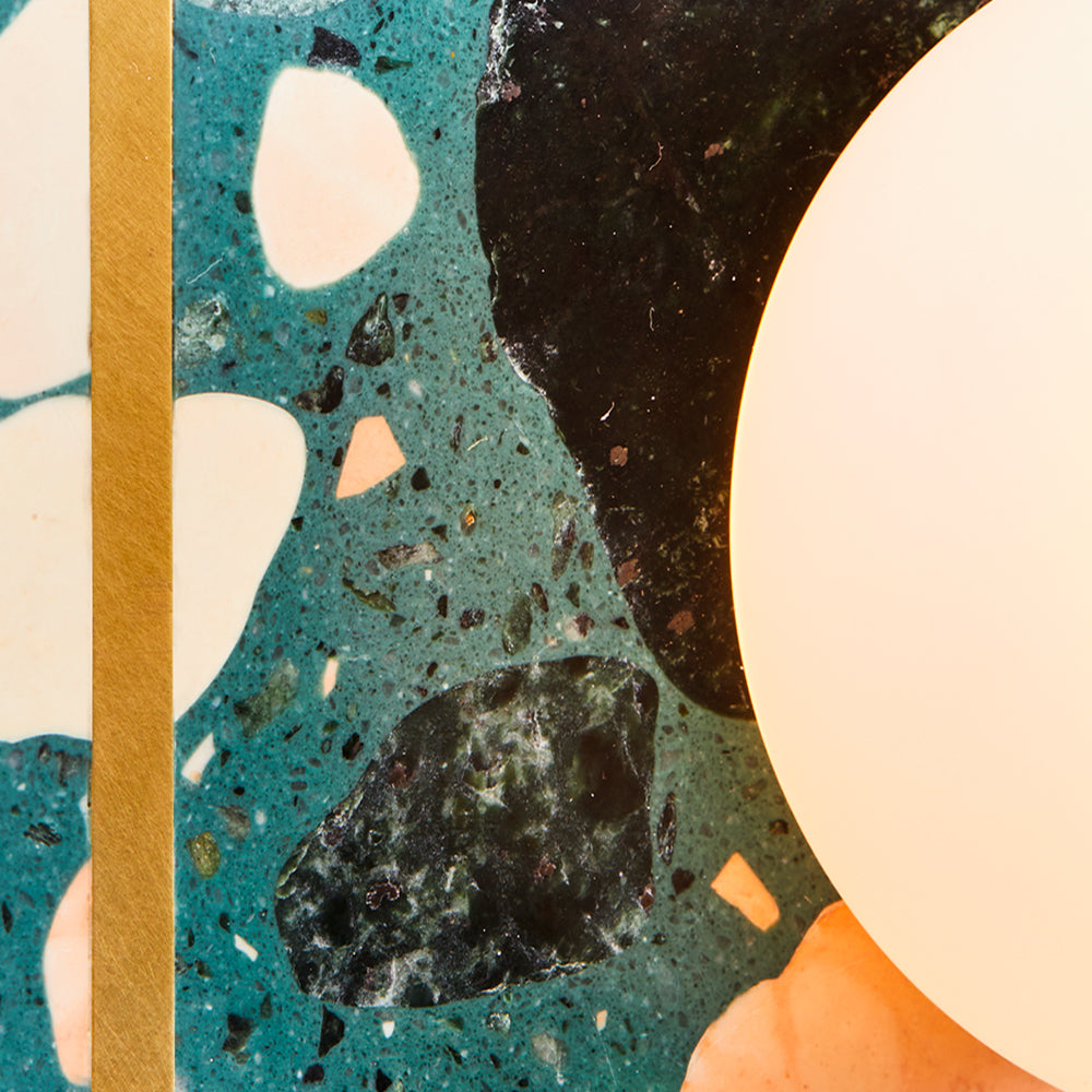 Materials: base: terrazzo in Rosa, black and green finishes with brass inset (unlacquered); metal structure: aluminium in black or white; shades: opal glass