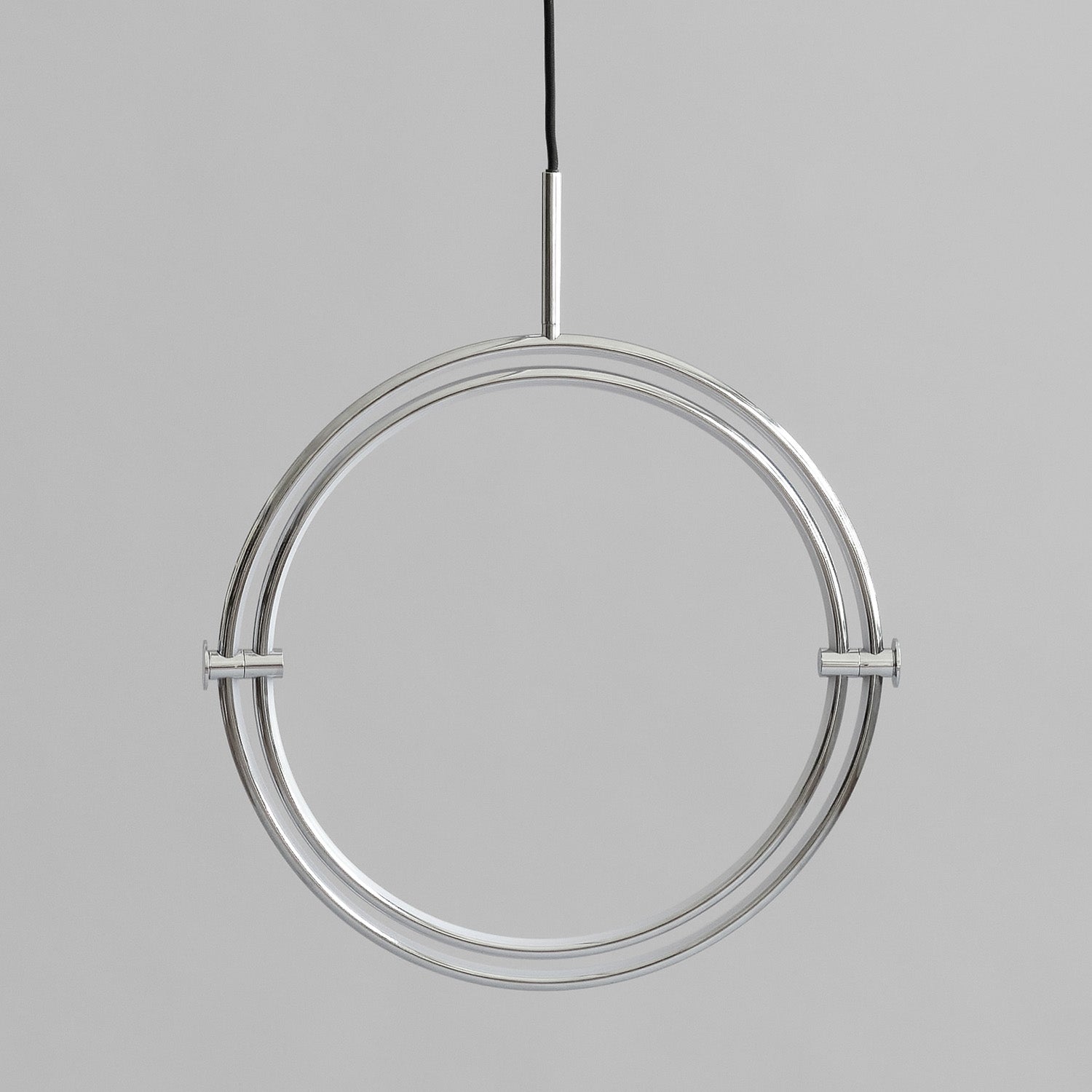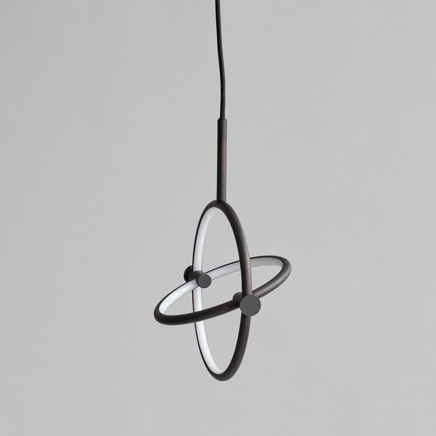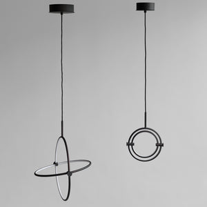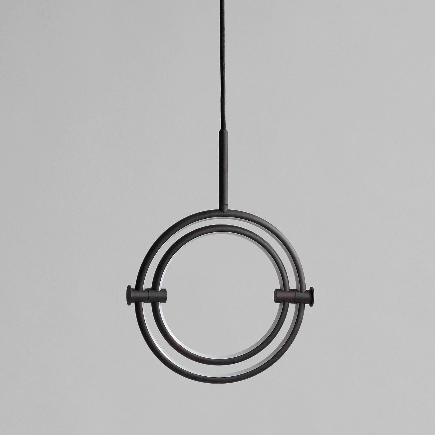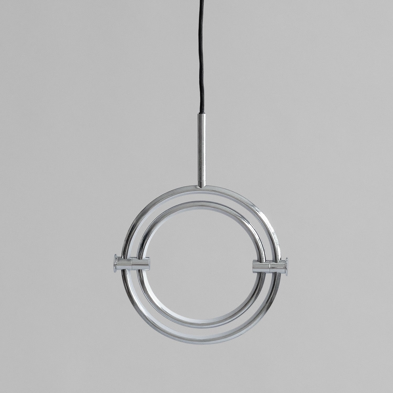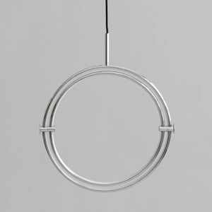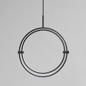 Named after the Japanese word for circle or circumference, Maru has a striking geometric design inspired by Minimalism art. Maru showcases two meticulously crafted aluminum circles, each fitted with a warm LED light which illuminates the inner part of the circle. A moveable joint on each side of the circles enables the inner circle to turn around inside the outer one, adding a layer of flexibility to the pendant. Maru is available in three finishes - burned black, chrome or brass - and three sizes - large, medium or mini.