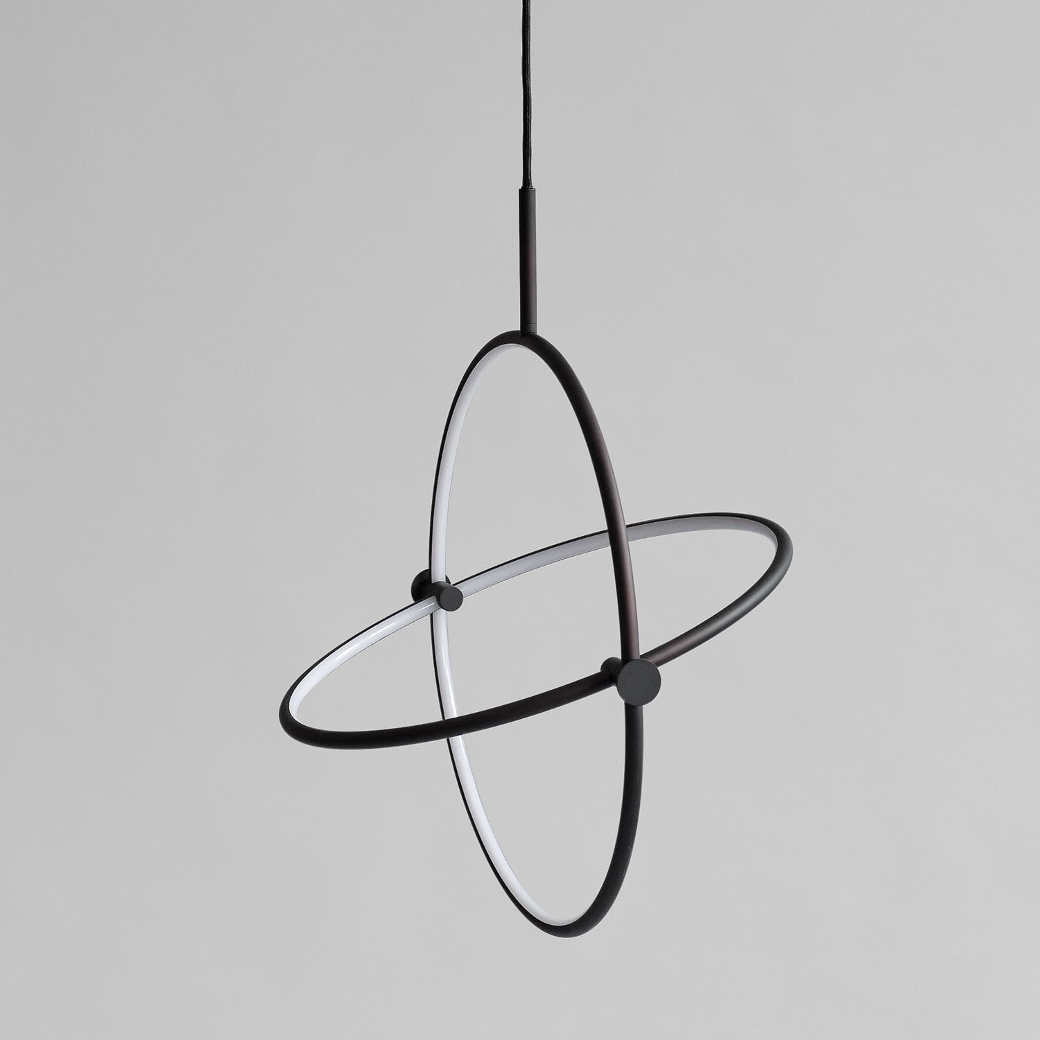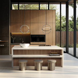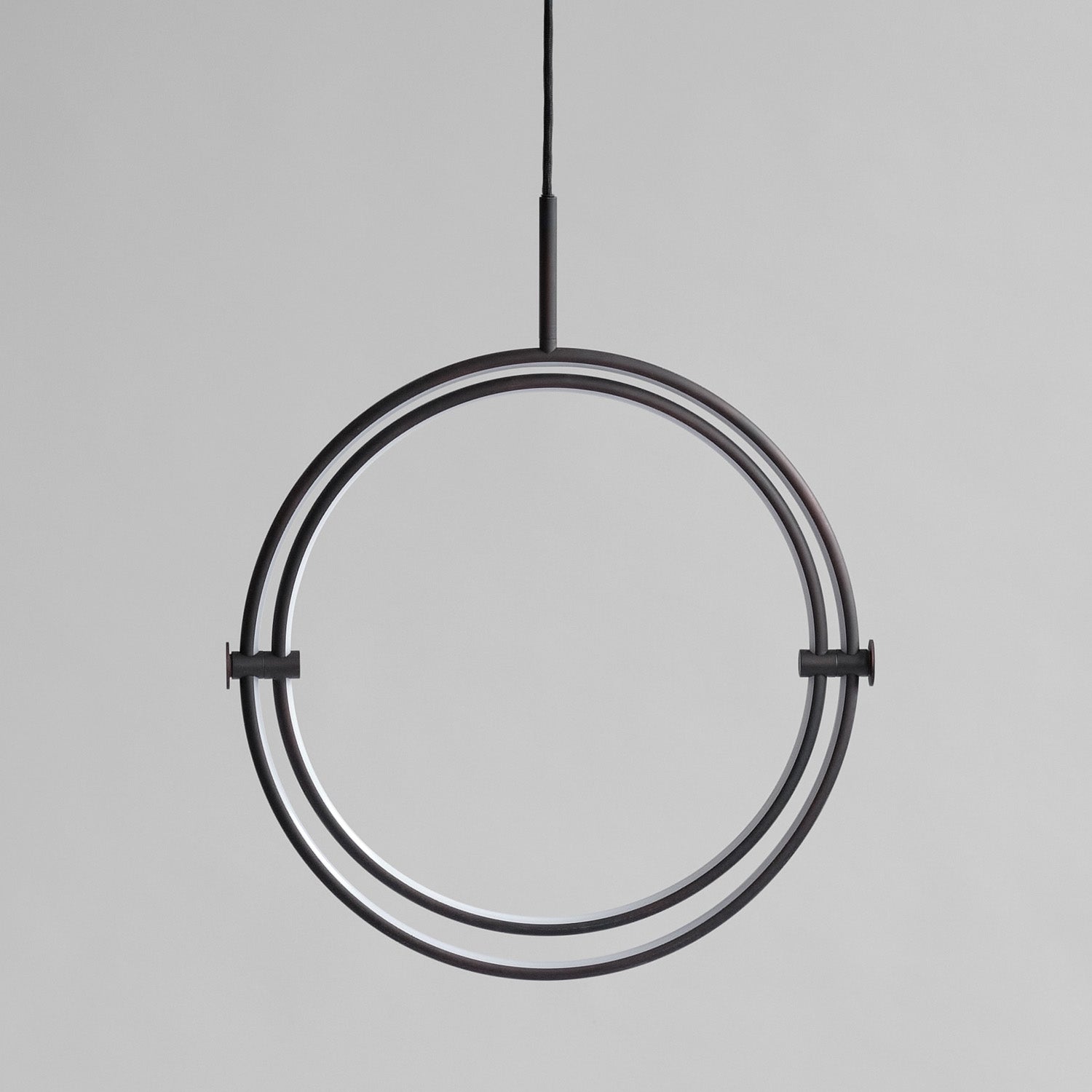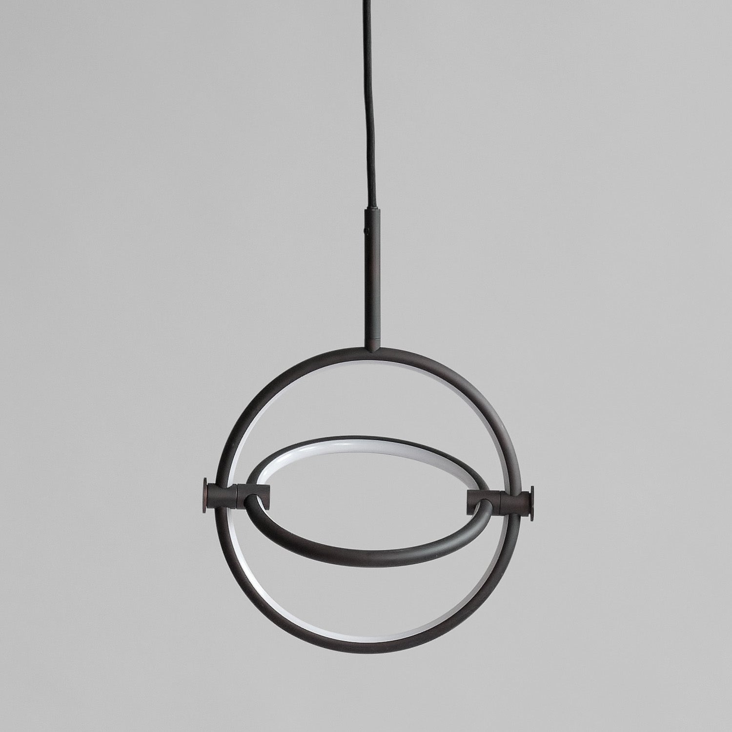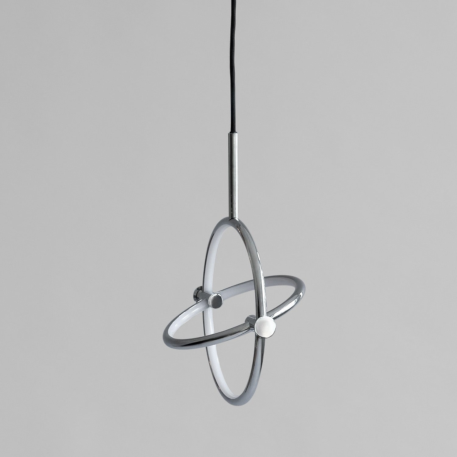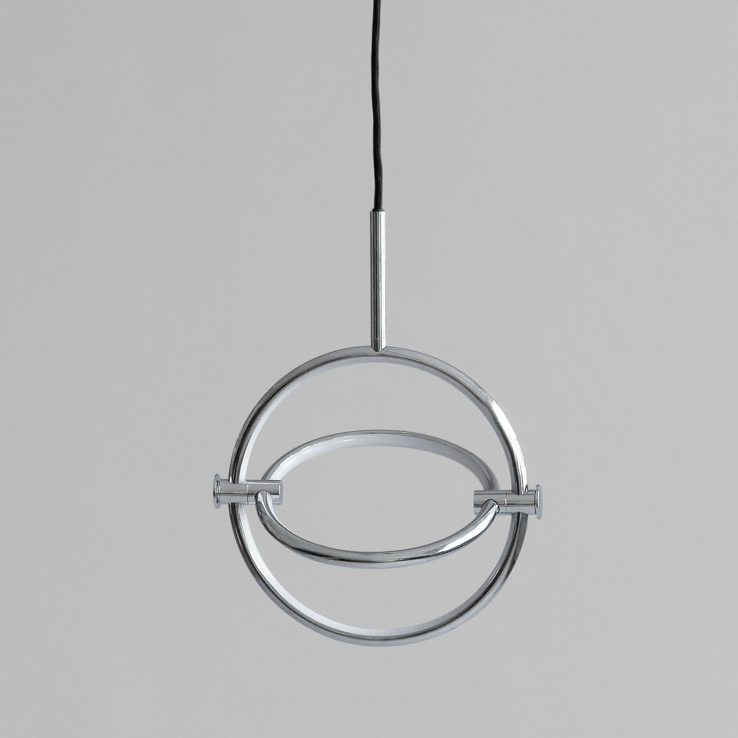 Named after the Japanese word for circle or circumference, Maru has a striking geometric design inspired by Minimalism art. Maru showcases two meticulously crafted aluminum circles, each fitted with a warm LED light which illuminates the inner part of the circle. A moveable joint on each side of the circles enables the inner circle to turn around inside the outer one, adding a layer of flexibility to the pendant. Maru is available in three finishes - burned black, chrome or brass - and three sizes - large, medium or mini.