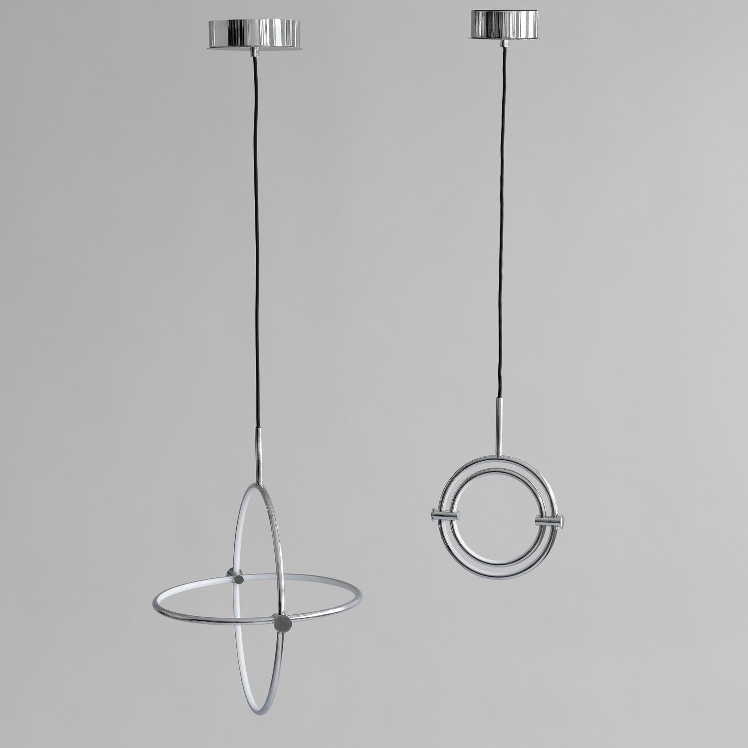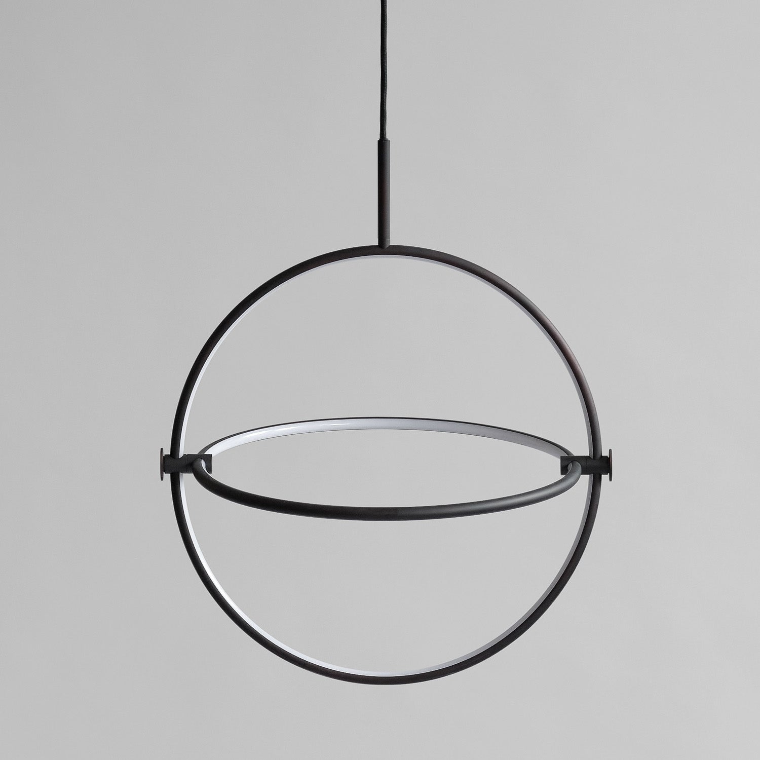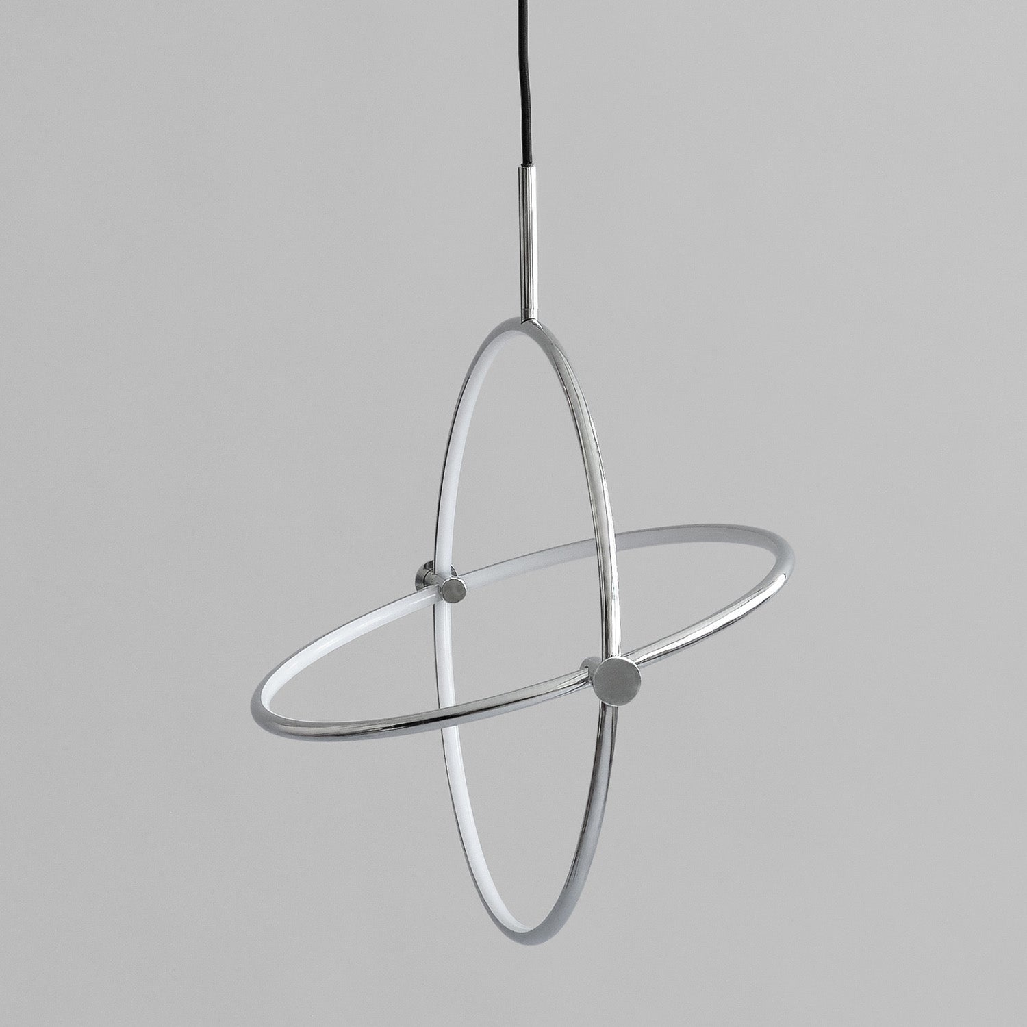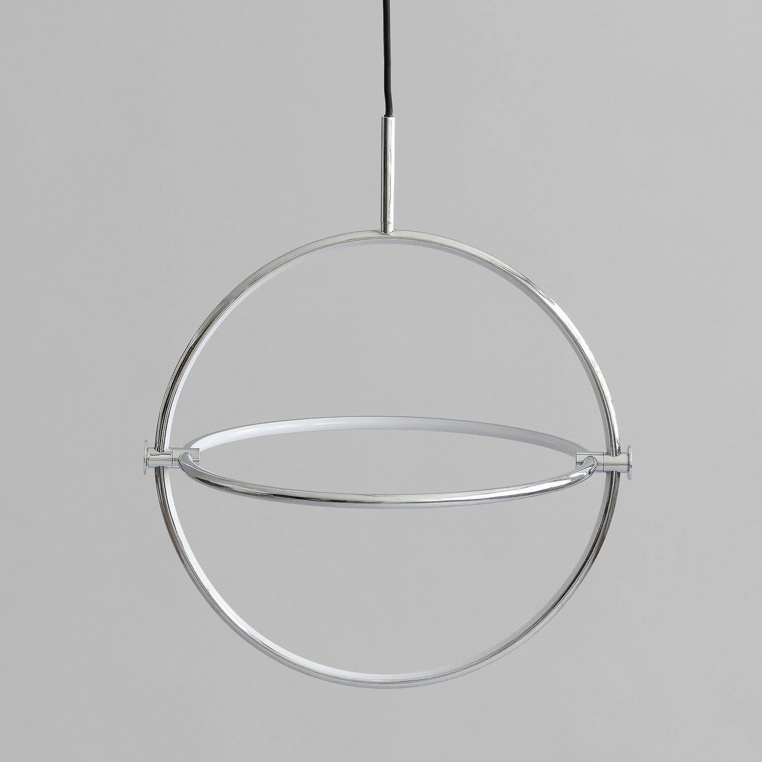 Named after the Japanese word for circle or circumference, Maru has a striking geometric design inspired by Minimalism art. Maru showcases two meticulously crafted aluminum circles, each fitted with a warm LED light which illuminates the inner part of the circle. A moveable joint on each side of the circles enables the inner circle to turn around inside the outer one, adding a layer of flexibility to the pendant. Maru is available in three finishes - burned black, chrome or brass - and three sizes - large, medium or mini.