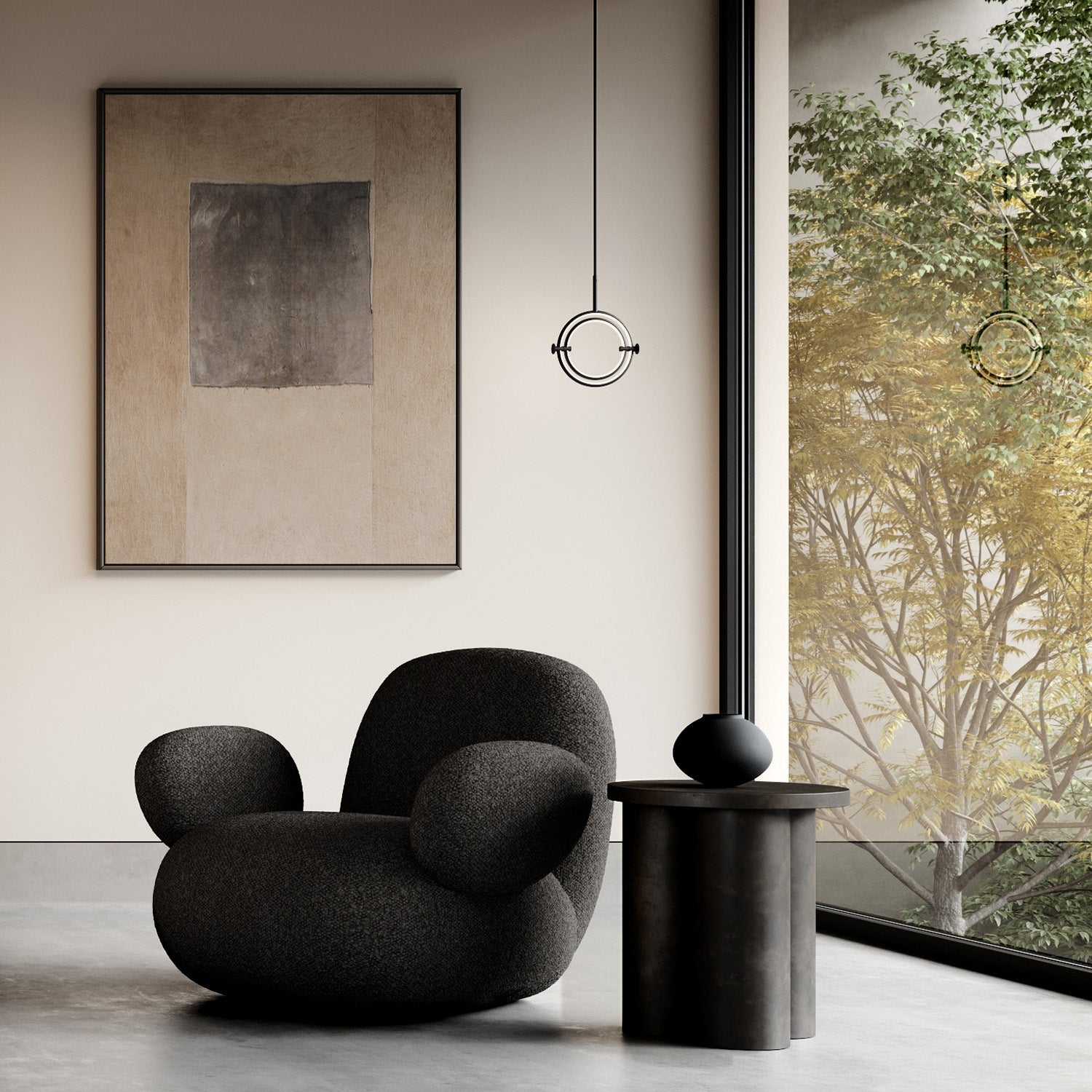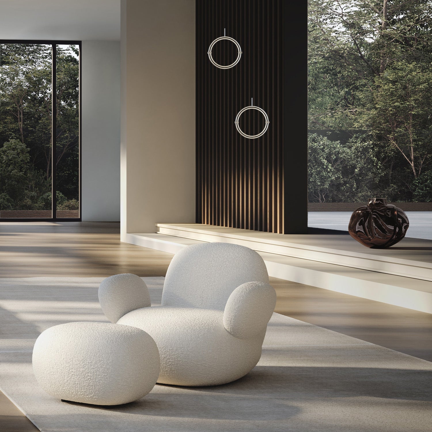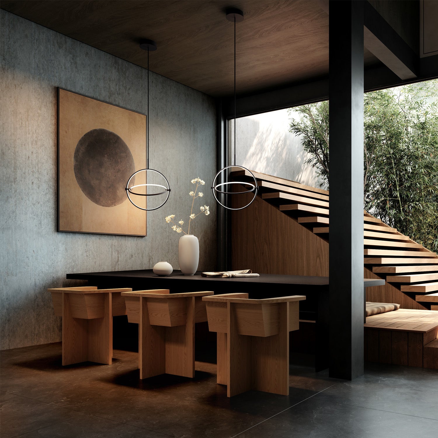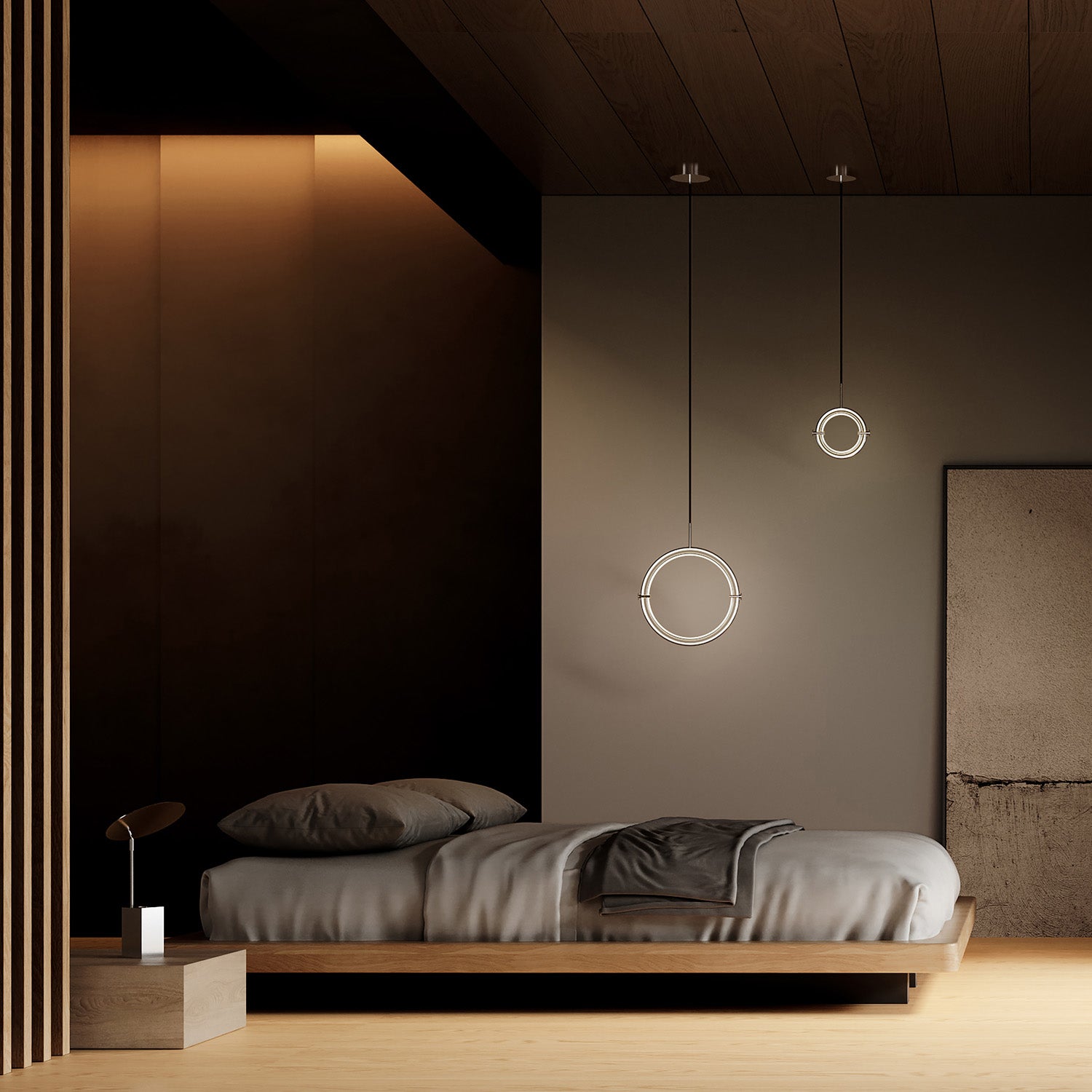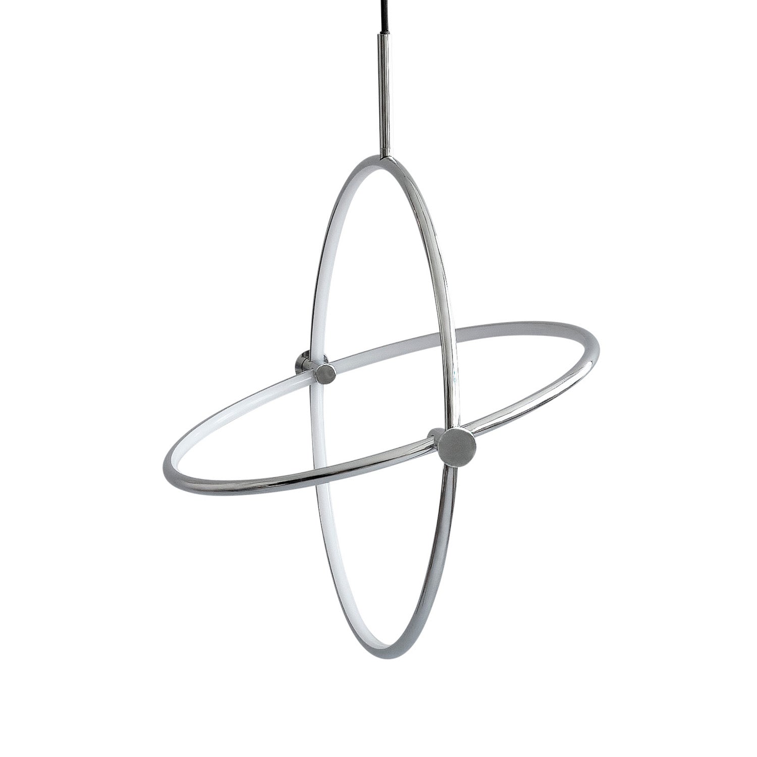Named after the Japanese word for circle or circumference, Maru has a striking geometric design inspired by Minimalism art. Maru showcases two meticulously crafted aluminum circles, each fitted with a warm LED light which illuminates the inner part of the circle. A moveable joint on each side of the circles enables the inner circle to turn around inside the outer one, adding a layer of flexibility to the pendant. Maru is available in three finishes - burned black, chrome or brass - and three sizes - large, medium or mini.