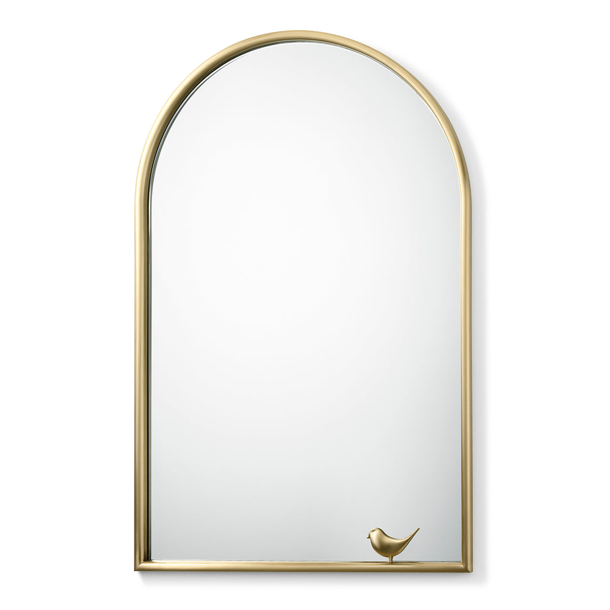 Portrait with Birdie is is inspired by classic Renaissance shapes, with the arch top and rounded brass frame around the mirror. Half of a small brass bird sits on the bottom of the frame, its other half reflected in the mirror, a decorative touch that is charming and poetic at the same time. The Portrait with Birdie works well for hallways or bathrooms and is a great way to add interest to a wall.