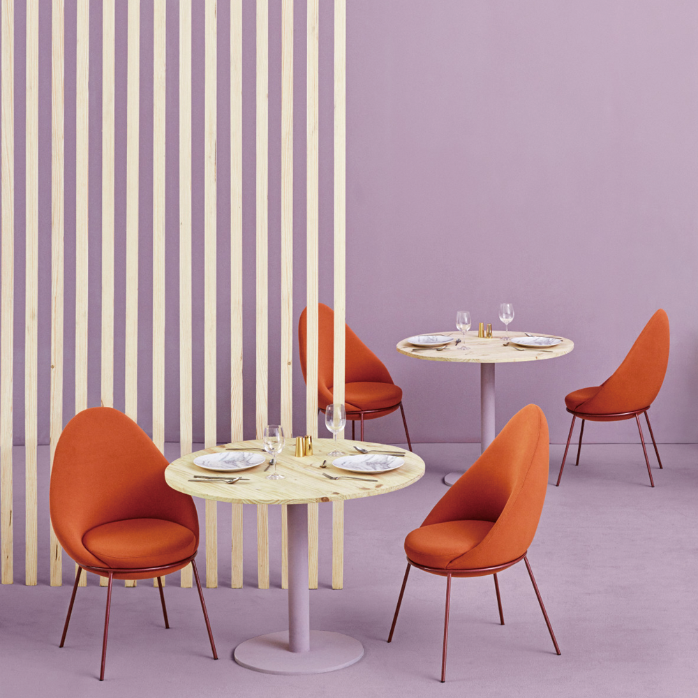 Materials & Finishes: pine wood and low density fibre board structure; legs: lacquered iron legs; upholstered seat top and back; seat and backrest: stuffed with UK approved polyurethane; the metal structure can be lacquered in a broad selection of colours or in a pink / copper chromed finish; it can also be lacquered in all standard RAL colours as well as special copper, golden and chrome colour finishes