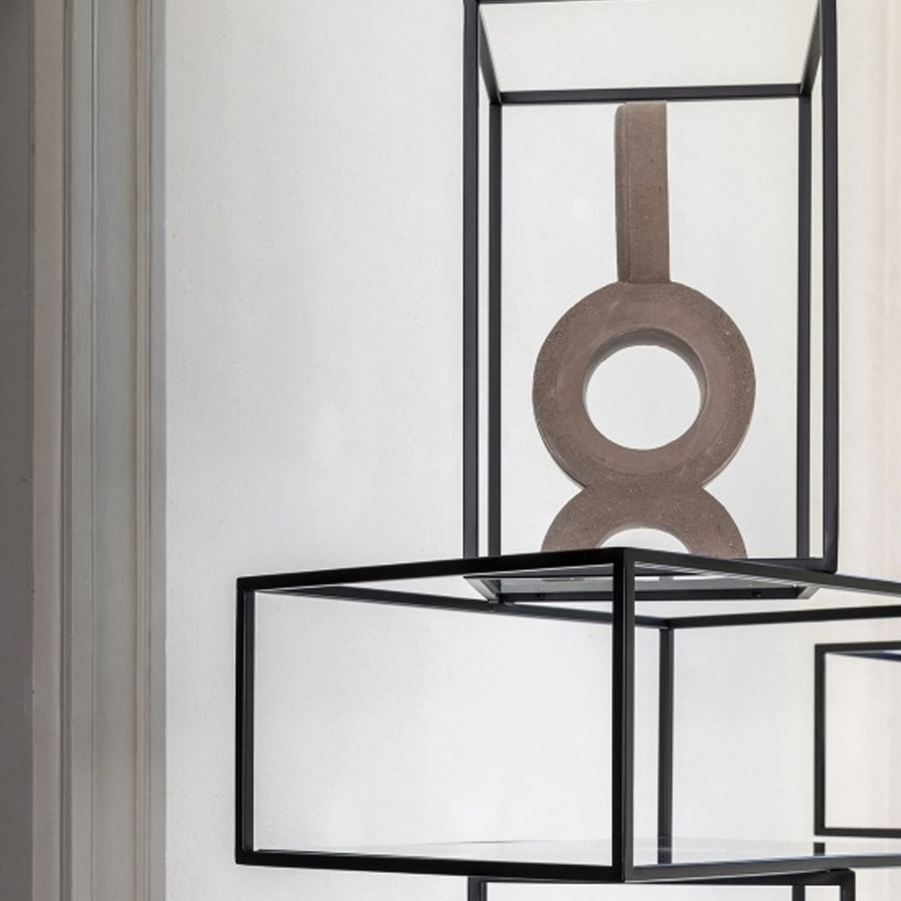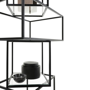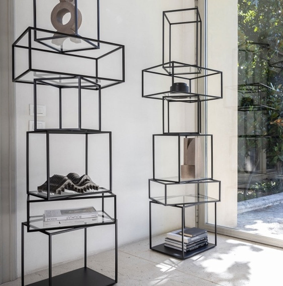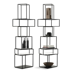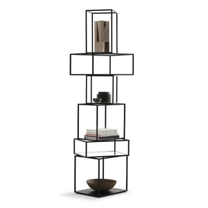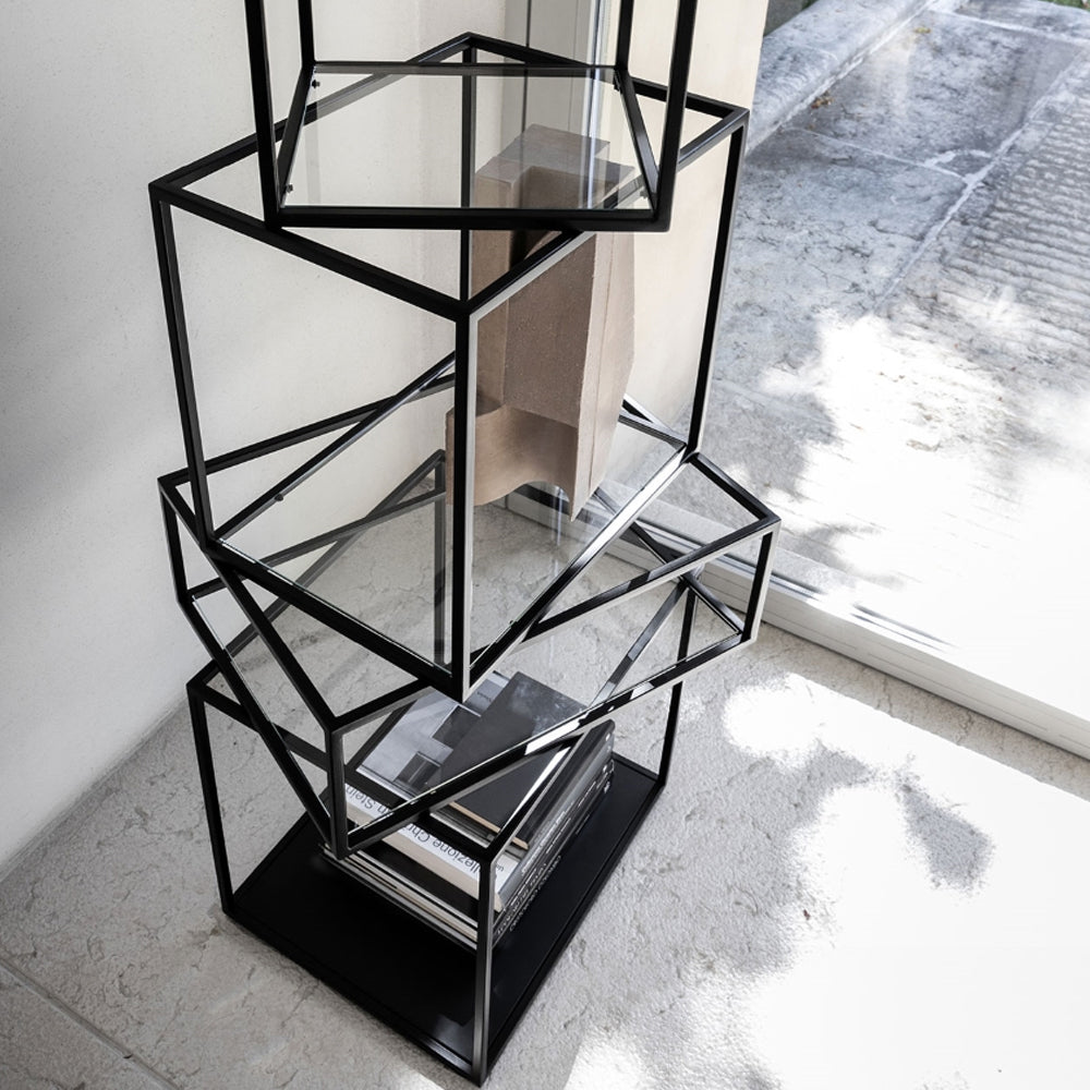 The Babylon Floor Shelves is a free standing open bookshelf in the form of six different transparent boxes stacked seemingly randomly on top of each other. The black metal frames and transparent glass shelves give Babylon a strong graphic look and create the illusion that objects placed within were floating in thin air. The Babylon Floor Shelves is perfect for showcasing decorative items in a sleek, minimalist interior.